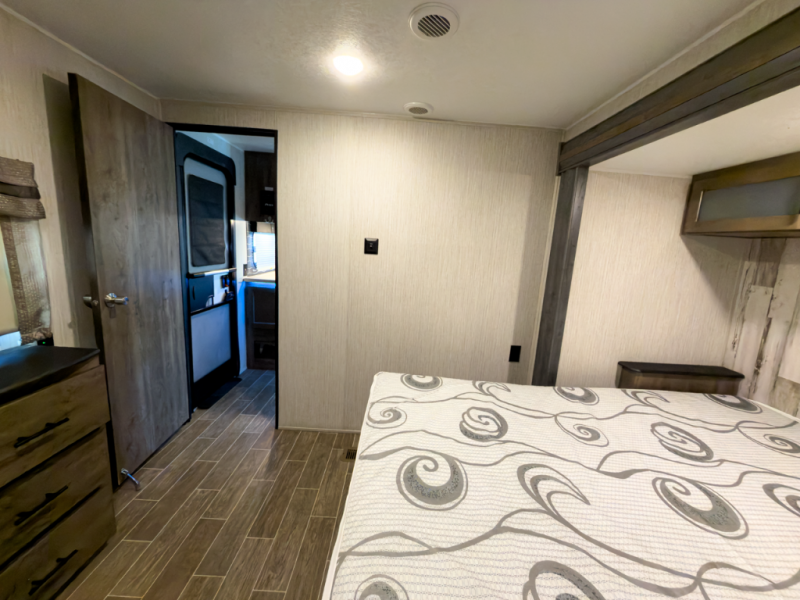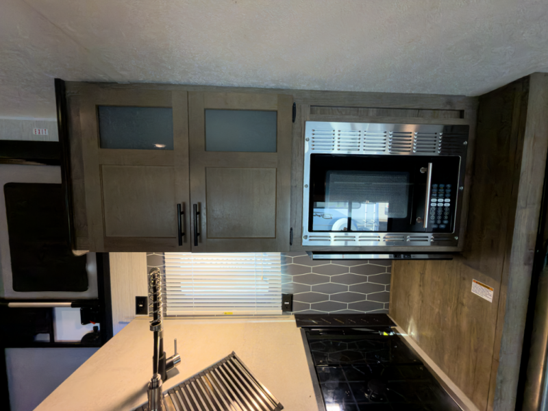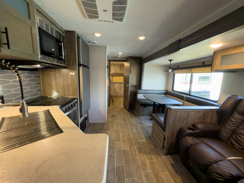 After playing outdoors all day, you can come inside this Puma travel trailer and relax on the jackknife sofa before taking a shower in the full bathroom. The kids will surely head towards the private bunkhouse to play games on the floor or lie down on their own bunk bed. You can escape to your private oasis as well in the front private bedroom where you will find a full-size closet and queen bed slide.