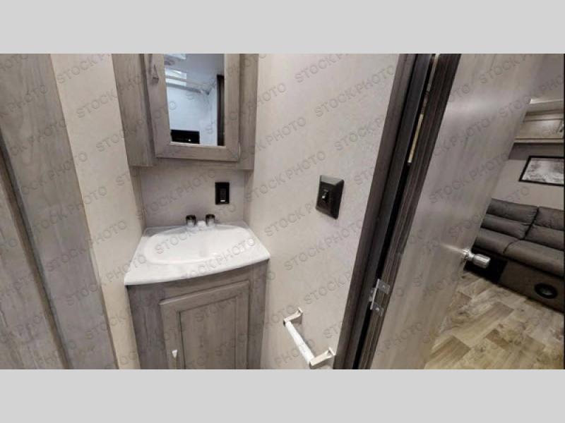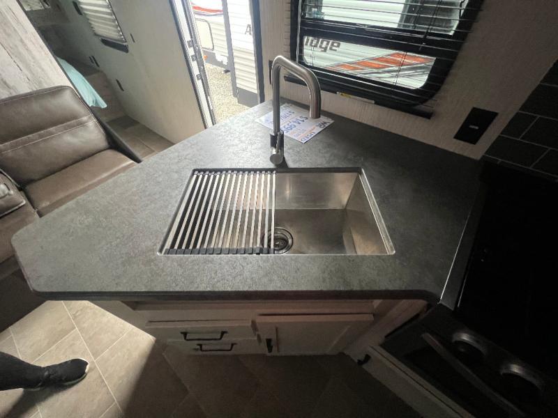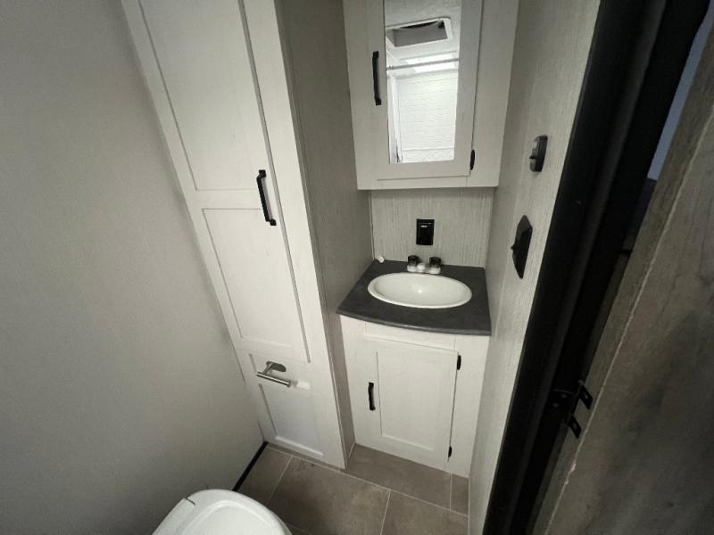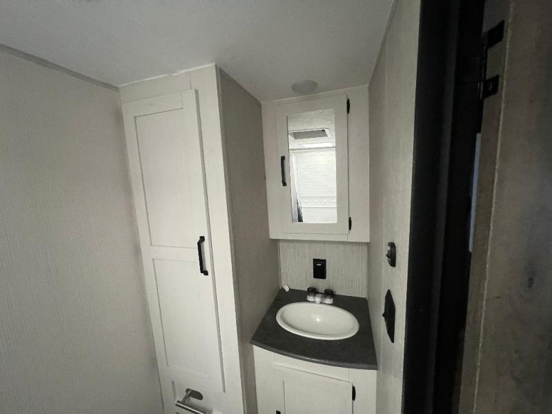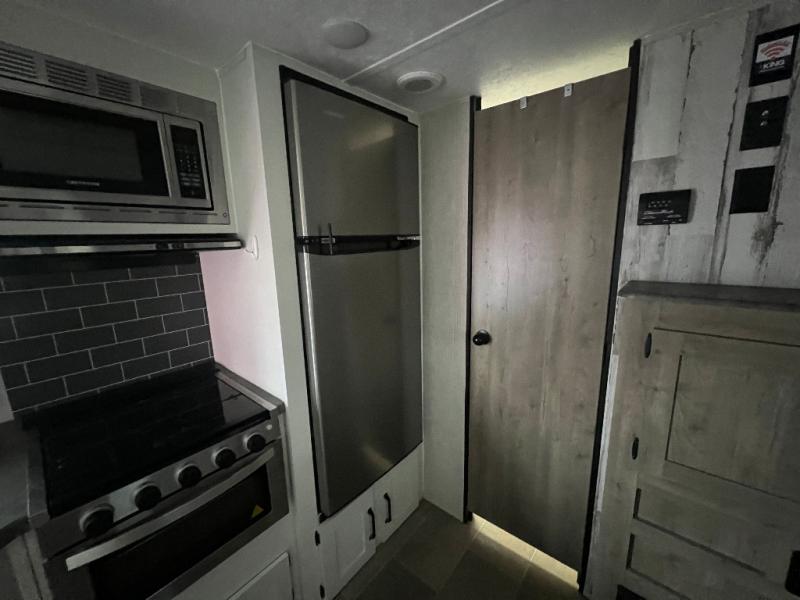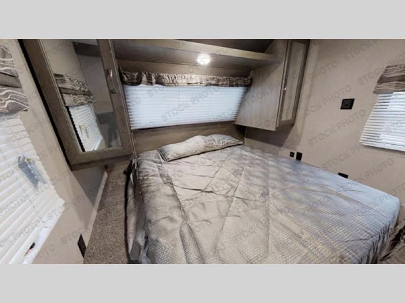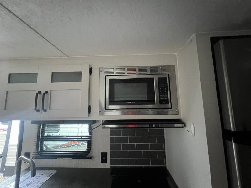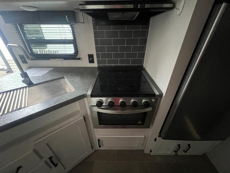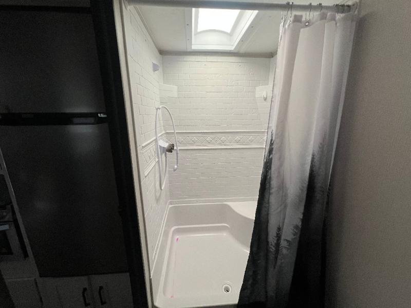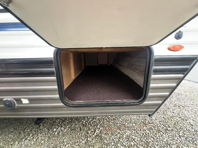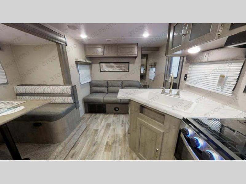 You don't want to pass up this spacious and convenient travel trailer! The slide out dinette provides more floor space to let the kids play a game or your friends to move around, and you can comfortably sleep four to five people each night. The chef can prepare meals on the three burner cooktop, and clean up will be easy in the stainless steel sink. There is also a residential refrigerator to store your perishables for the week, and overhead compartments for your necessities. This trailer also includes a front private bedroom with a comfortable RV queen bed, plus a full rear bath that is tucked away for privacy!