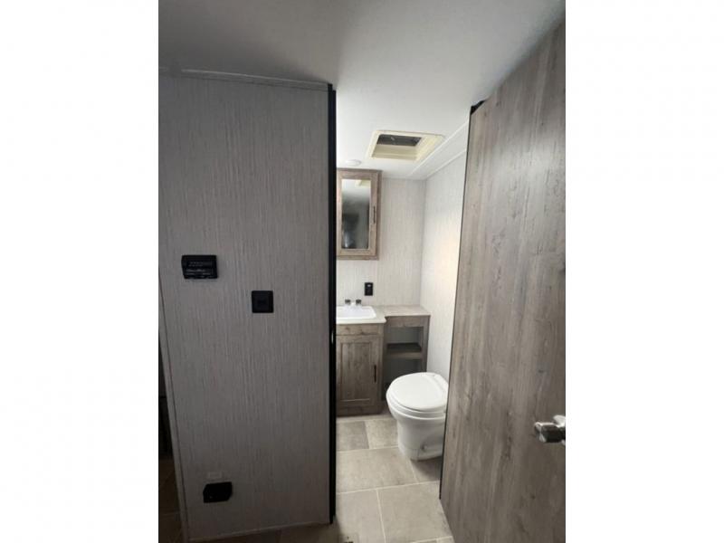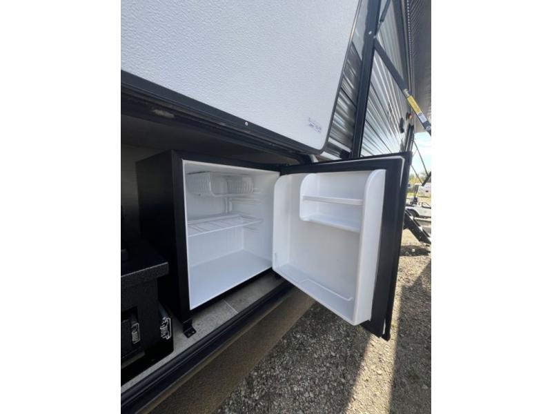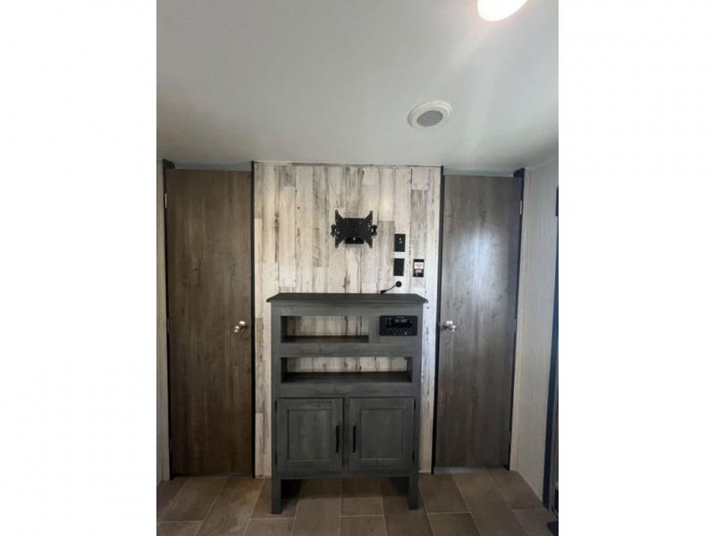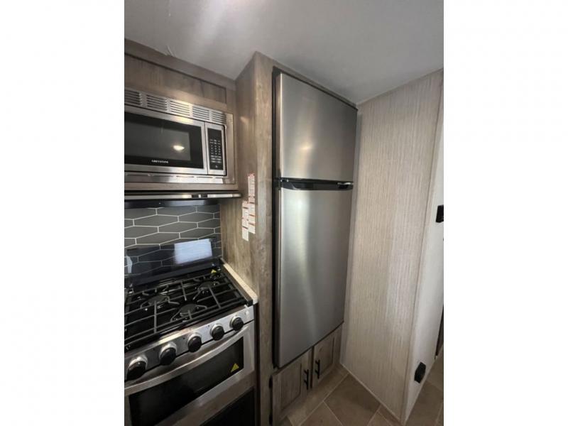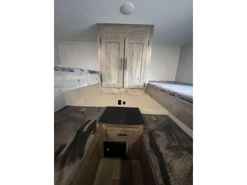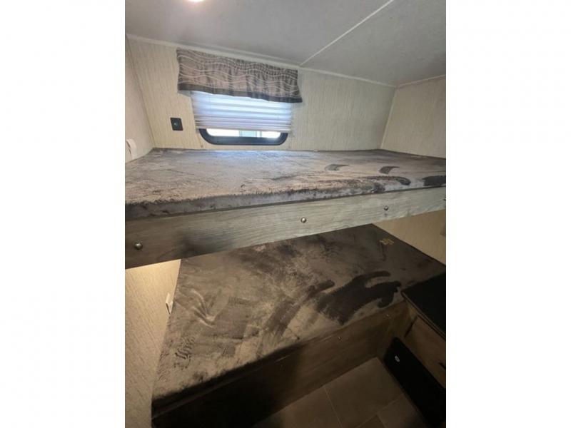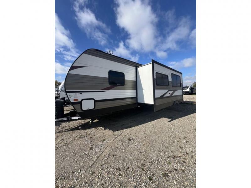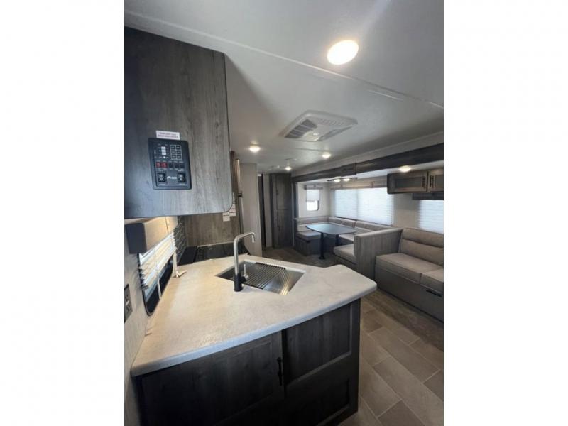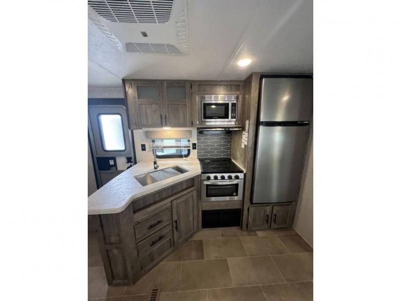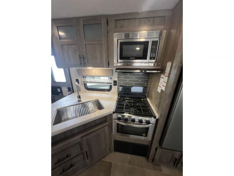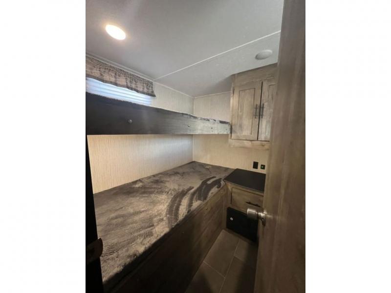 If you're looking to camp with the whole family or a group of friends, take a look at this spacious travel trailer. The kids or your friends will have their own private bunkhouse with four bunks and a wardrobe to store their clothes, and you can enjoy the private bedroom up front. Within the large slide out you'll find the U-shaped dinette and a sofa that will be perfect for relaxing, game night, and additional sleeping space. The chef can cook on the three burner cooktop, or use the stainless steel microwave, and the optional outside kitchen or camp kitchen both come with a griddle, so you might like to add one of those.