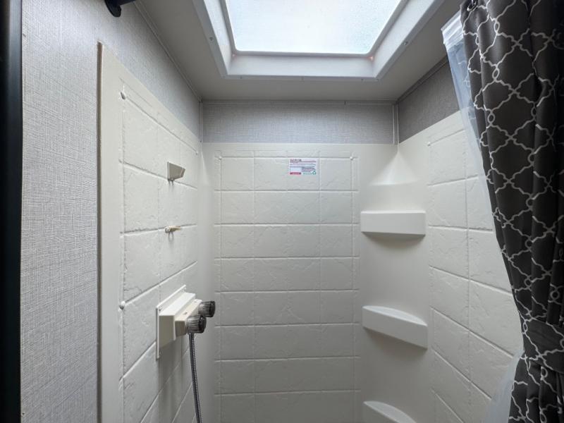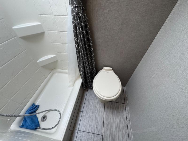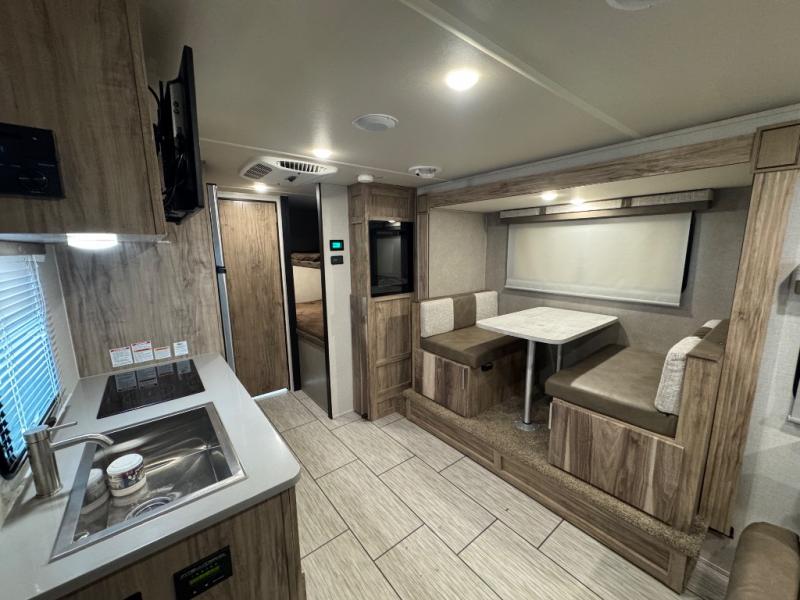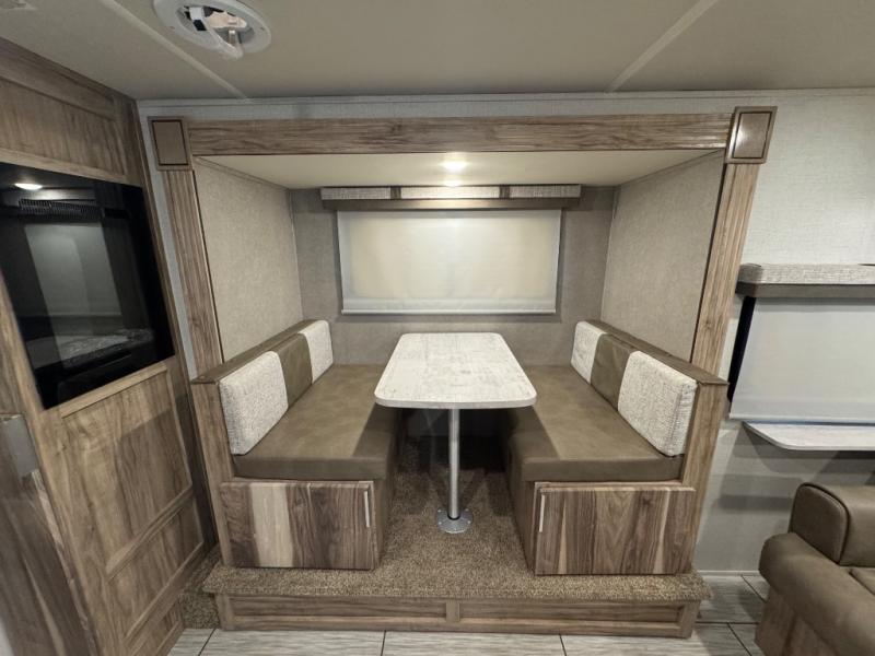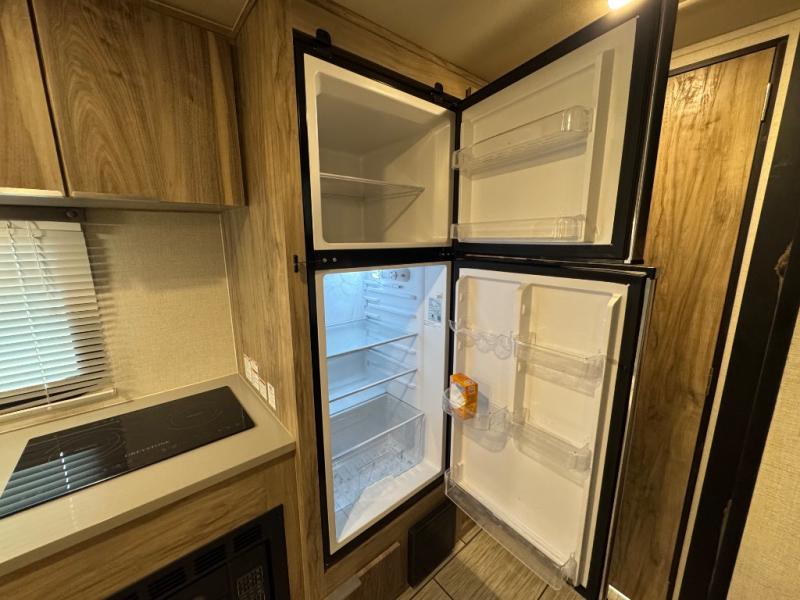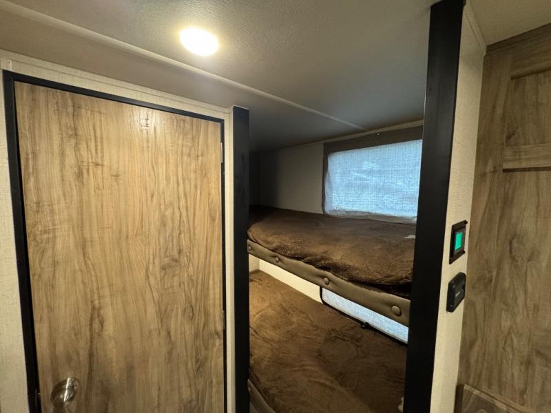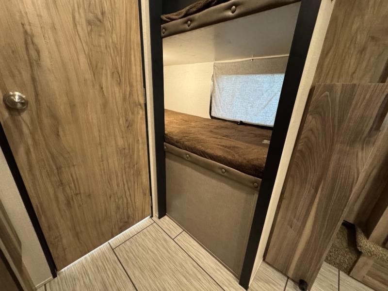 This family-friendly trailer gives the kids their own bunk beds and you will have a queen Murphy bed up front as well as a sofa to relax on during the daytime! The kids can even invite a friend to sleep on the booth dinette slide. The cook will enjoy making meals using the two burner stove and the convection microwave, and the refrigerator can store leftovers plus the pantry will hold your snacks. And the toilet and shower room offers privacy when changing and getting cleaned up.