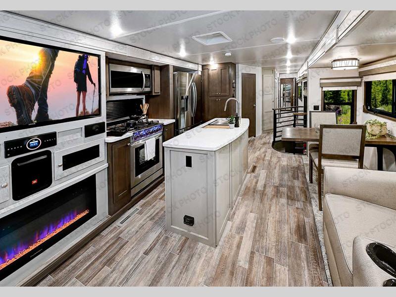Whether you decide to live in this fifth wheel or travel for long periods of time, you will love all the interior space with five slide outs found throughout, the unique steps and railing into the main area, and the middle bunkhouse that offers a flip-up bunk and tri-fold sofa, plus storage and a countertop that you might utilize as an office. The front bedroom includes a king bed with space to set your cellphones and drinks, an entertainment center with a pop-up 32" TV and fireplace below, clothing storage and a space prepped for a washer and dryer option. The Signature Spa walk-in shower with teak wood seat inside the full bathroom is just another reason you will love this RV. The kitchen is full of residential appliances, a pantry, and a center island allowing you to prepare and serve meals as well as keep all the dishes clean with the deep bowl stainless steel sink. And the upgraded hardware is a nice touch. You can dine at the wall-mounted free-standing table with extension with residential dinette chairs and relax on the theatre seats or the split tri-fold sofa. The living room also offers a 50" LED TV and fireplace to enjoy. More highlights include the a vessel sink with waterfall faucet in the bathroom, the upgraded pinbox, the Go Power Solar prep, and the basement residential 2-ton Coleman Serenity A/C with heat pump, plus more!