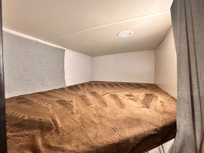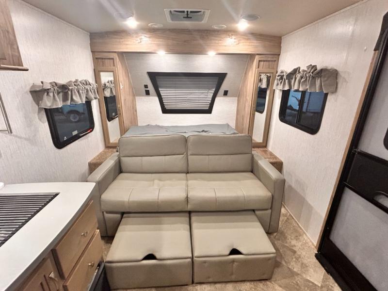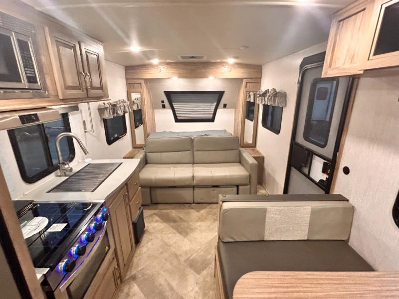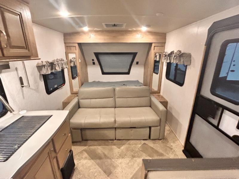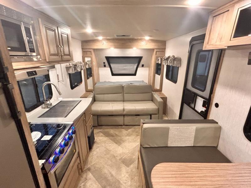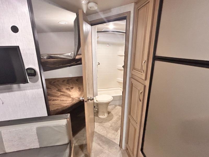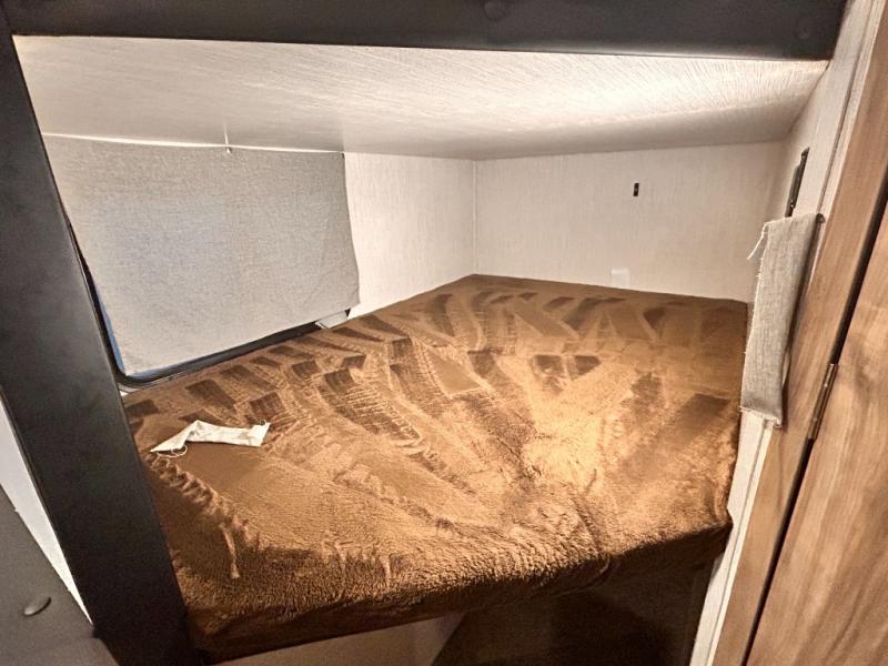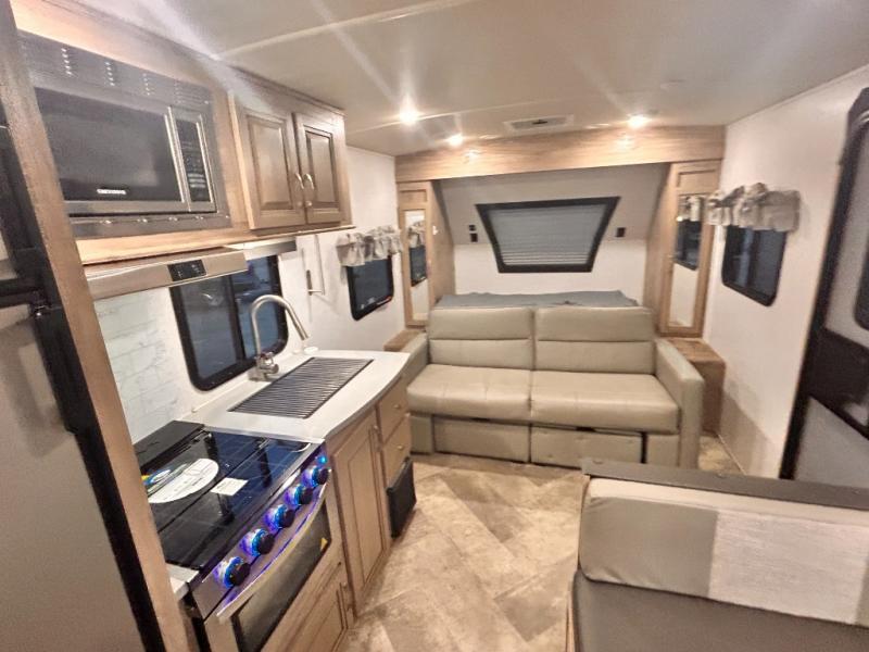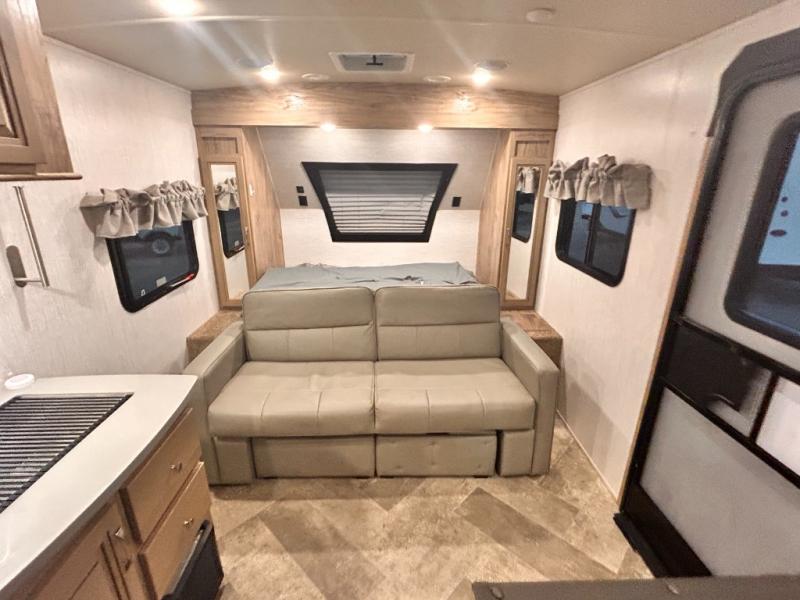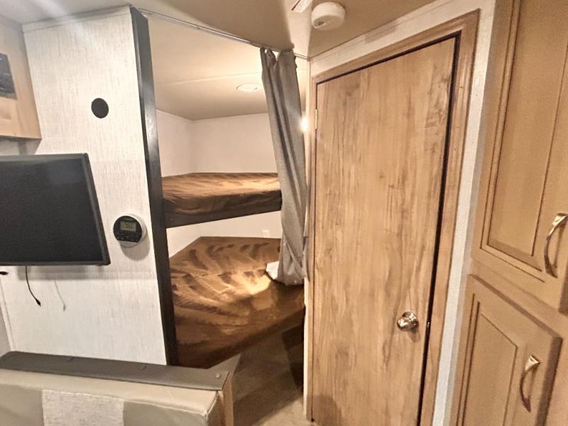 The kids will enjoy camping in this travel trailer! There is a set of double bunk beds next to the rear corner bathroom for easy access at night, and the bathroom features a 36" shower with a skylight above for natural lighting as you take a hot shower. You can prepare a delicious meal indoors with the three burner cooktop or head to the outside kitchen and enjoy some fresh air while you cook, plus you will stay protected by the 19' power awning with LED lights. Depending what time of day you enter the unit will determine whether you see the front queen bed or the sofa!