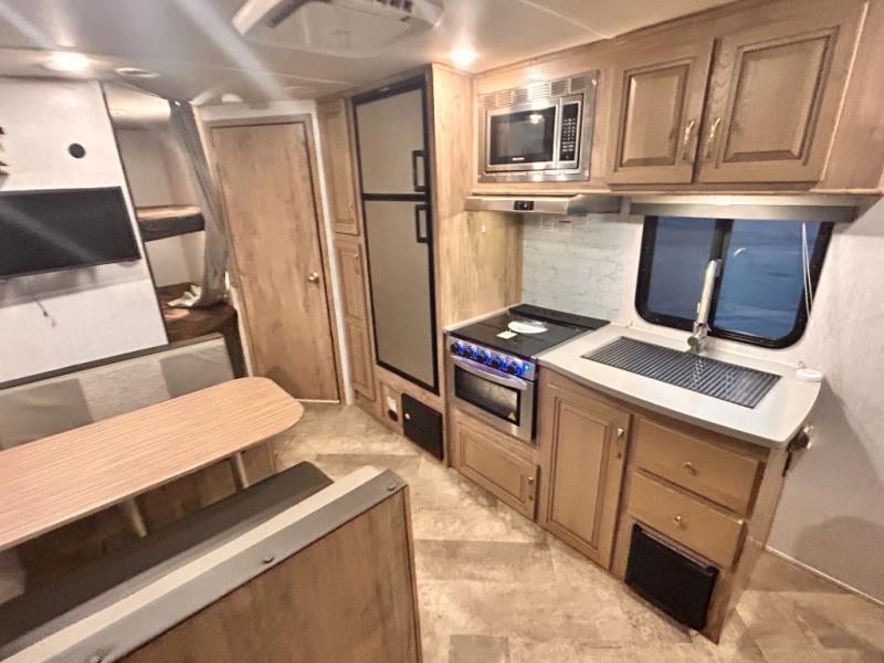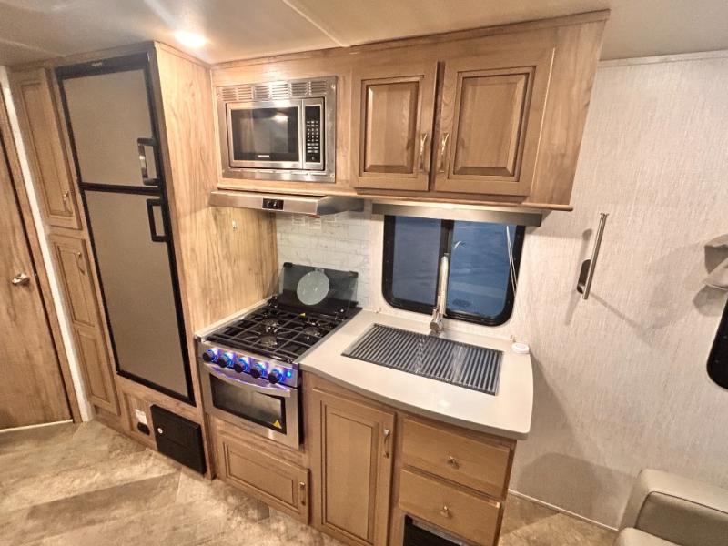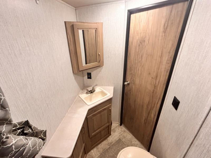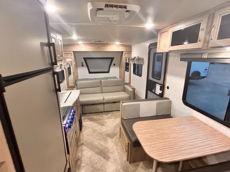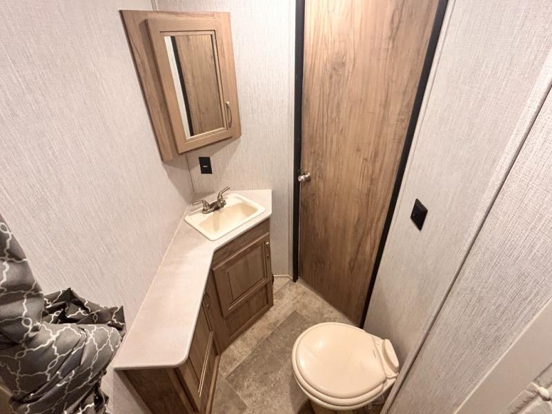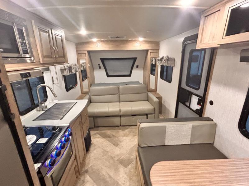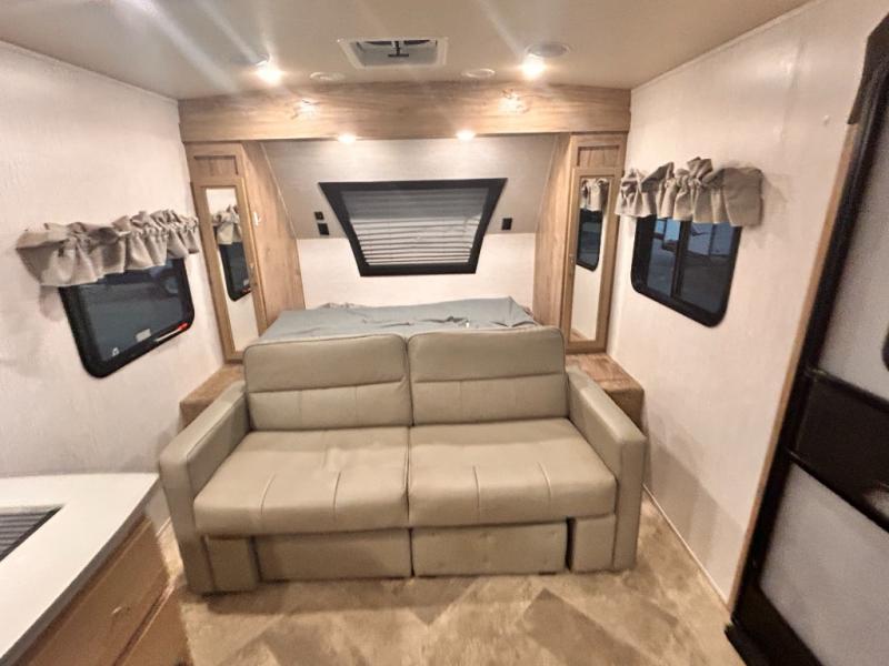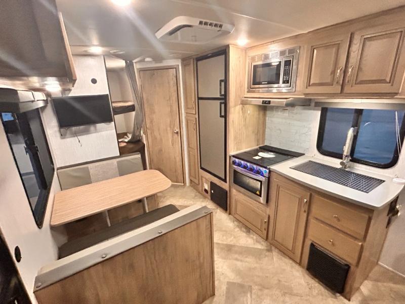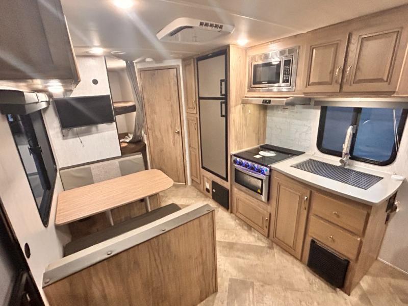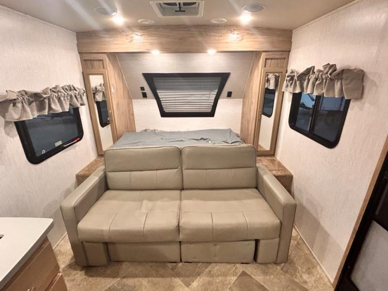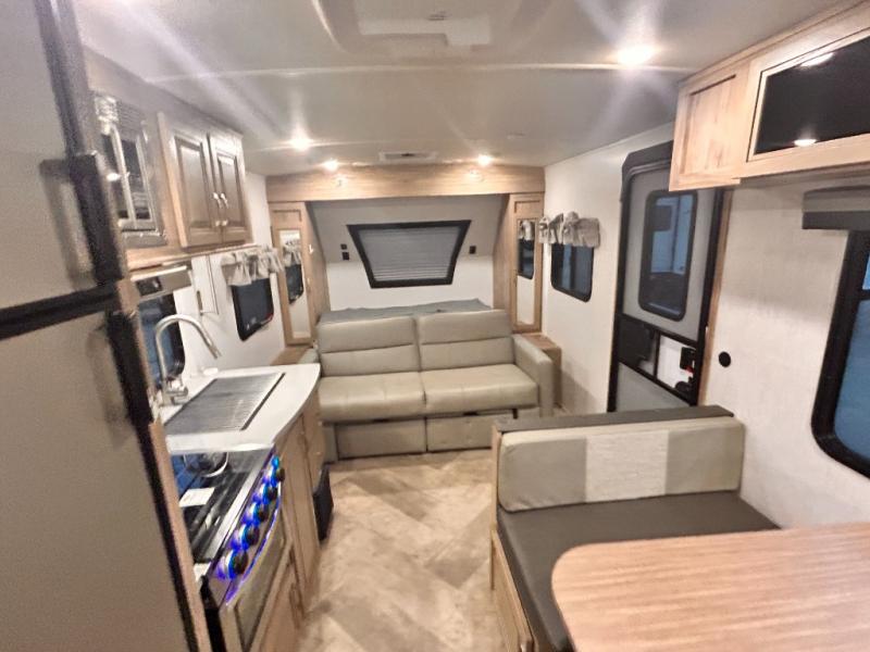 The kids will enjoy camping in this travel trailer! There is a set of double bunk beds next to the rear corner bathroom for easy access at night, and the bathroom features a 36" shower with a skylight above for natural lighting as you take a hot shower. You can prepare a delicious meal indoors with the three burner cooktop or head to the outside kitchen and enjoy some fresh air while you cook, plus you will stay protected by the 19' power awning with LED lights. Depending what time of day you enter the unit will determine whether you see the front queen bed or the sofa!