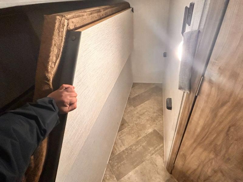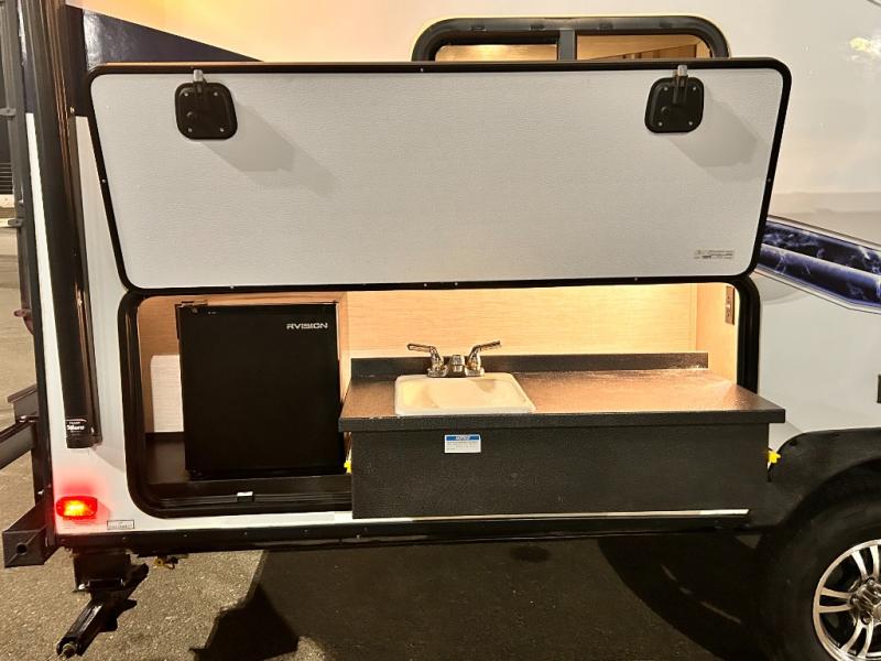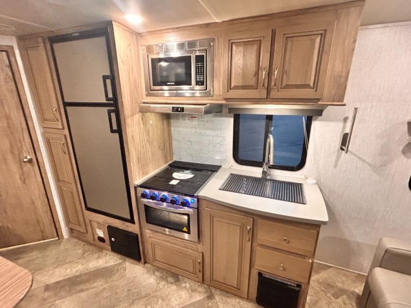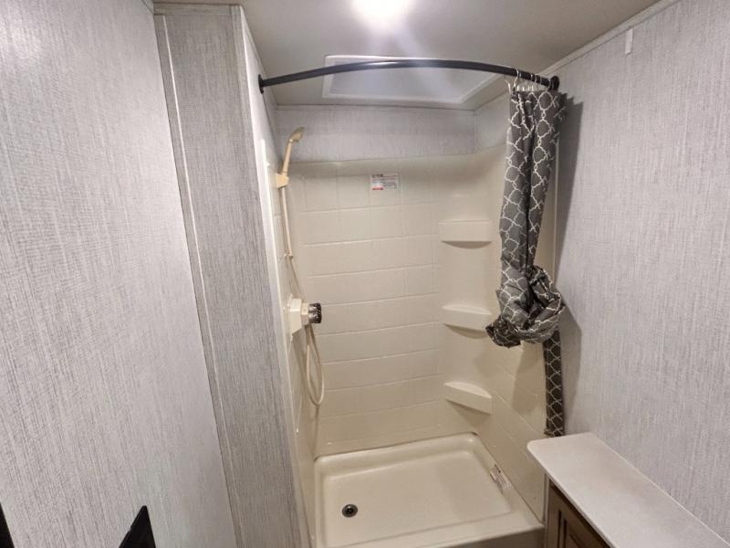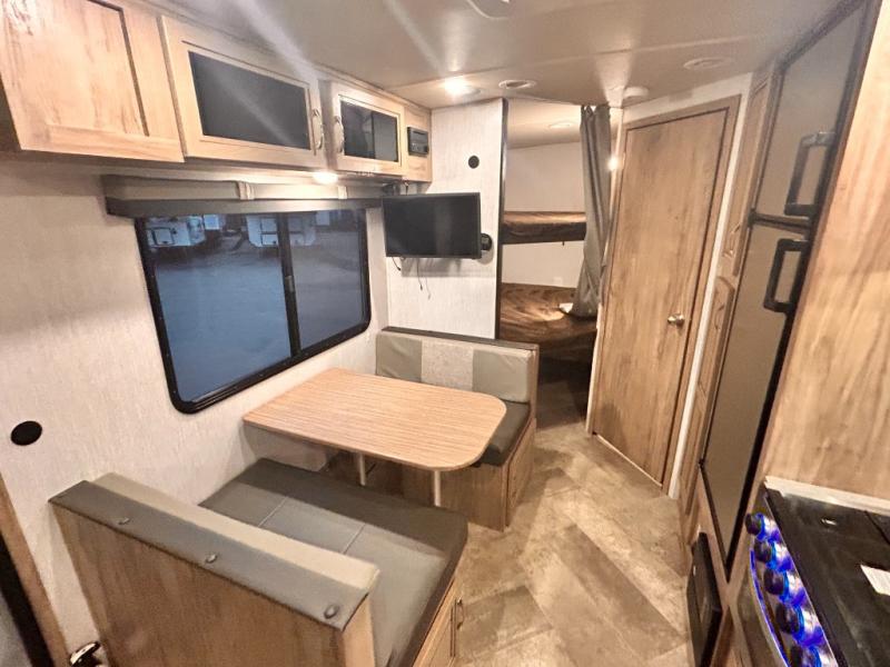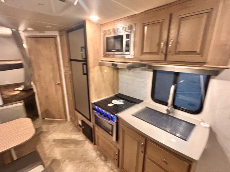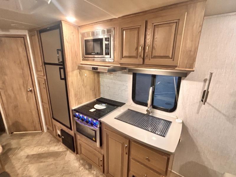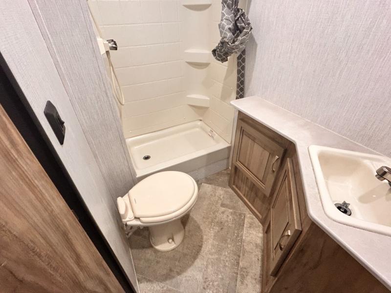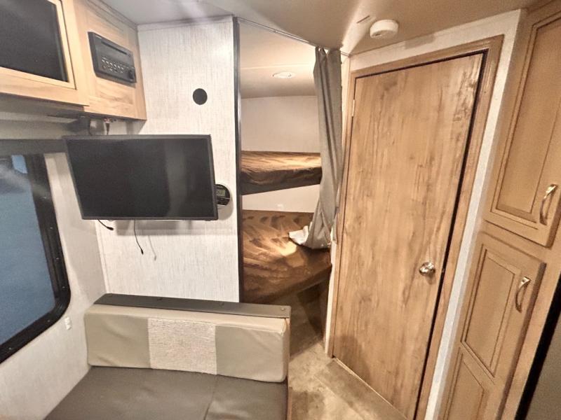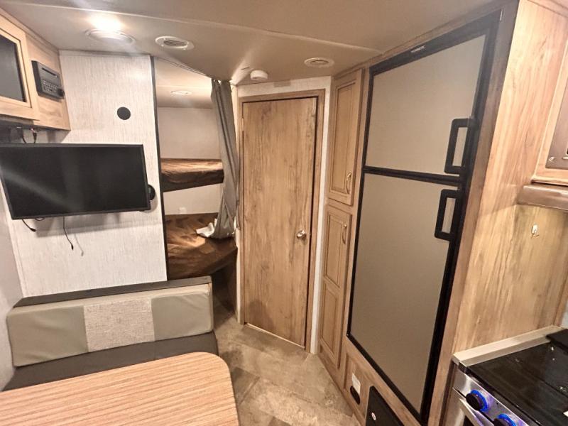 The kids will enjoy camping in this travel trailer! There is a set of double bunk beds next to the rear corner bathroom for easy access at night, and the bathroom features a 36" shower with a skylight above for natural lighting as you take a hot shower. You can prepare a delicious meal indoors with the three burner cooktop or head to the outside kitchen and enjoy some fresh air while you cook, plus you will stay protected by the 19' power awning with LED lights. Depending what time of day you enter the unit will determine whether you see the front queen bed or the sofa!