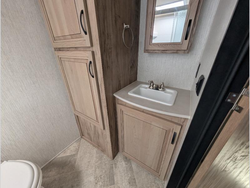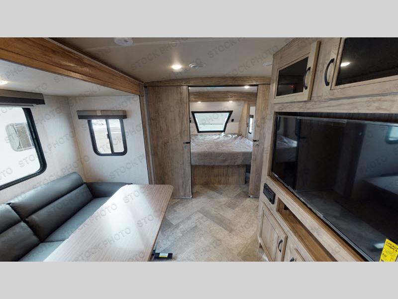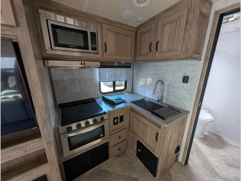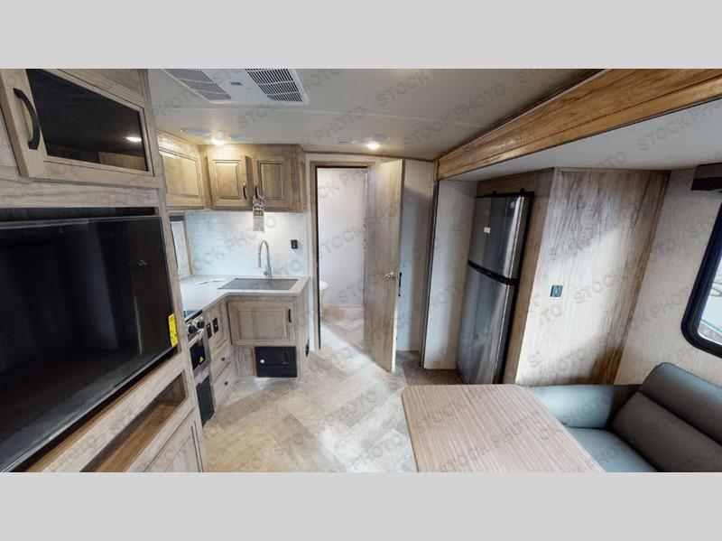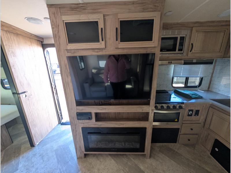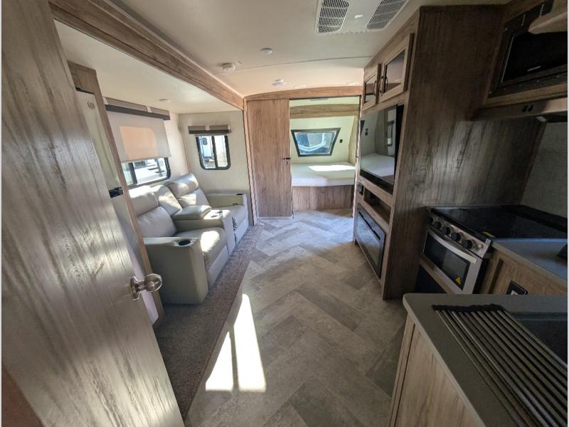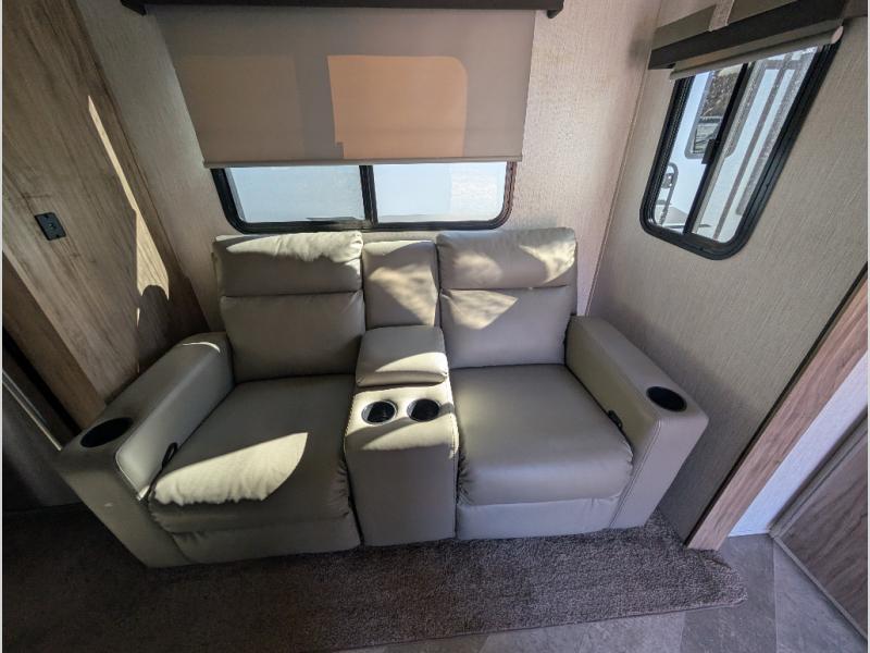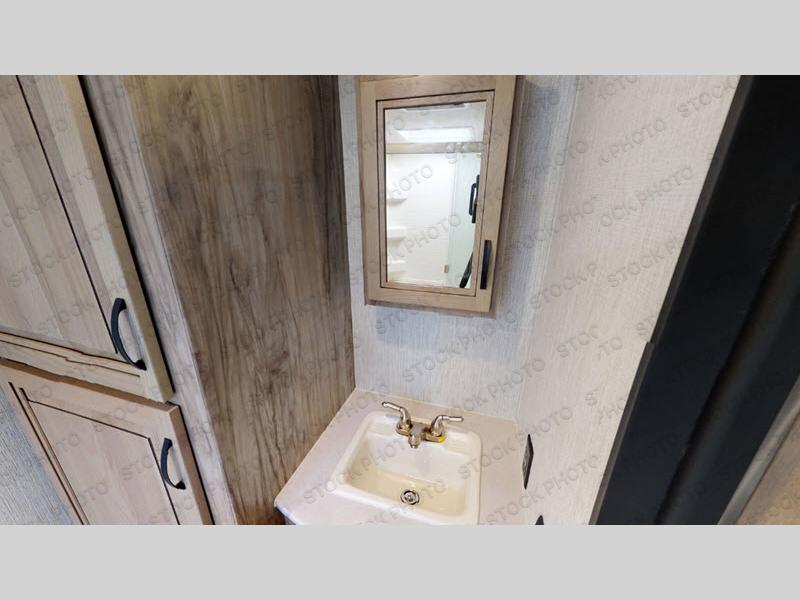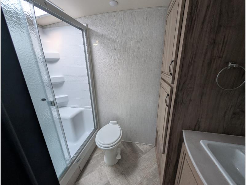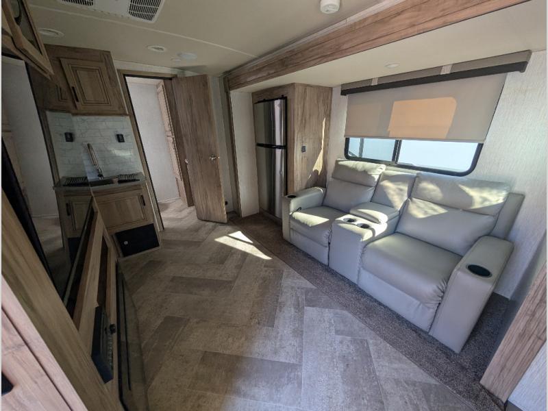 You and your spouse will love camping in this travel trailer! Start each morning feeling clean and fresh with the full rear bathroom featuring a 30" x 48" shower with a seat and skylight above for added natural lighting, plus a linen closet to store your towels. The 68" theater sofa sleeper is directly across from the entertainment center for a relaxing evening indoors. You can cook breakfast indoors with the three burner cooktop or outside with the pull out stove and refrigerator. The front private bedroom has a king bed with wardrobes on either side of it to keep your clothes looking their best!