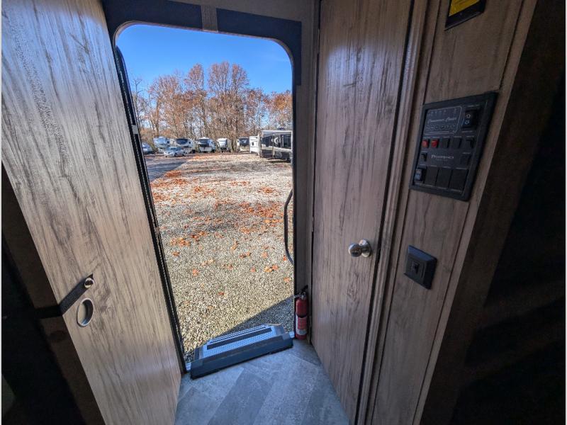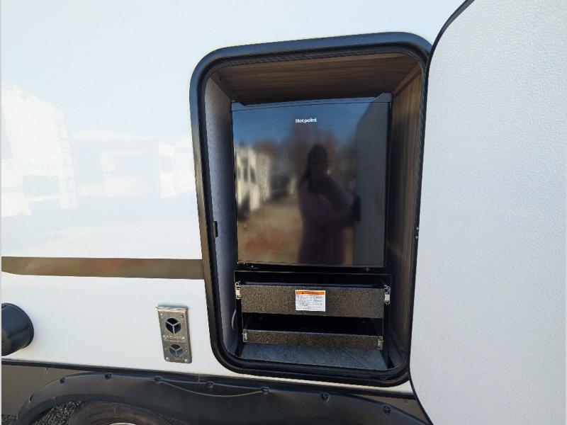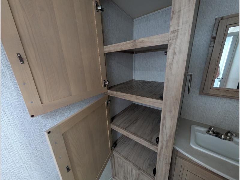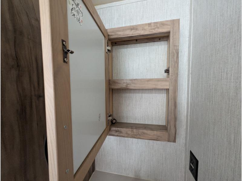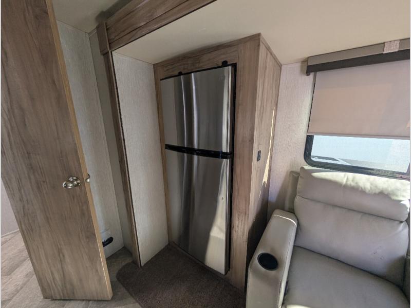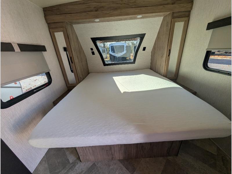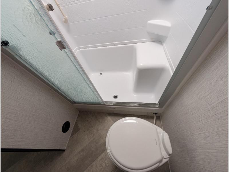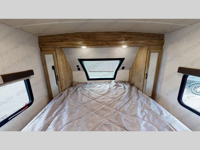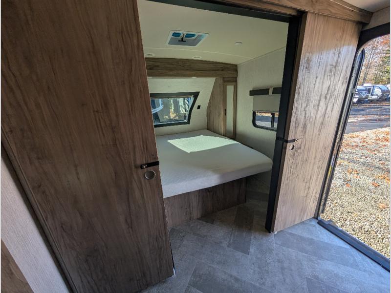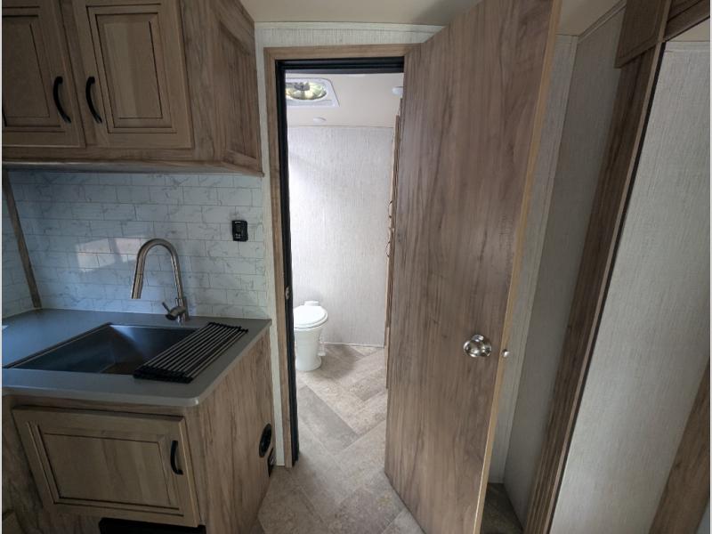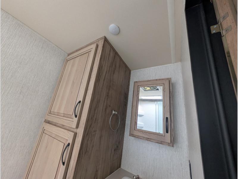 You and your spouse will love camping in this travel trailer! Start each morning feeling clean and fresh with the full rear bathroom featuring a 30" x 48" shower with a seat and skylight above for added natural lighting, plus a linen closet to store your towels. The 68" theater sofa sleeper is directly across from the entertainment center for a relaxing evening indoors. You can cook breakfast indoors with the three burner cooktop or outside with the pull out stove and refrigerator. The front private bedroom has a king bed with wardrobes on either side of it to keep your clothes looking their best!