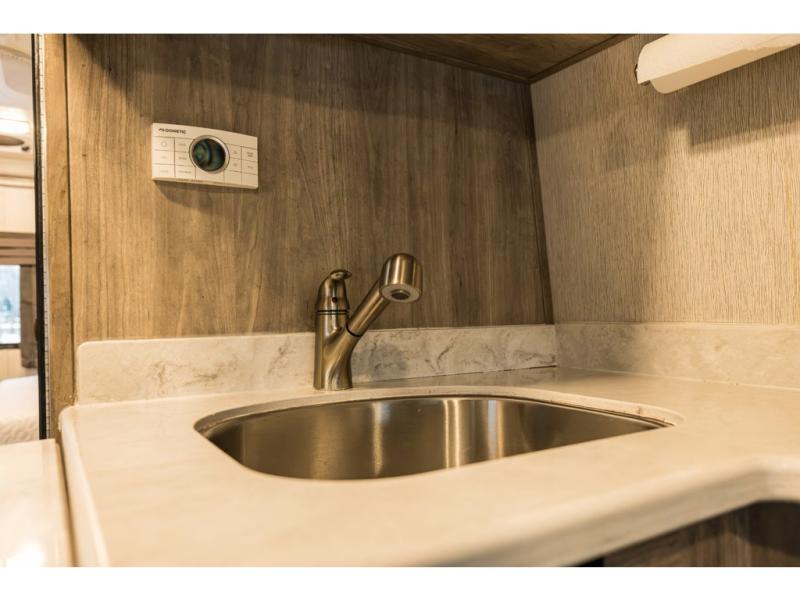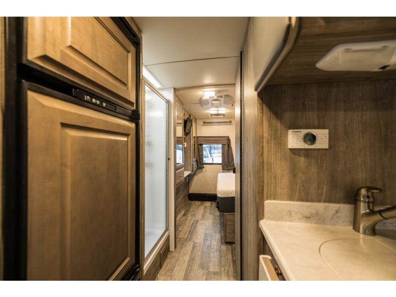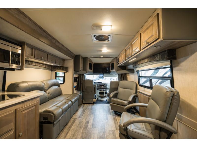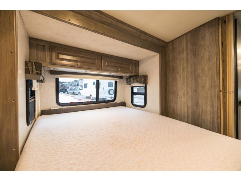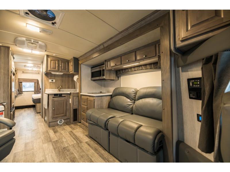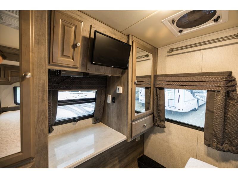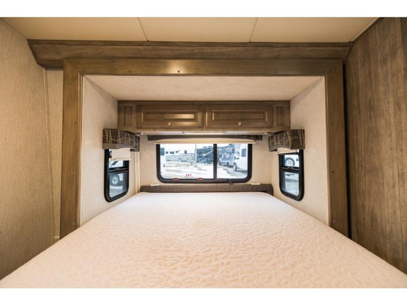 If you like to telecommute, this Phoenix Cruiser Class B+ gas motorhome is perfect since it includes a desk in the rear bedroom across from the RV queen bed. You will also find dual wardrobes and a TV cabinet. The main living area includes a slide out providing extra floor space for the cook, and the 54" x 74" sofa bed provides additional sleeping space once set up for nighttime. You will also find seating on the two lounge chairs and swivel passenger seat. This is the one!