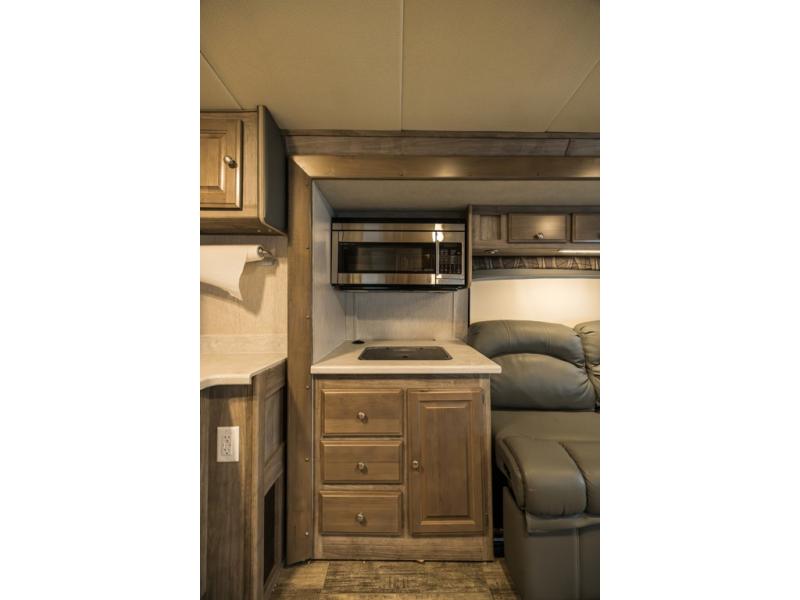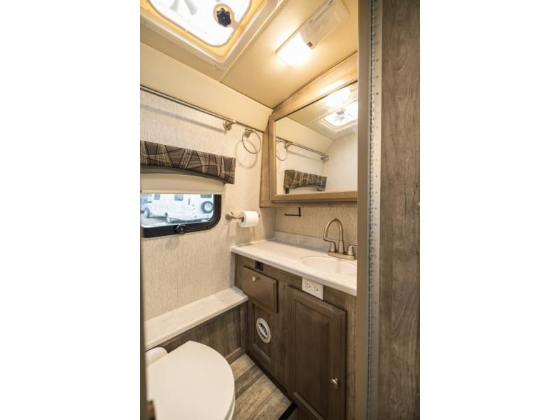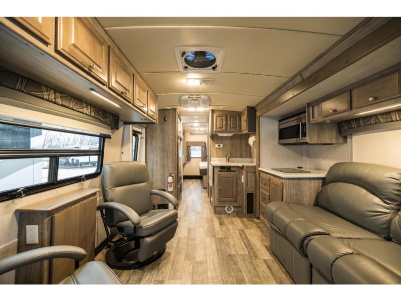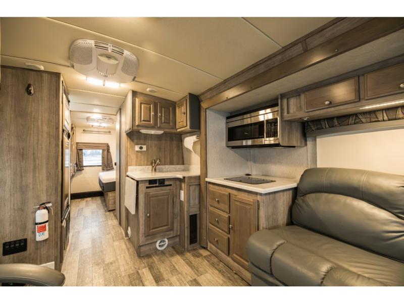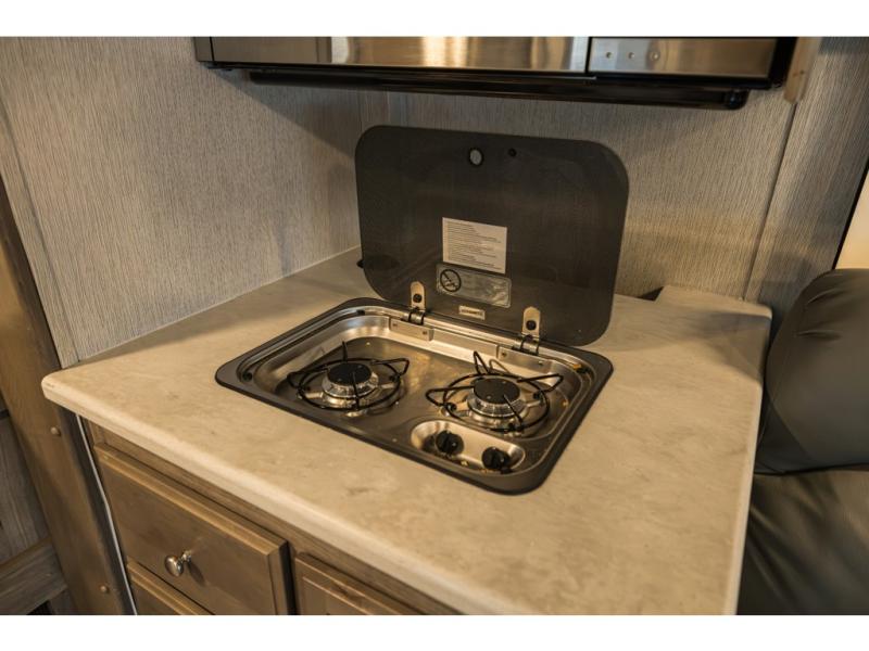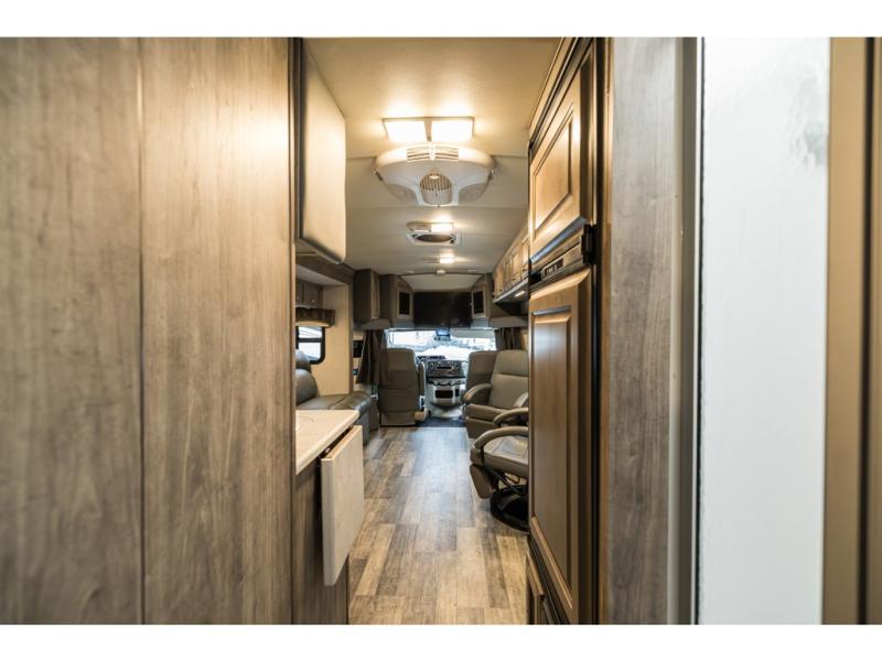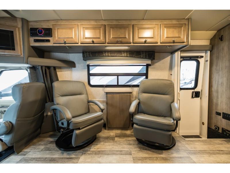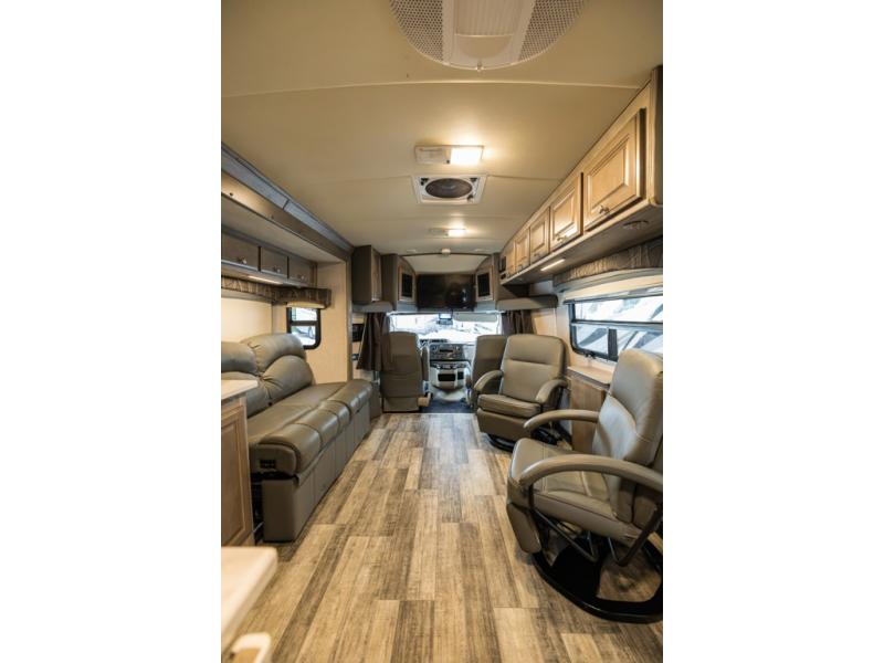 If you like to telecommute, this Phoenix Cruiser Class B+ gas motorhome is perfect since it includes a desk in the rear bedroom across from the RV queen bed. You will also find dual wardrobes and a TV cabinet. The main living area includes a slide out providing extra floor space for the cook, and the 54" x 74" sofa bed provides additional sleeping space once set up for nighttime. You will also find seating on the two lounge chairs and swivel passenger seat. This is the one!