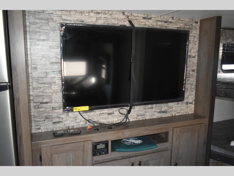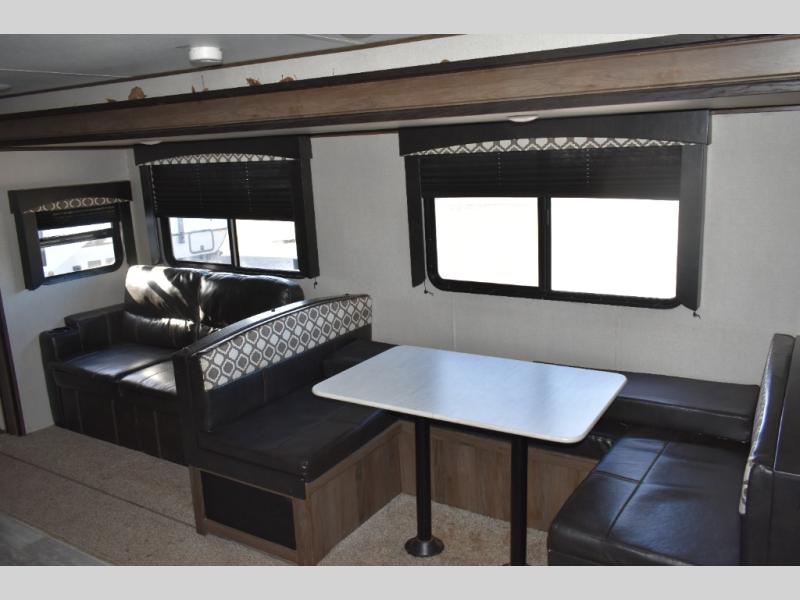 If you are a growing family that enjoys the comforts of home while away exploring at a state park, then you need this Avenger travel trailer. You are sure to enjoy the entertainment center and large LED TV, and the outdoor kitchen will be helpful as you visit with other campers and watch your kids play. From the U-shaped dinette and sofa, to the queen-size bed in the private bedroom and double-size bunks, you will have plenty of space to sleep ten people.