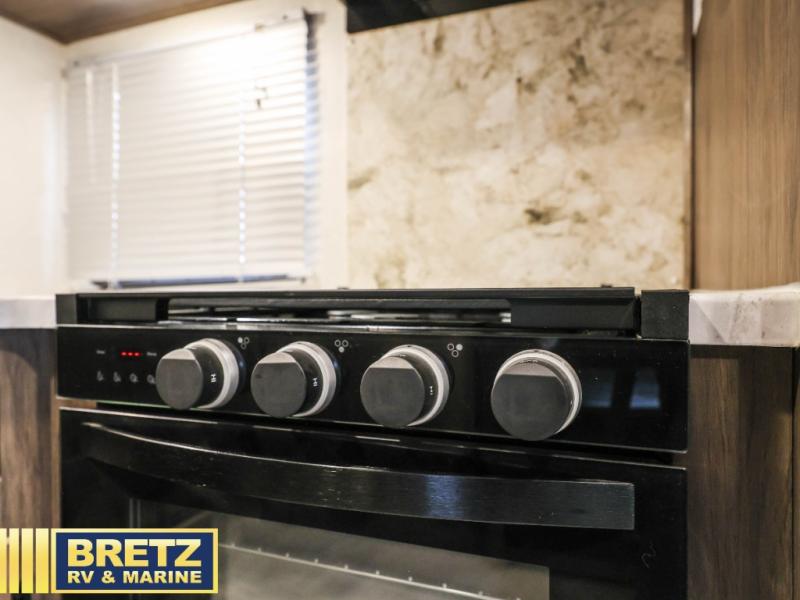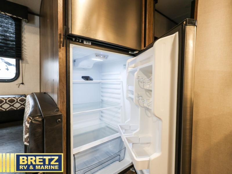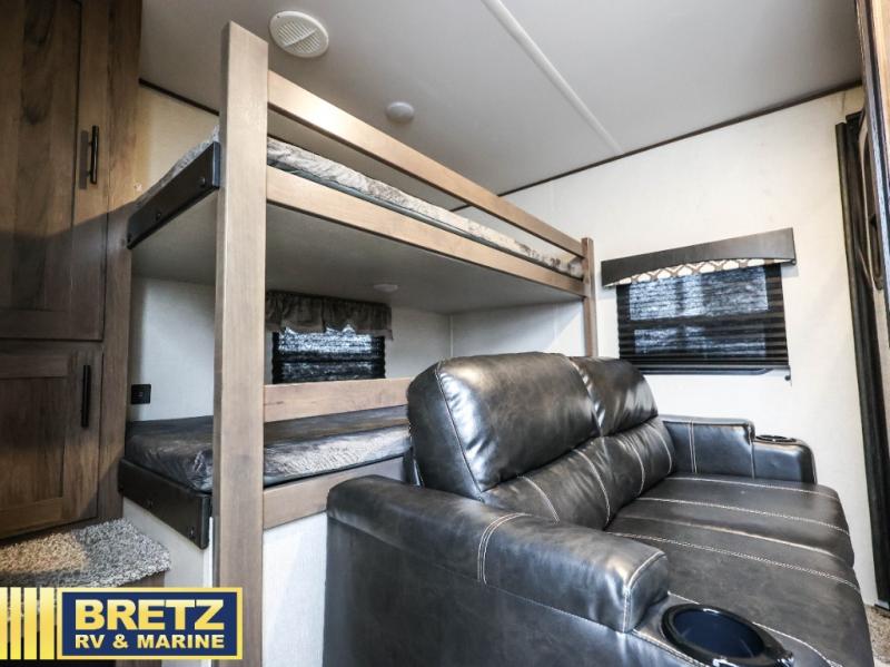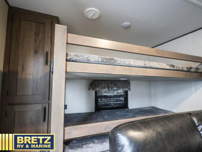 You will be ready to take on any adventure with this Avenger travel trailer! The first thing that sets this trailer a part from the rest is its set of two entry doors. This allows you to choose whether or not you want to enter the main living area or the front bedroom. The other feature that sets this trailer a part is the set of double-size bunks in the back. These bunks have stairs that lead up to them, and they are sectioned off by a jackknife sofa that rests in front of them. The sofa and U-shaped dinette are perfectly positioned to watch the entertainment center and fireplace, and they are adjacent to the kitchen so that you can still chat with the chef while they are working at the three-burner range or using the large 17" oven.