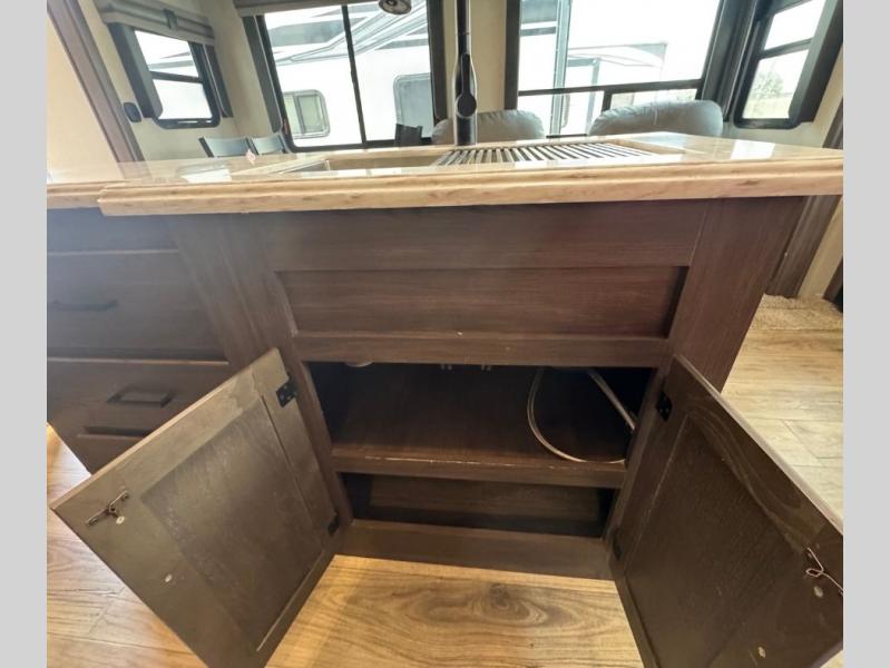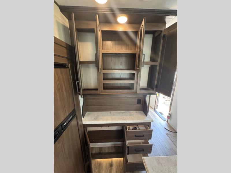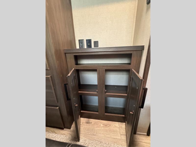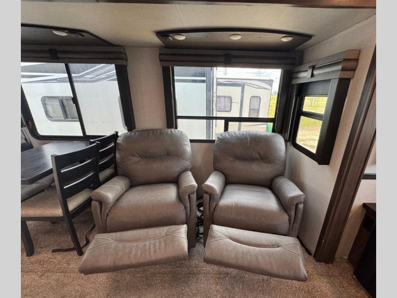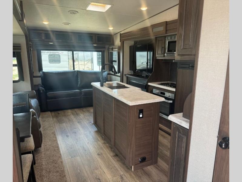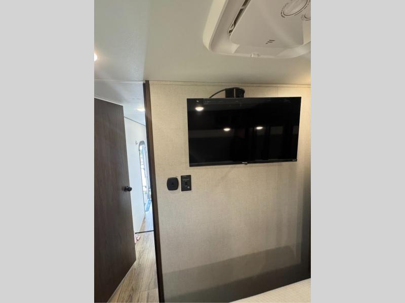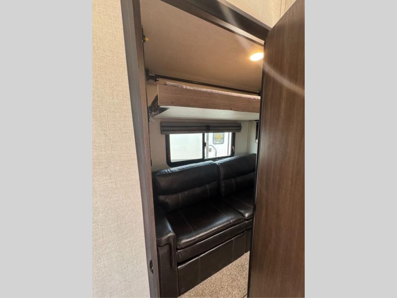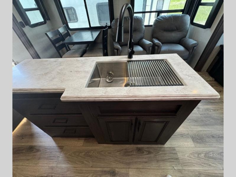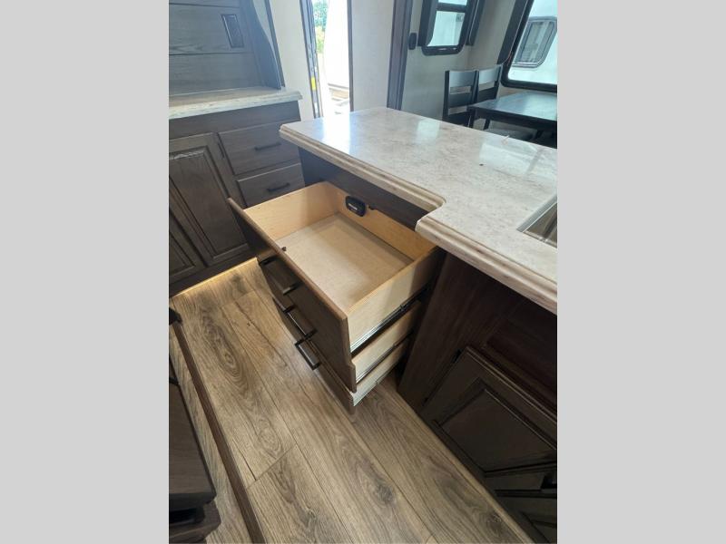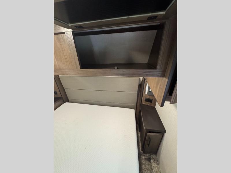 This family-friendly fifth wheel offers a middle bunkhouse for the kids or your guests and includes a Sleep and Play under an upper bunk within a slide out giving you more floor space to play and relax. You will have your own private front bedroom with a queen bed, a wardrobe slide, and nightstands on both sides of the bed. The chef will love the kitchen island, stainless steel appliances, and the extra counter space to serve meals. Everyone can dine at the dinette, and some might even eat while sitting on the hide-a-bed sofa and theater seats. The large LED TV can be seen by all, and when you want to relax outside, grab a camping chair and sit under the LED lit Smart arm awning or under the stars!