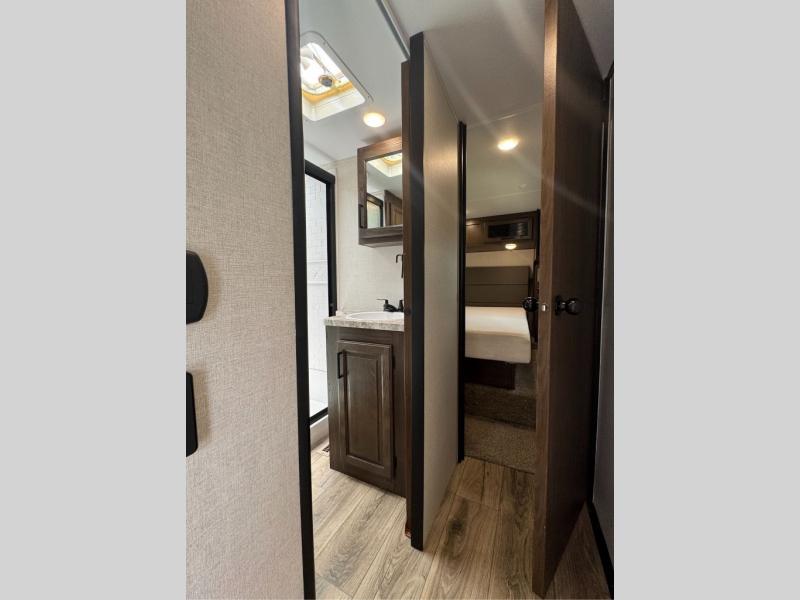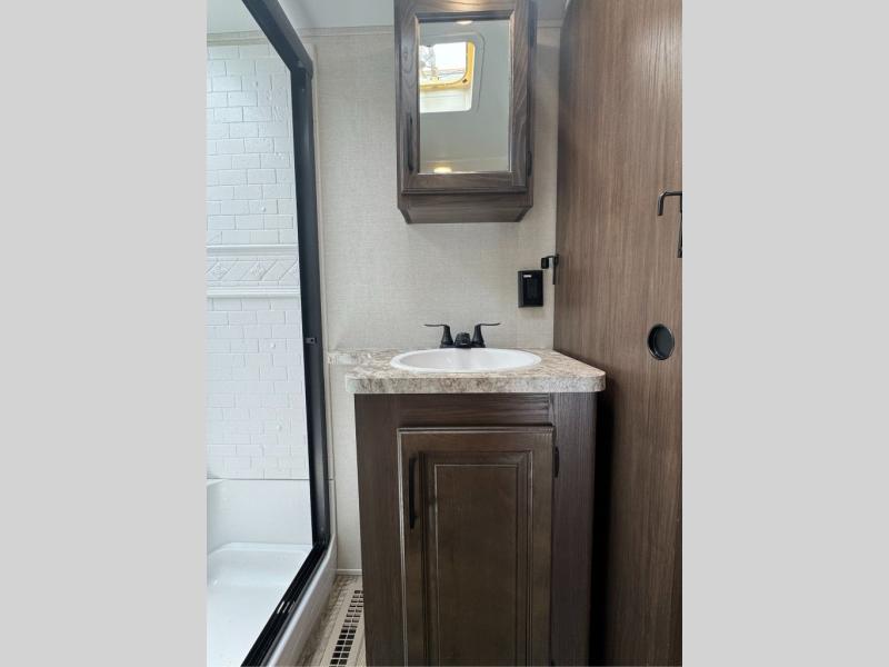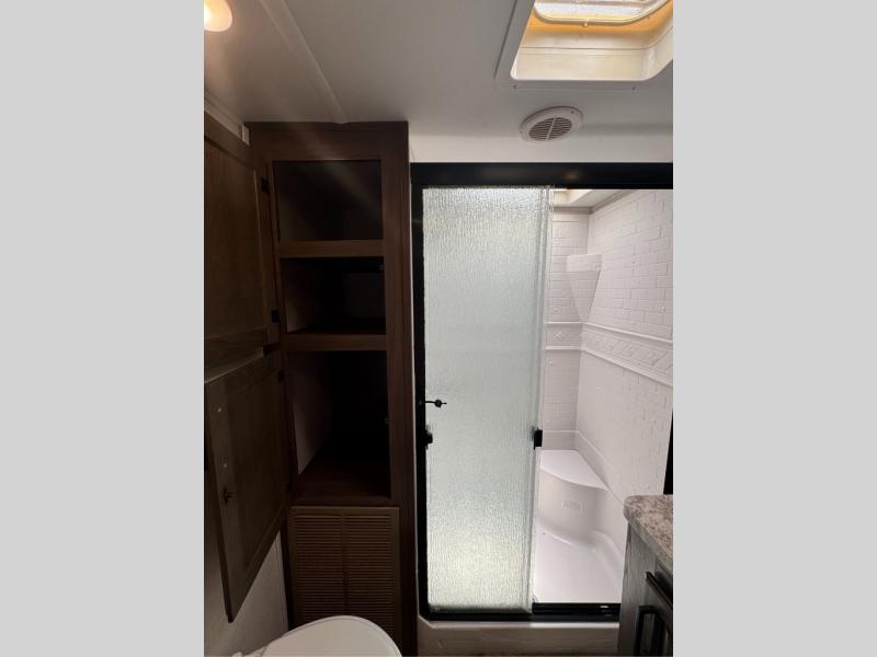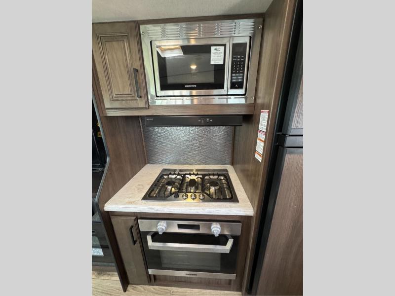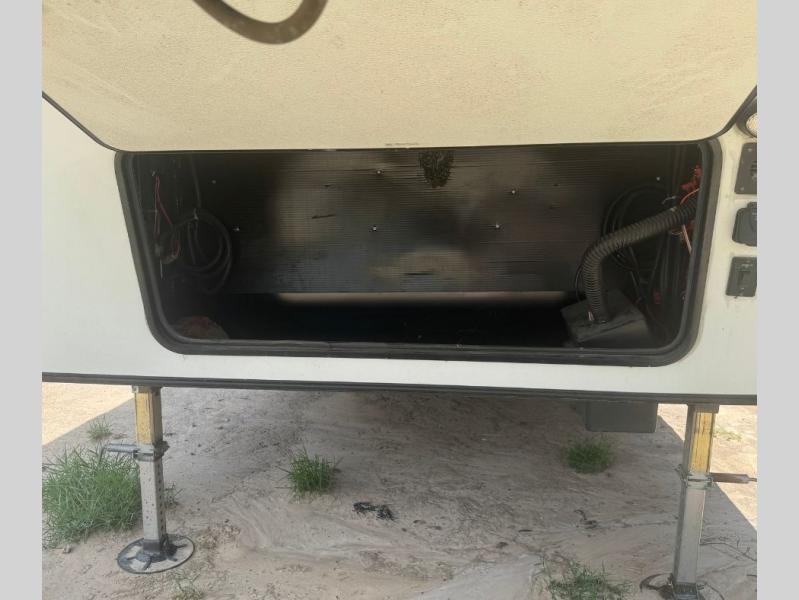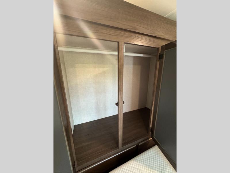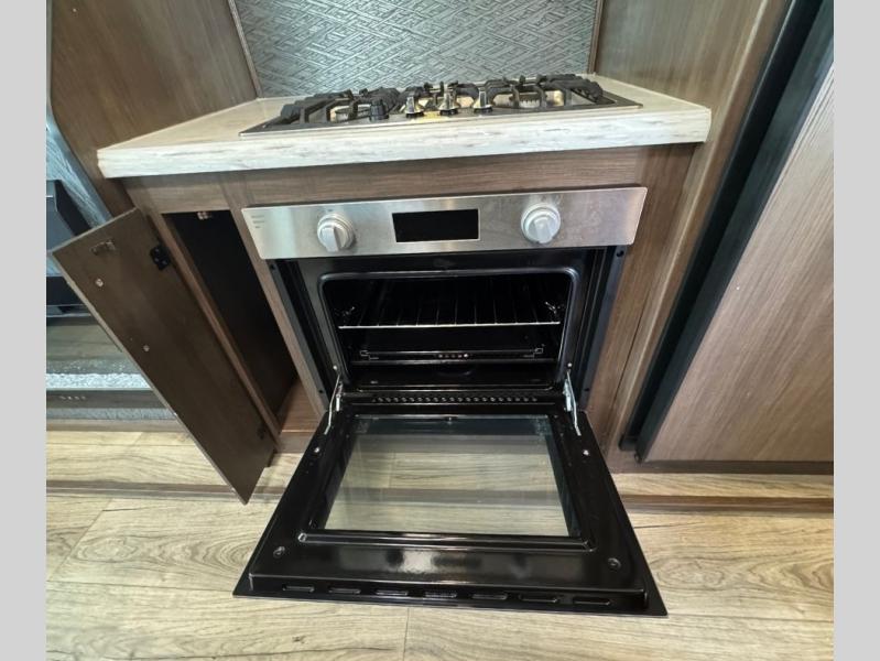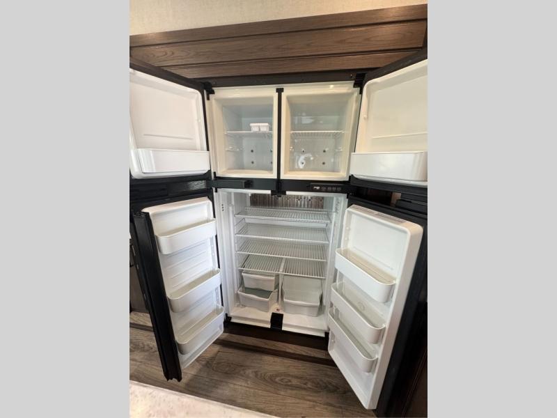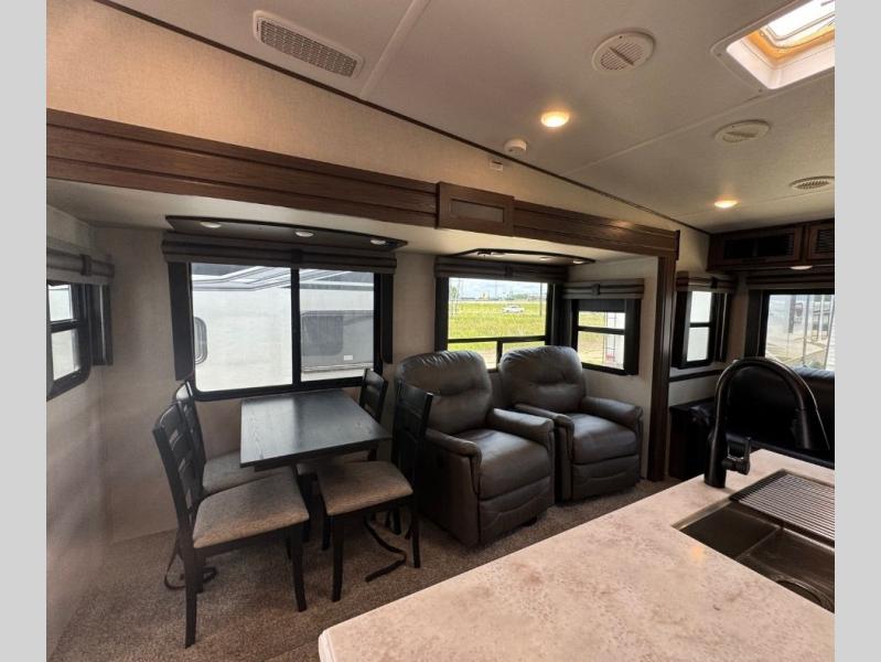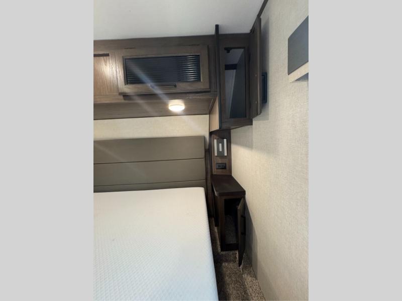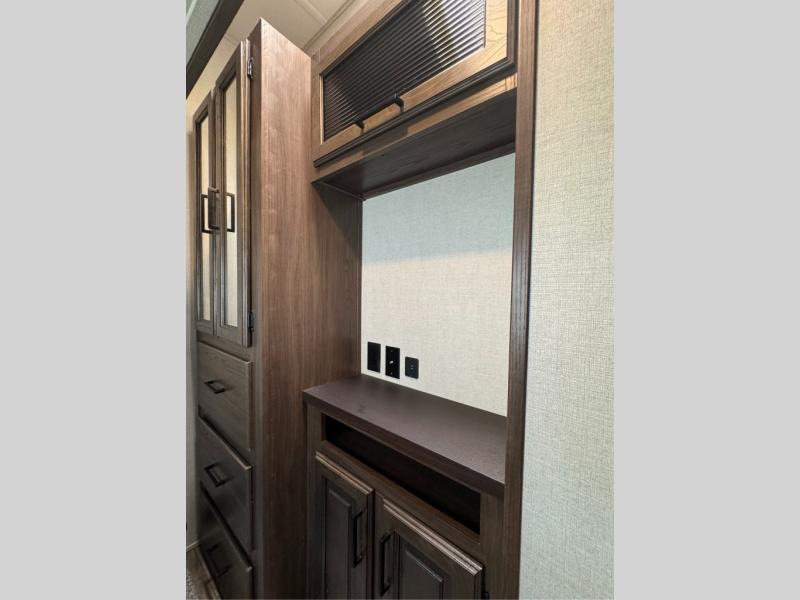 This family-friendly fifth wheel offers a middle bunkhouse for the kids or your guests and includes a Sleep and Play under an upper bunk within a slide out giving you more floor space to play and relax. You will have your own private front bedroom with a queen bed, a wardrobe slide, and nightstands on both sides of the bed. The chef will love the kitchen island, stainless steel appliances, and the extra counter space to serve meals. Everyone can dine at the dinette, and some might even eat while sitting on the hide-a-bed sofa and theater seats. The large LED TV can be seen by all, and when you want to relax outside, grab a camping chair and sit under the LED lit Smart arm awning or under the stars!