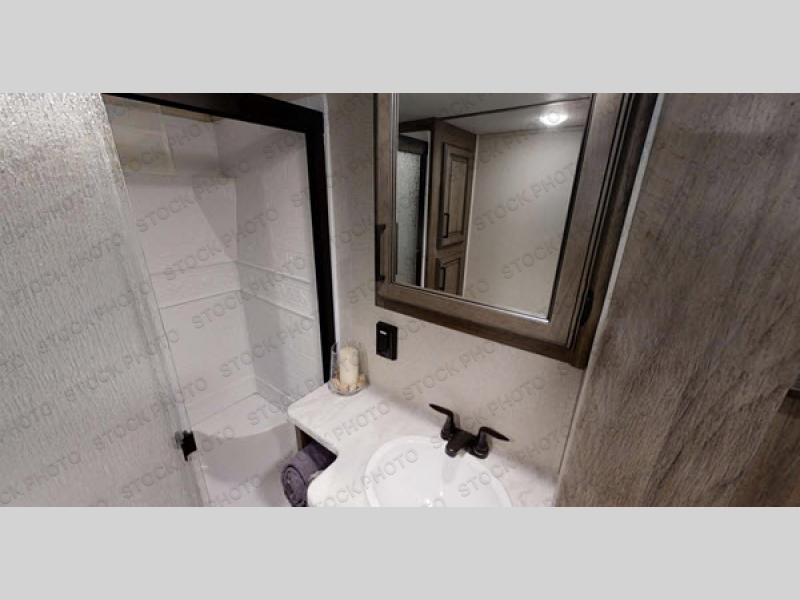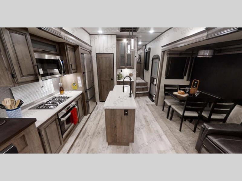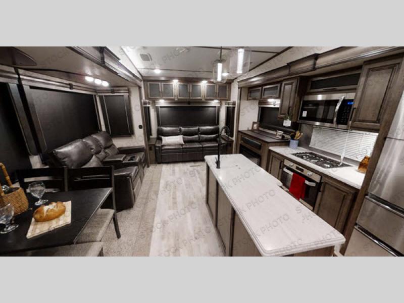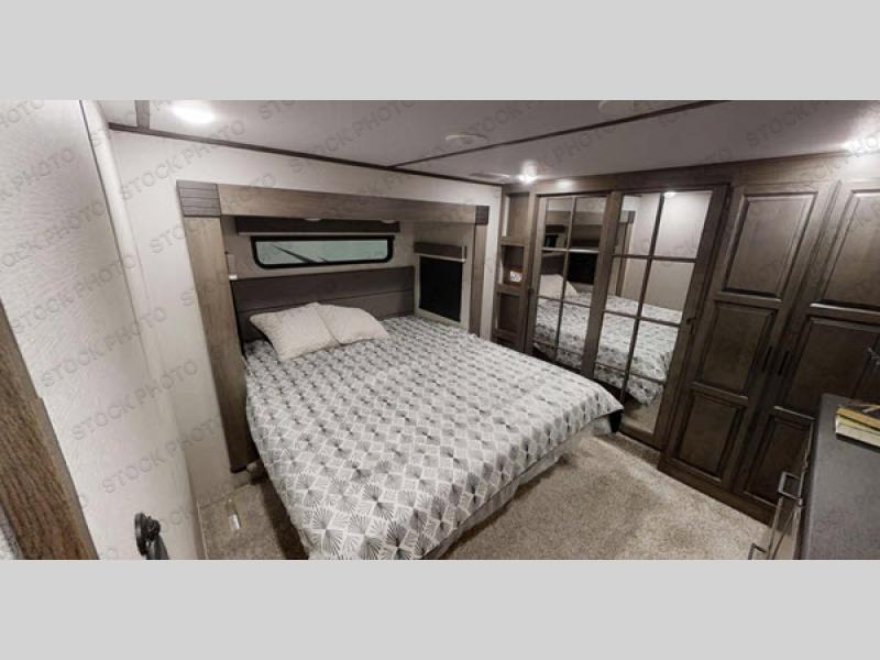Experience luxury at every turn in this spacious fifth wheel that can sleep four people each night. You and your spouse will love the front private bedroom with its slide out king bed, large front wardrobe with solid wood sliding doors, and a space to add an optional washer and dryer if you choose. Your guests can sleep on the hide-a-bed sofa in the rear living area, and the 50" TV here will provide entertainment in the evenings. In the morning, the chef of the family can prepare breakfast on the three burner cooktop, or use the 30" microwave. The stainless steel sink with an extra deep bowl will make clean-up a breeze, and there is a hutch/buffet to store nice dishes. The king-size shower includes a seat, and you'll appreciate heat and A/C in the bath to keep you comfortable.