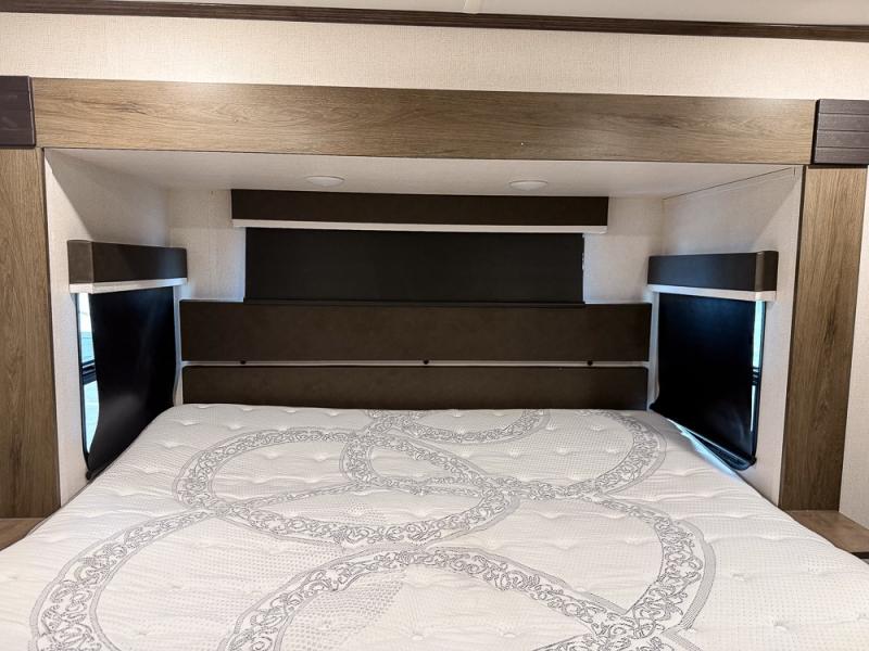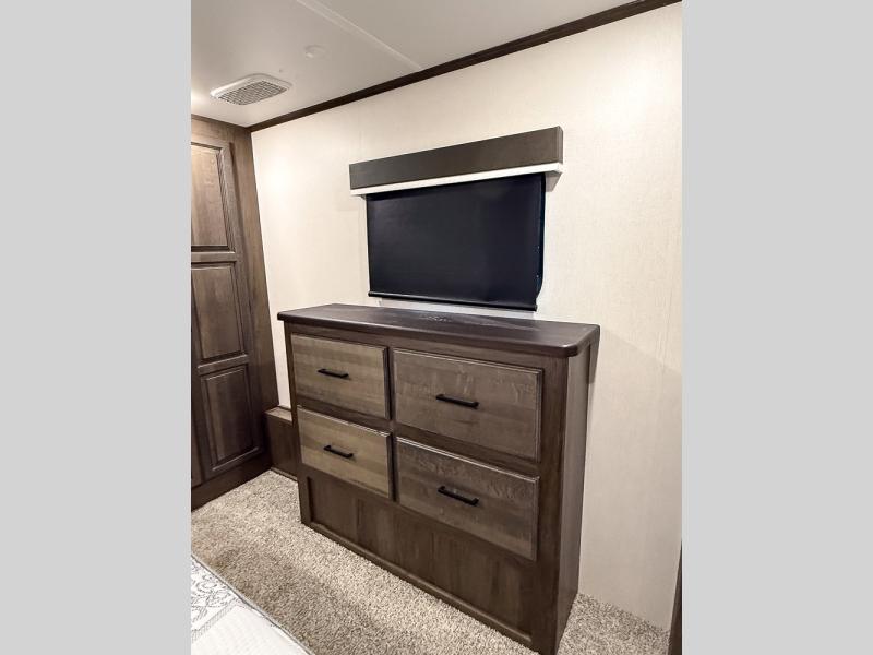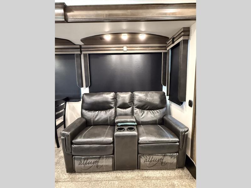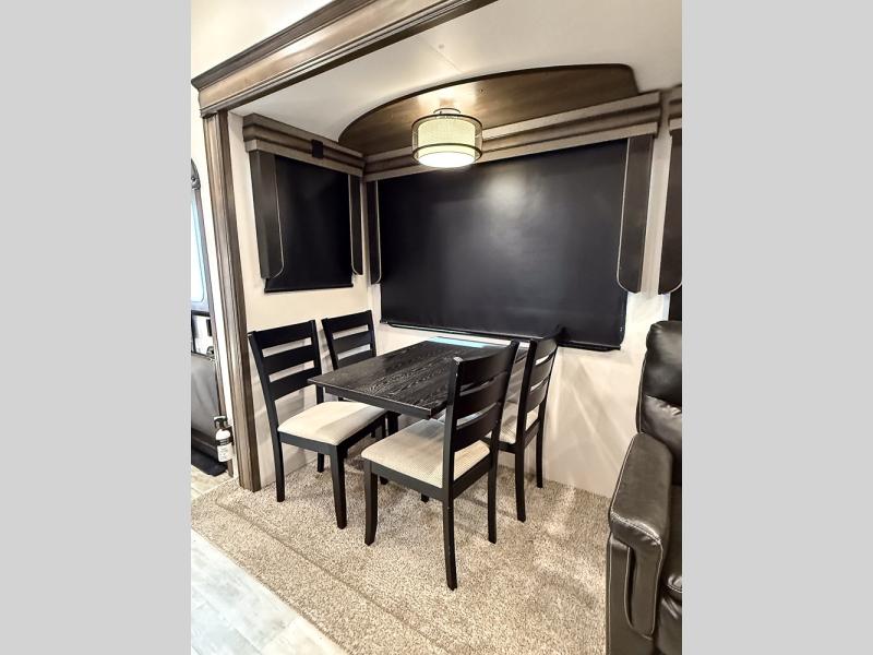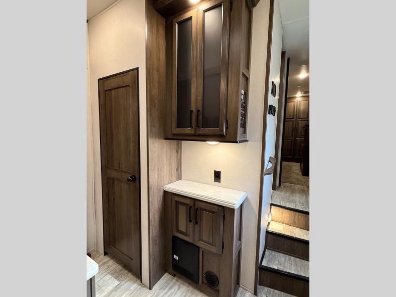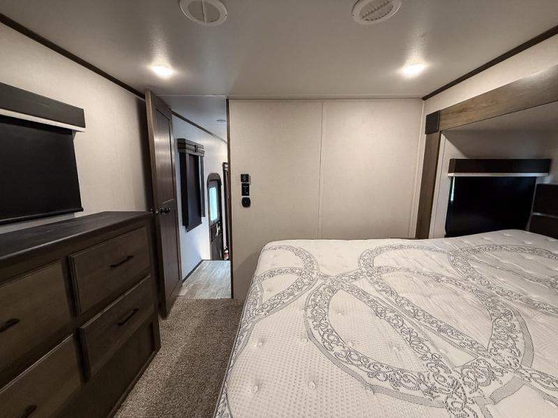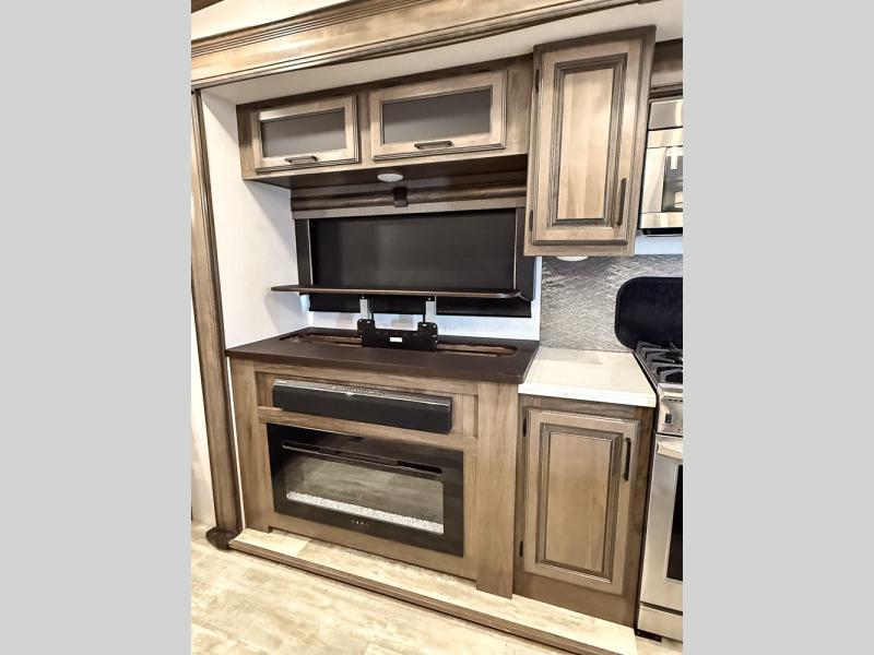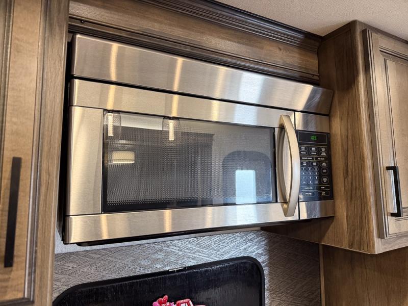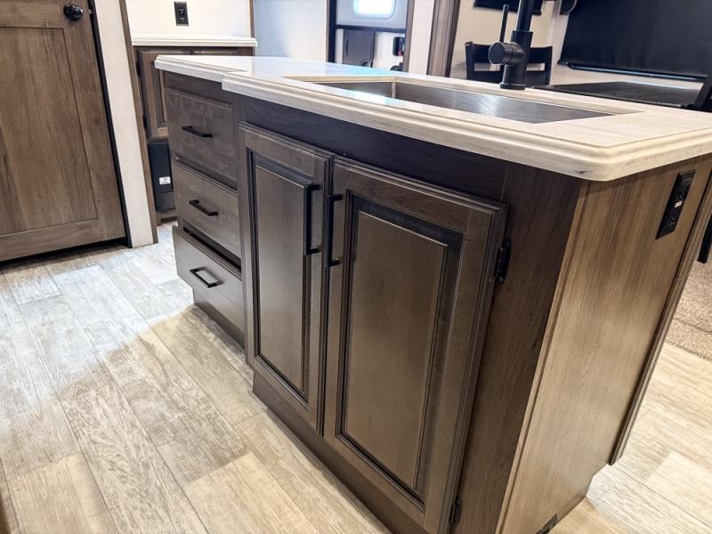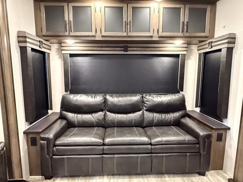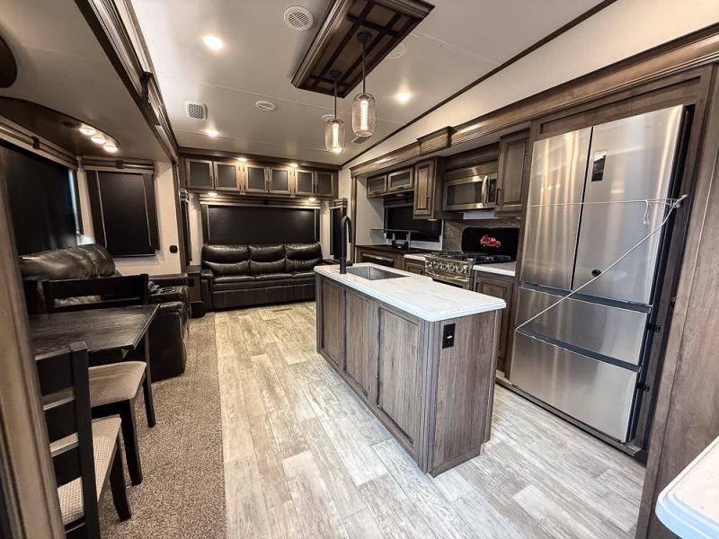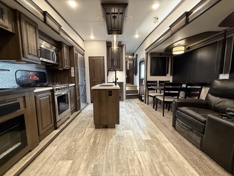 Pack your bags and hitch this fifth wheel up to have a fun getaway with your spouse! It features a front private bedroom with a 72" x 80" king bed across from a dresser with a TV prep above it and a front wardrobe with shelves which is also prepped to add an optional washer and dryer. The full bathroom has a linen closet next to the shower for you to easily grab a towel. Store your favorite snacks in the walk-in pantry, your nice dishes in the hutch, and keep your beverages cold in the 15 cu. ft. residential refrigerator. The kitchen island will make meal prep and cleaning up a breeze with a double sink. When mother nature rains on your parade, relax inside on either the hide-a-bed sofa or the 65" theater seating across from the entertainment center with a fireplace and a pop-up TV!