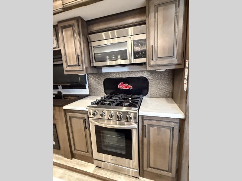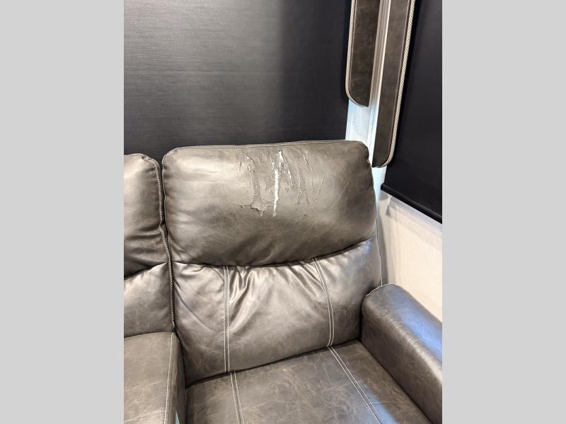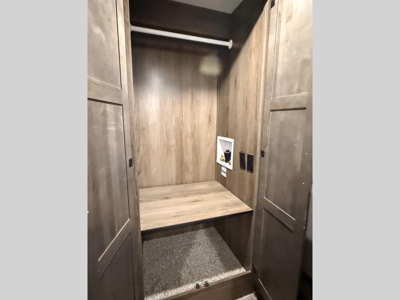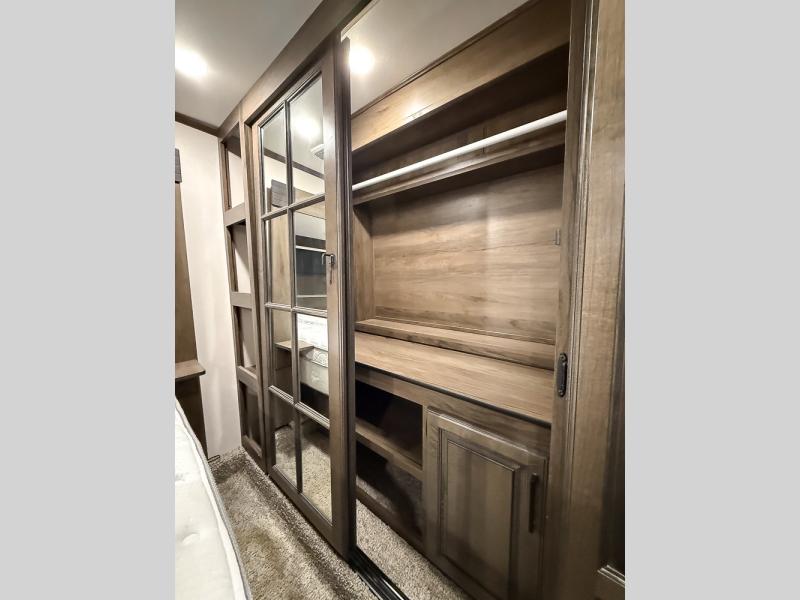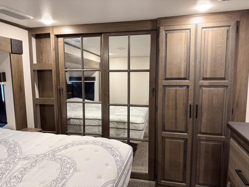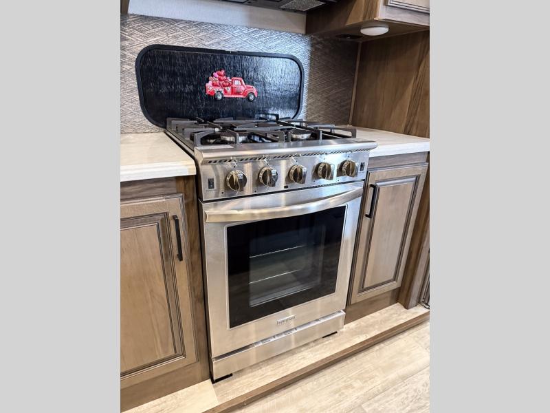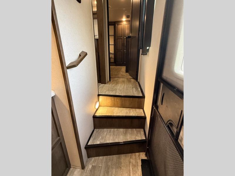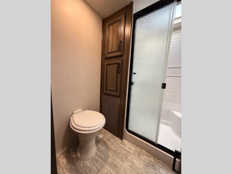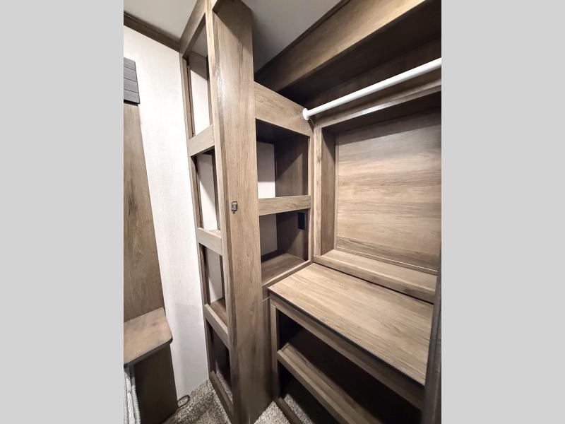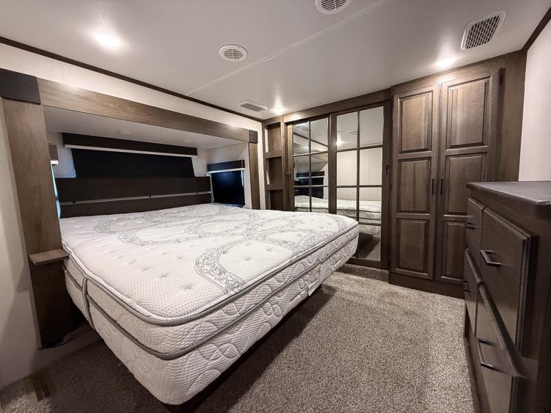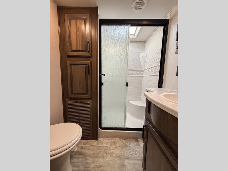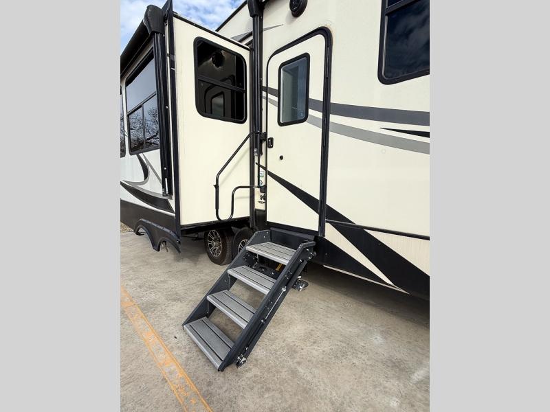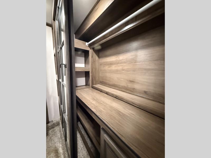 Pack your bags and hitch this fifth wheel up to have a fun getaway with your spouse! It features a front private bedroom with a 72" x 80" king bed across from a dresser with a TV prep above it and a front wardrobe with shelves which is also prepped to add an optional washer and dryer. The full bathroom has a linen closet next to the shower for you to easily grab a towel. Store your favorite snacks in the walk-in pantry, your nice dishes in the hutch, and keep your beverages cold in the 15 cu. ft. residential refrigerator. The kitchen island will make meal prep and cleaning up a breeze with a double sink. When mother nature rains on your parade, relax inside on either the hide-a-bed sofa or the 65" theater seating across from the entertainment center with a fireplace and a pop-up TV!