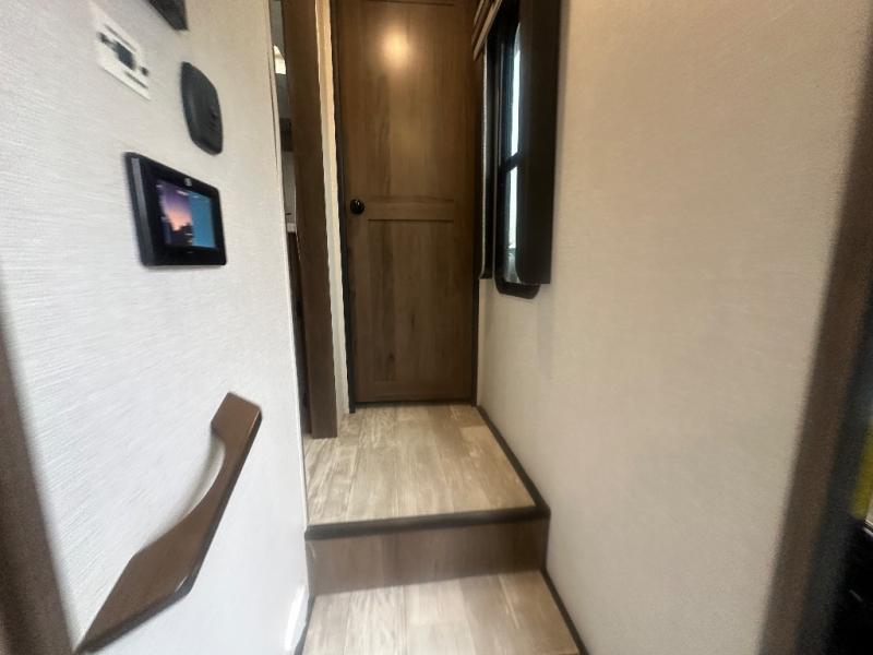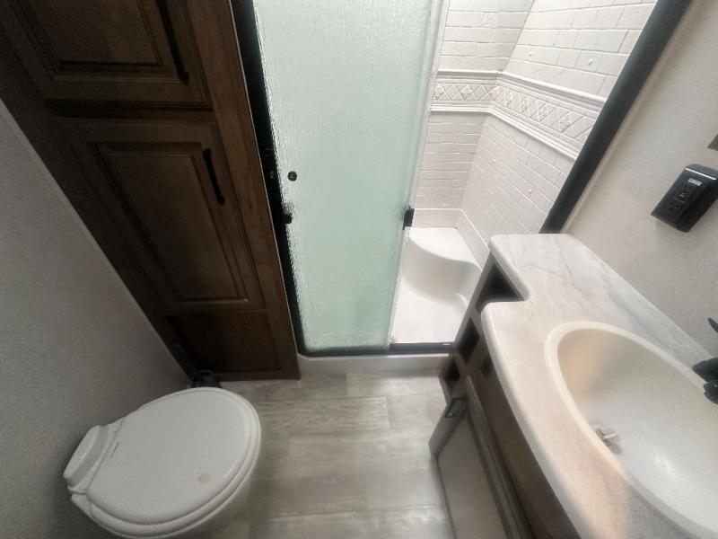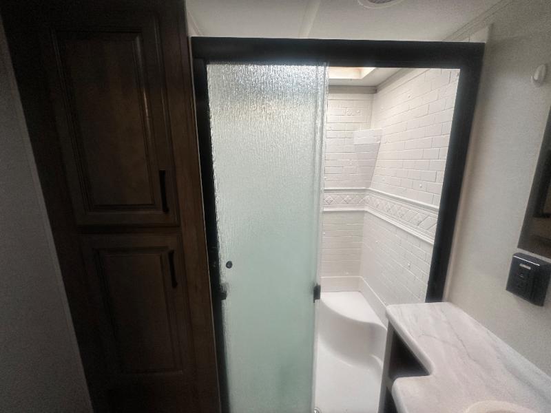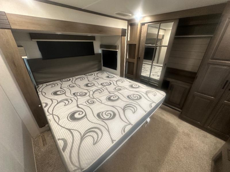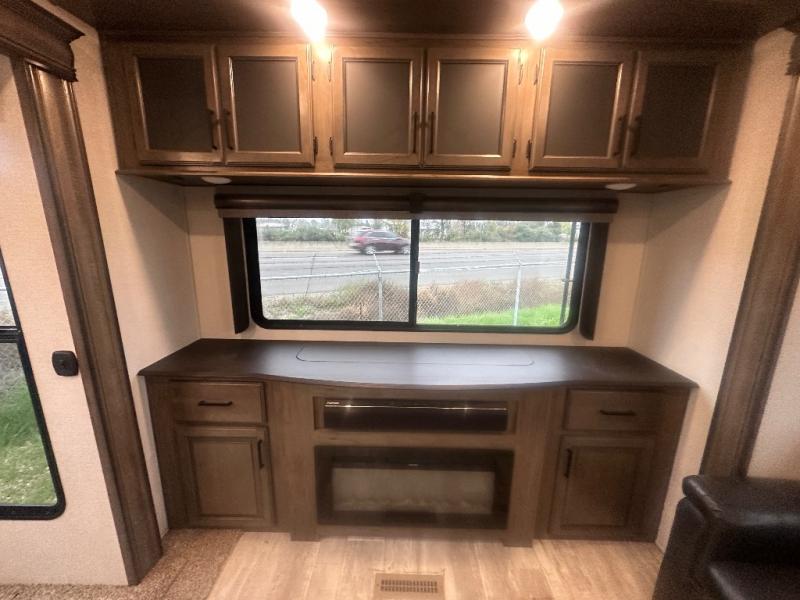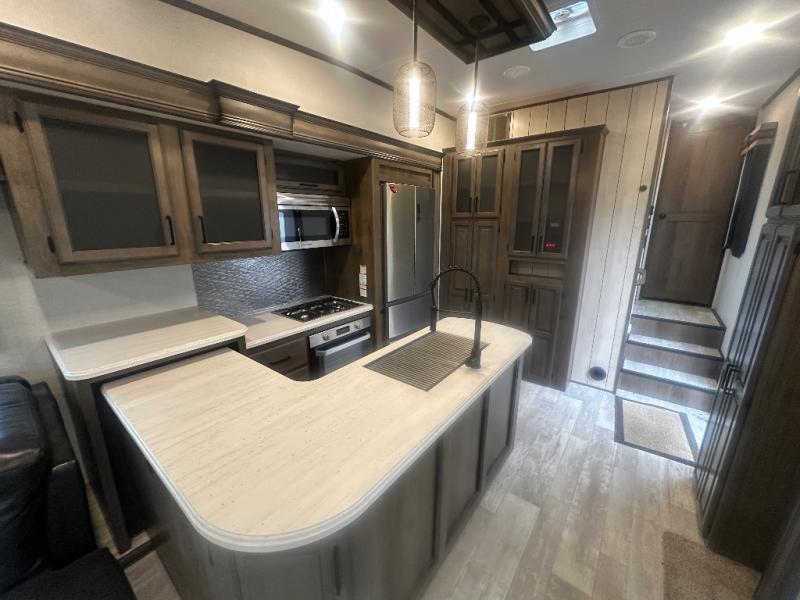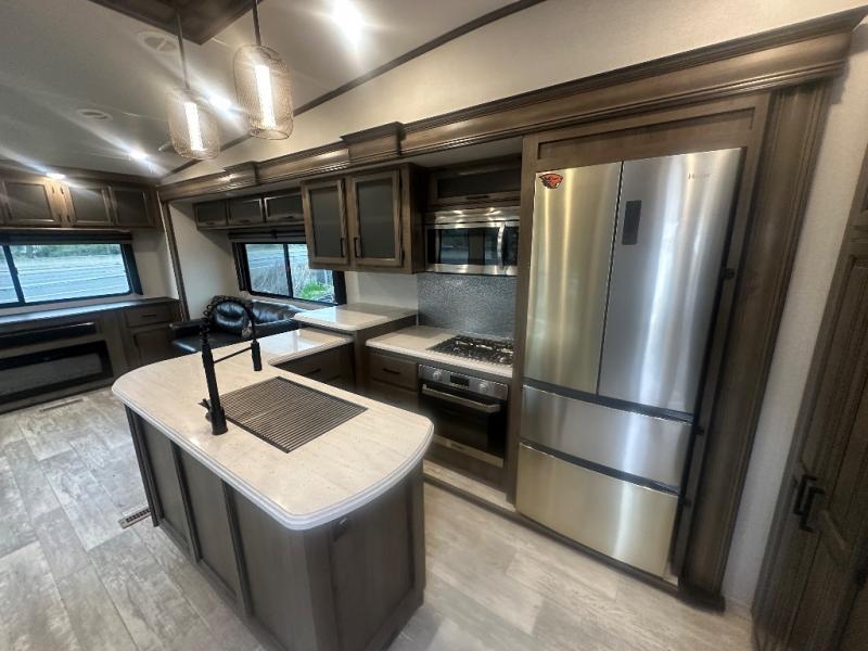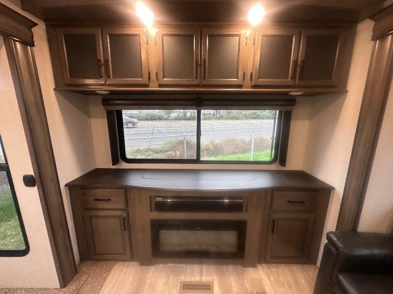 You won't be left wanting for any amenities in this comfortable fifth wheel. Once you arrive at your destination, your crew can relax in the rear living area that includes a rear entertainment center with a 50" TV on lift. The dual recliners, hide-a-bed L-shaped sofa, and dinette with chairs will provide seating for everyone, and the chef of the family can easily prepare meals in the spacious kitchen. There is a closet and a pantry to store paper goods and snacks, a residential refrigerator, and a Furrion oven and cooktop to make meals each day. After you've explored all day, freshen up in the full bath with a 40" shower with a seat, a deluxe "skyview" skylight, and a linen closet to store clean towels. The front private bedroom will feel like your own oasis with its slide out king bed, a large closet with shoe storage and sliding hardwood mirror doors, and a space to add an optional washer and dryer!