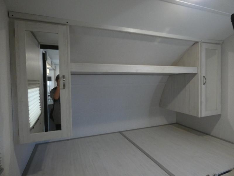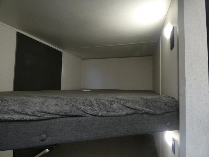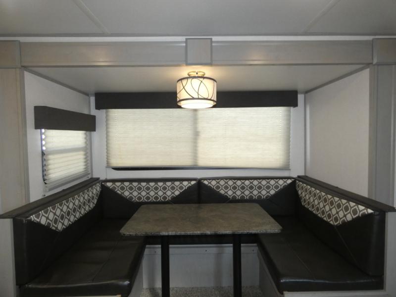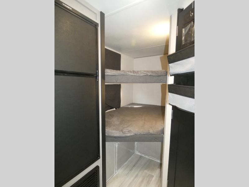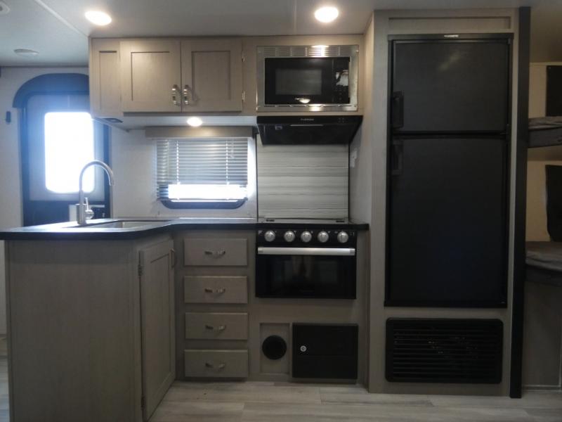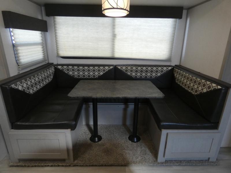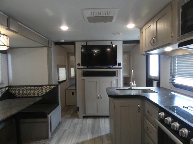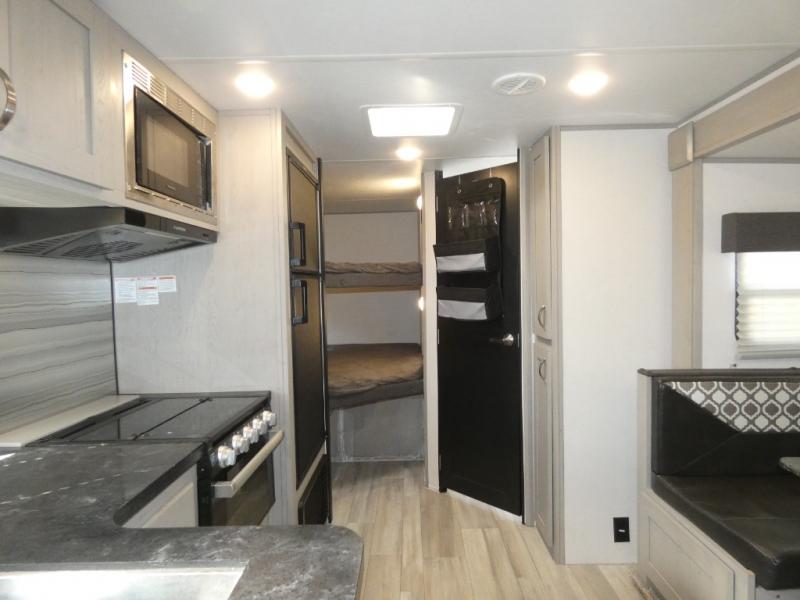 Camping with friends has never been easier than in this travel trailer that can sleep eight people each night. The front private bedroom includes a queen bed and dual wardrobes for all your belongings. The kids can claim the double-size bunks all to themselves, and any other guests can sleep on the U-Shaped dinette. The chef of the family can prepare breakfast outdoors on the outside kitchen, and even if it's raining, they'll have the 19' power awning to protect them.