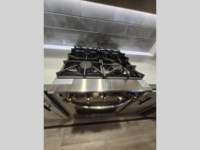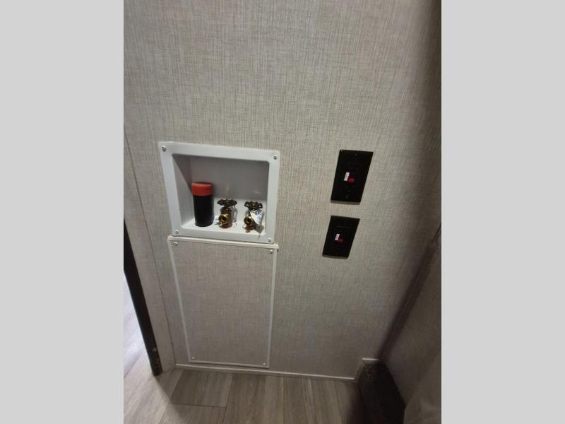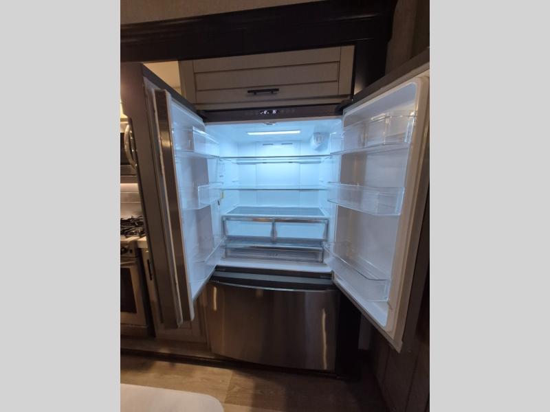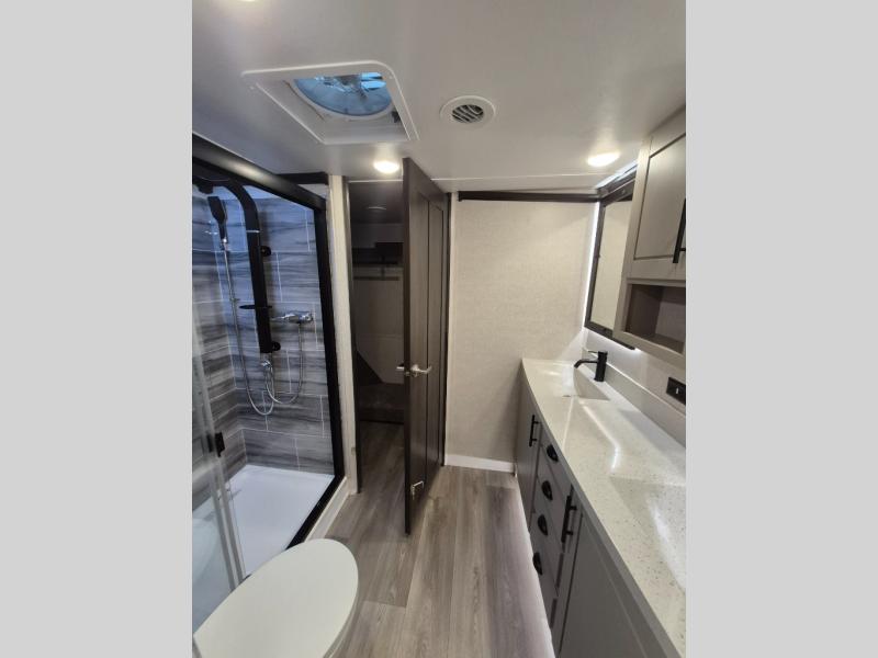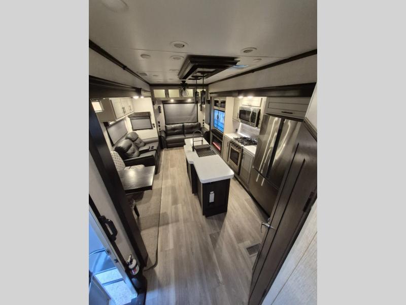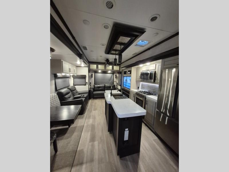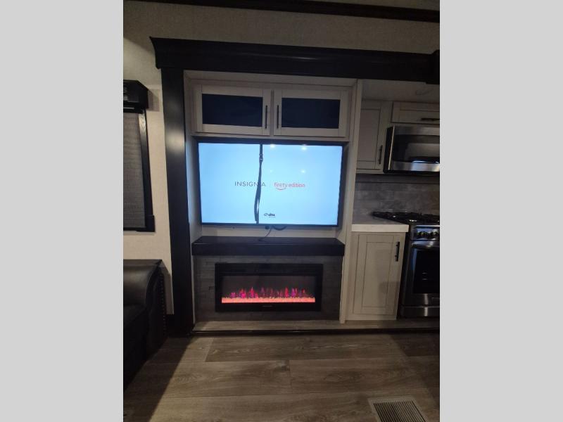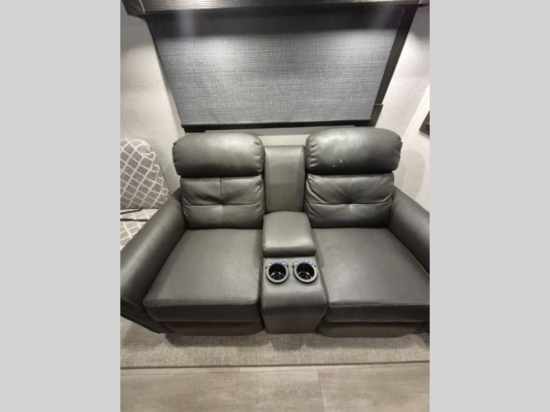 You will love all of the amenities in this Redwood fifth wheel, from the bath and a half that is super convenient for your family, to the comfortable rear living area with a 55" TV. You'll love the kitchen with residential appliances as well as an island for easy meal prep. When you are ready to relax for a bit in the evening, kick back on the theater seats or the 80" sofa. This unit features a front master suite that includes a full bath with a double-sink vanity, a 39" TV, and a large walk-in closet with a stacked washer and dryer! This fifth wheel has everything you need for your next journey!