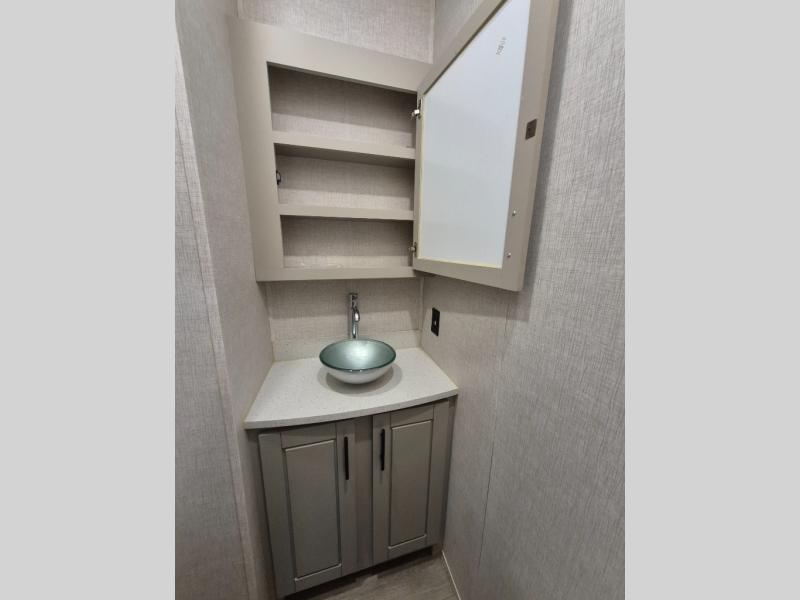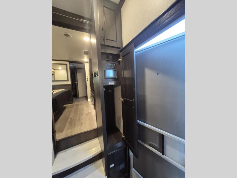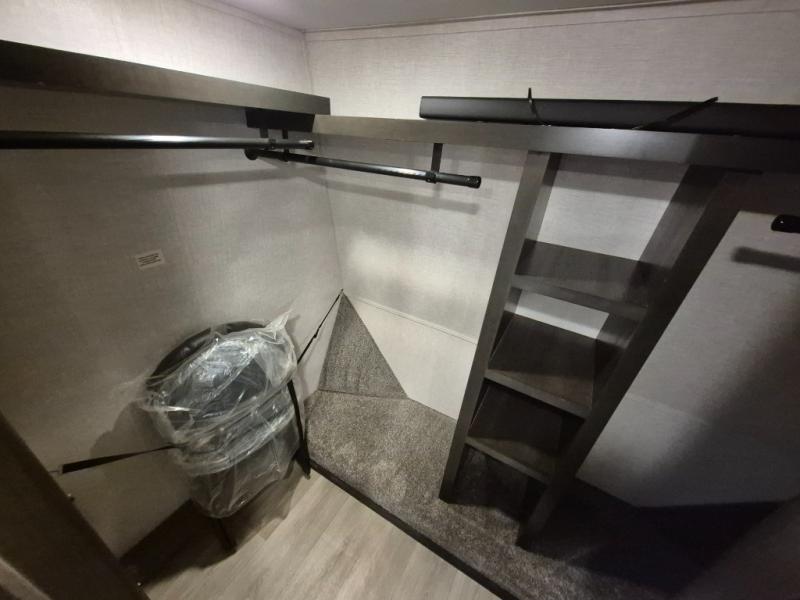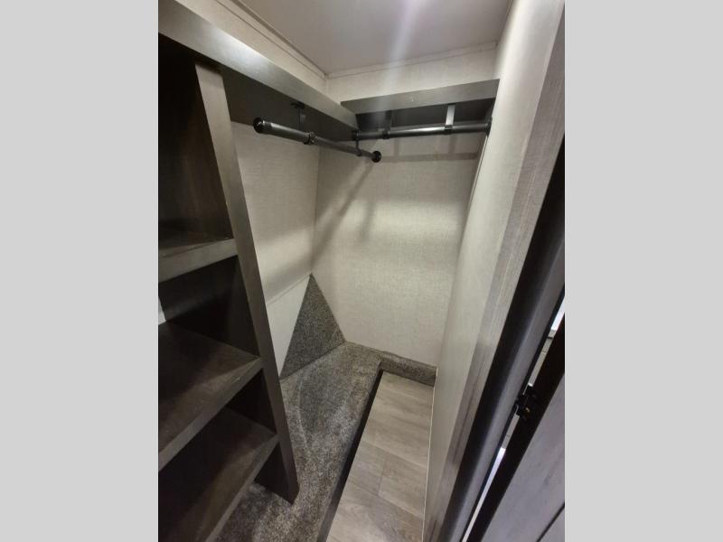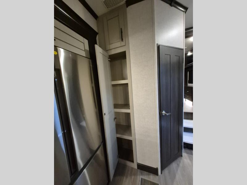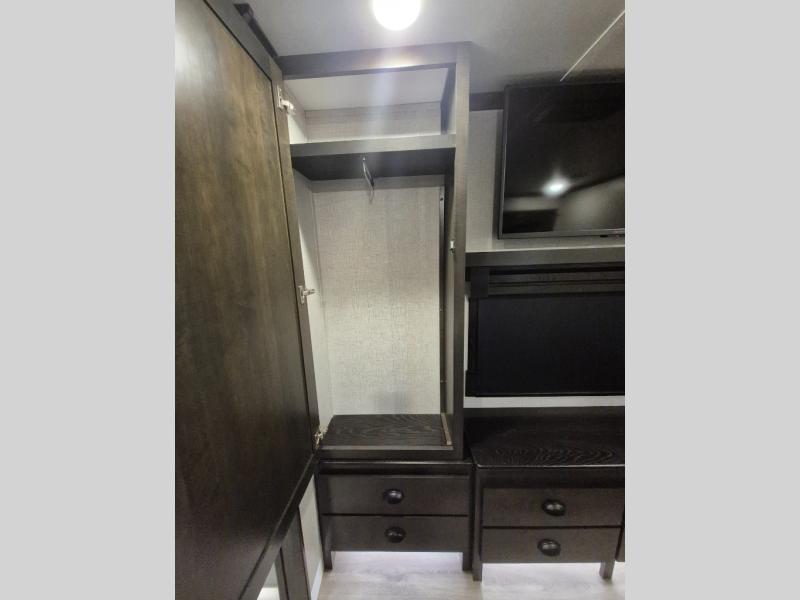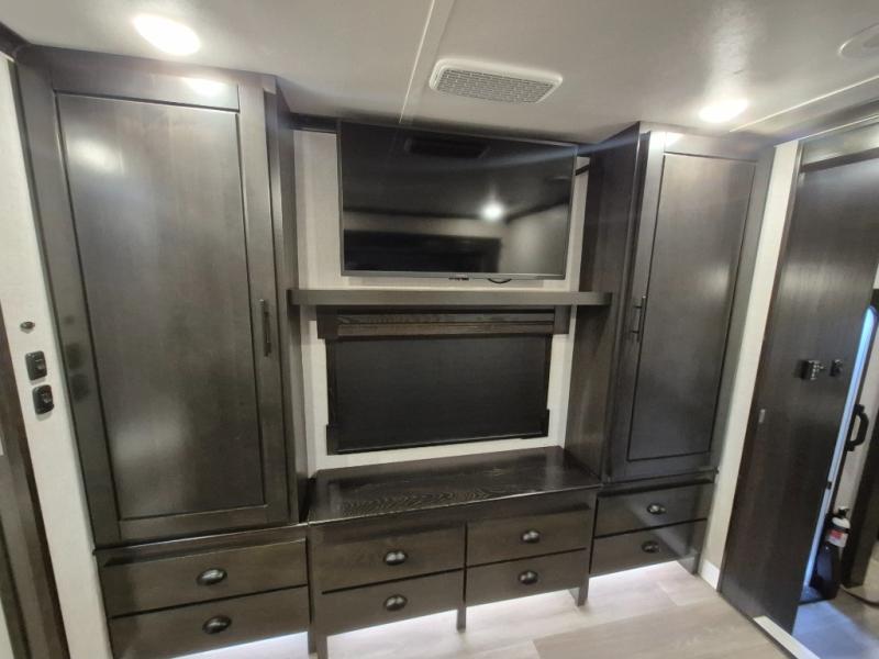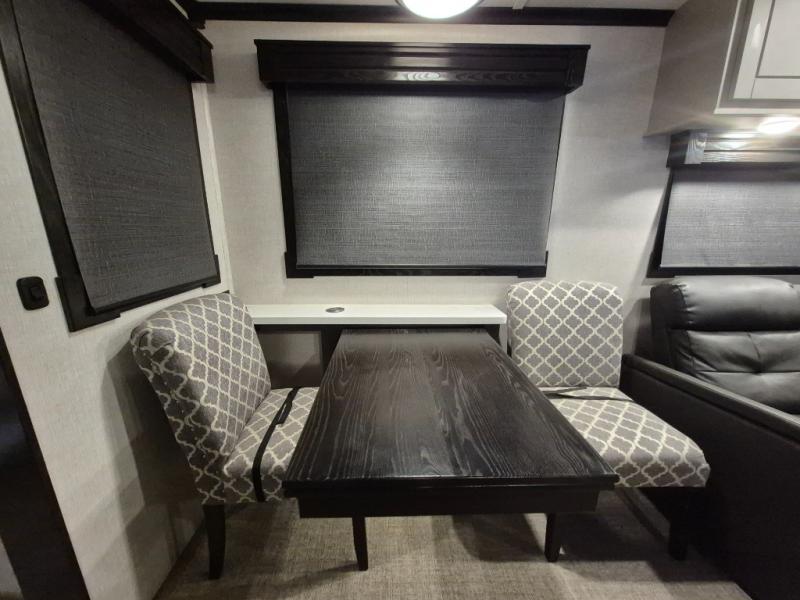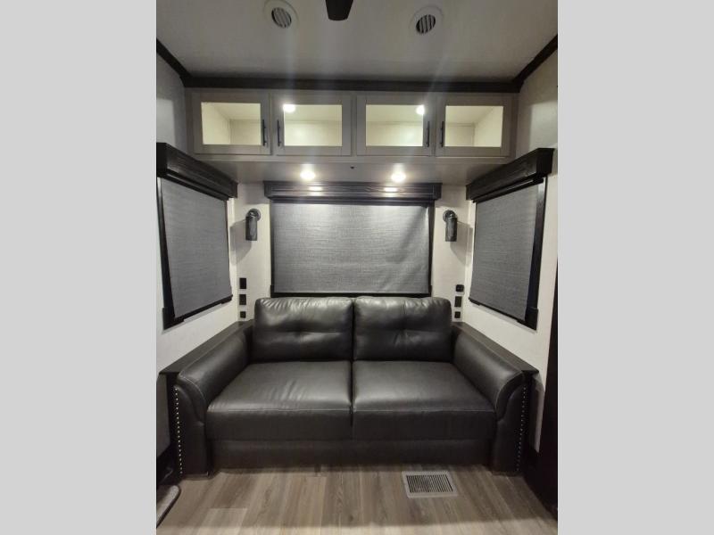 You are going to wish you found the Redwood fifth wheels sooner! With all of the residential comfort and modern luxury, you will be impressed. The Williamsburg Furniture Collection includes two premium dinette chairs, a buffet-style adjustable dinette with leaf extension, a residential-style sofa, and powered theater seating. The luxury further extends to the bedroom where you will find a gel-foam king bed with tilt and C-PAP shelves on both sides of the bed. The straight roof line gives a luxury profile, and there are preparations for a wireless backup camera as well as solar power. The seamless residential insulated heat ducts will efficiently heat your unit, and there is an exterior radio in the fully finished and heated pass-through with slat board storage.