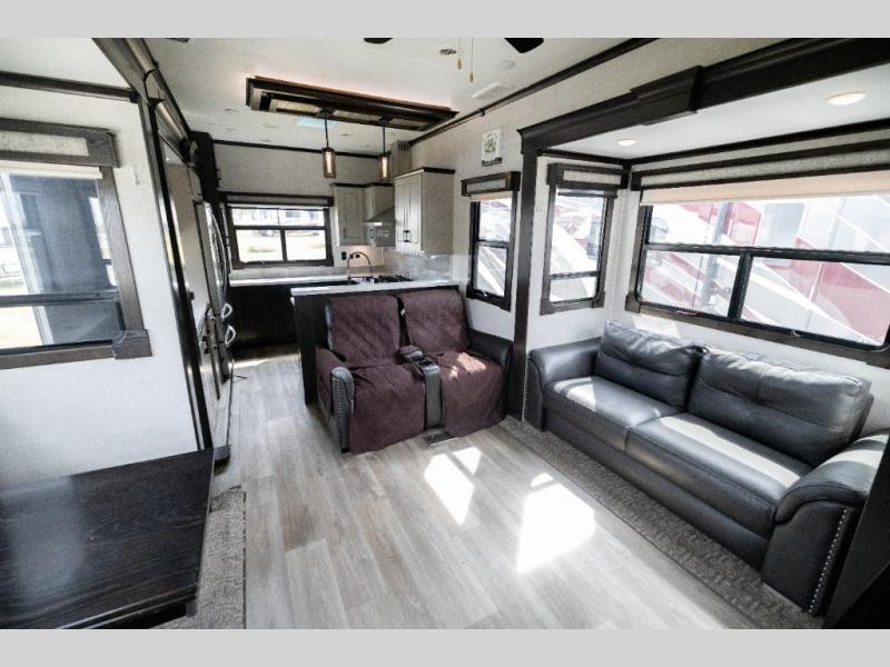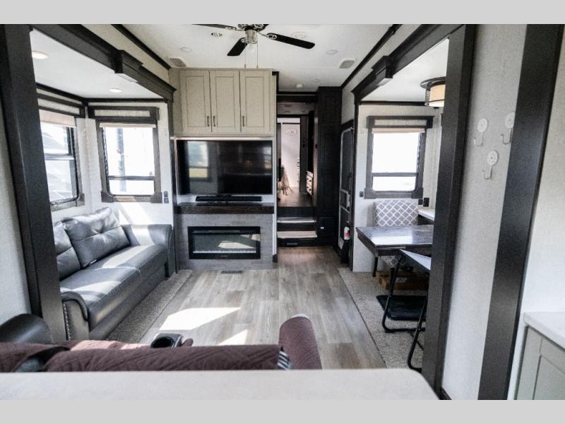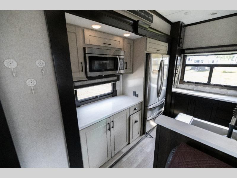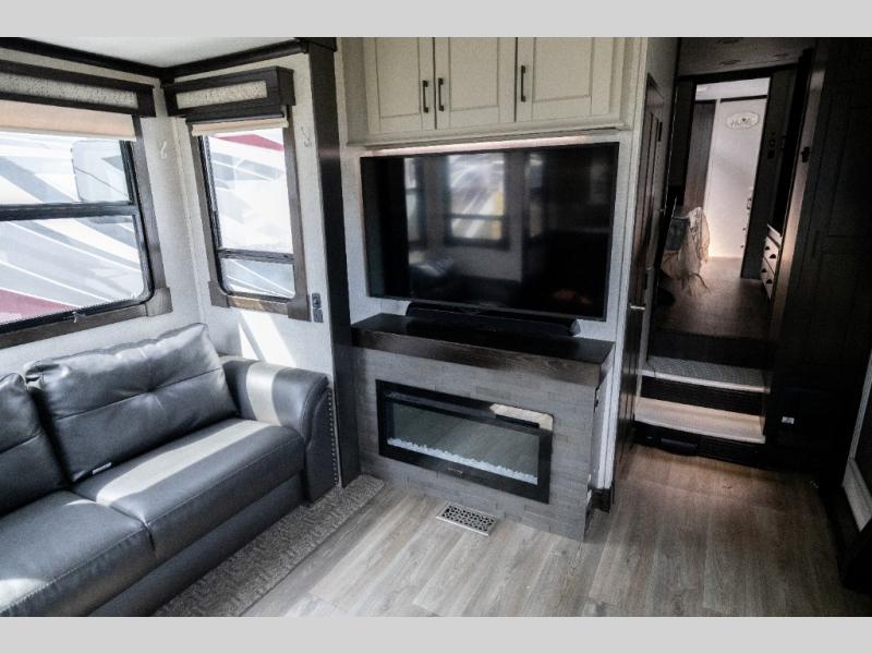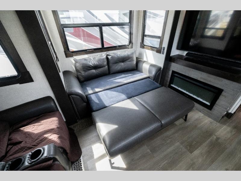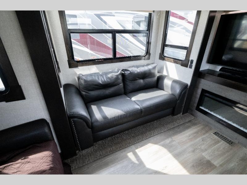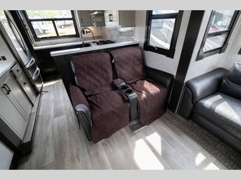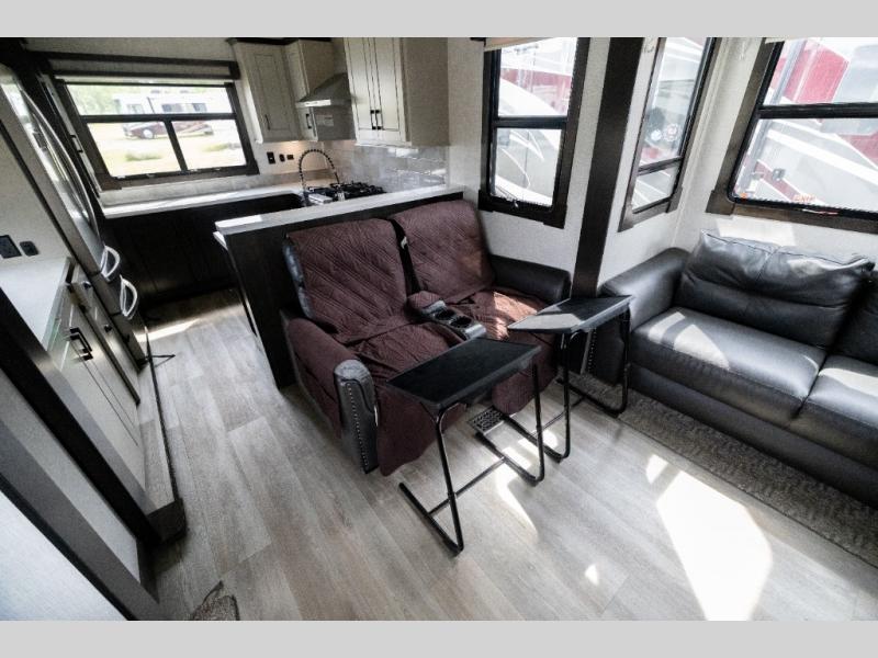 One step inside this fifth wheel and you'll see why it's an award-winning most-popular unit! You'll love the rear kitchen that includes ample counter space and a waterfall edge countertop. Head to the main living area where you can enjoy some family time on the theater seats, and the dinette with chairs will be the perfect place for a game of cards. The half bath is right off of this room for convenience, and your guests or kids can convert the tri-fold sofa into a bed for sleeping space at night. You will love the master bedroom with a king bed slide out, a dresser with a flip-up lid, plus a 39" LED HDTV. The front full bath is spacious, and it includes a large wardrobe where you can even add an optional washer and dryer if you choose!