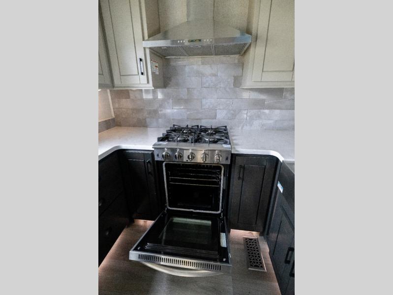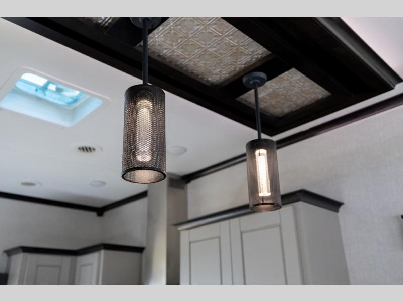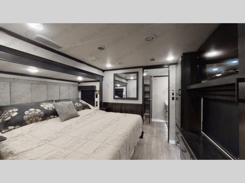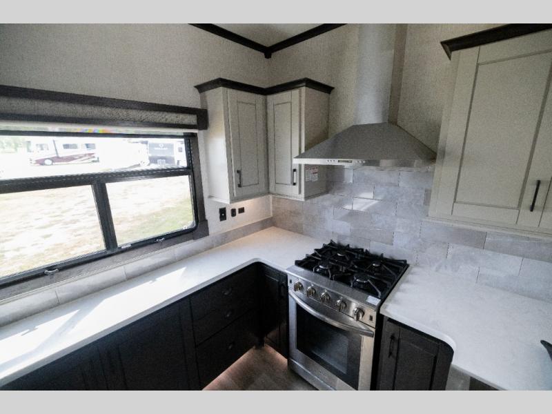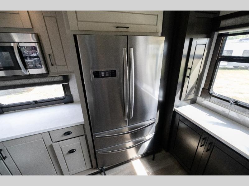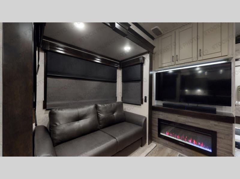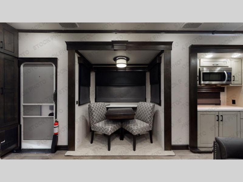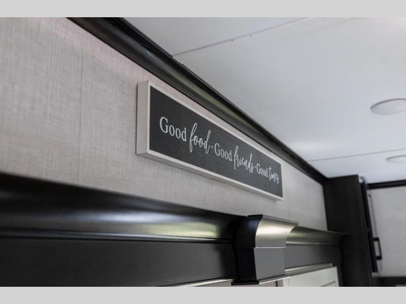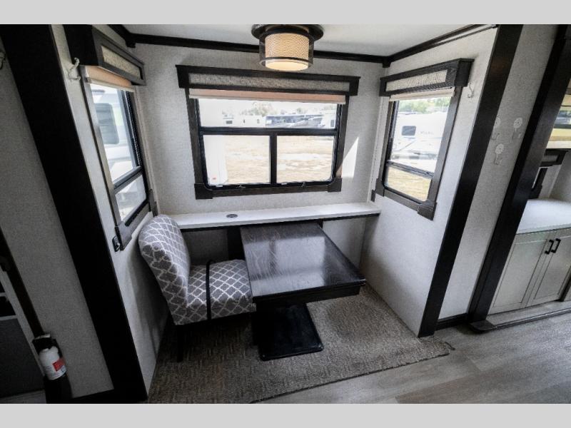 One step inside this fifth wheel and you'll see why it's an award-winning most-popular unit! You'll love the rear kitchen that includes ample counter space and a waterfall edge countertop. Head to the main living area where you can enjoy some family time on the theater seats, and the dinette with chairs will be the perfect place for a game of cards. The half bath is right off of this room for convenience, and your guests or kids can convert the tri-fold sofa into a bed for sleeping space at night. You will love the master bedroom with a king bed slide out, a dresser with a flip-up lid, plus a 39" LED HDTV. The front full bath is spacious, and it includes a large wardrobe where you can even add an optional washer and dryer if you choose!