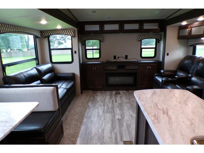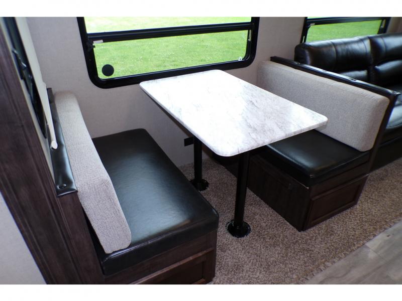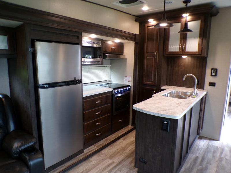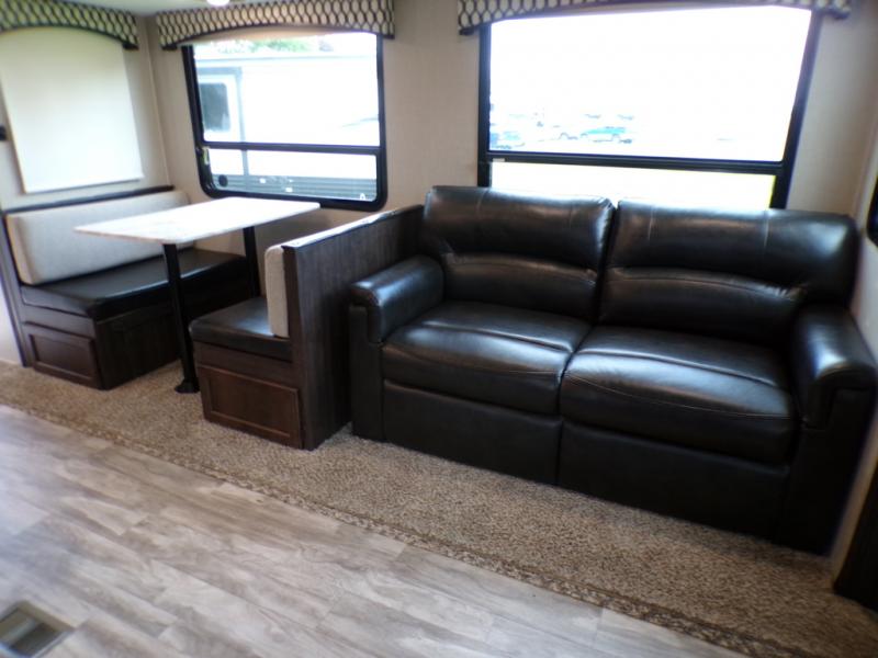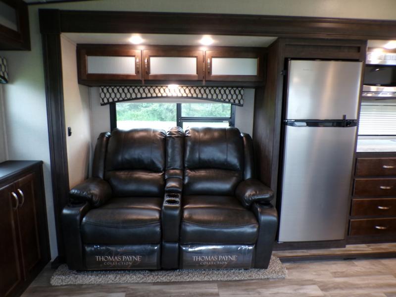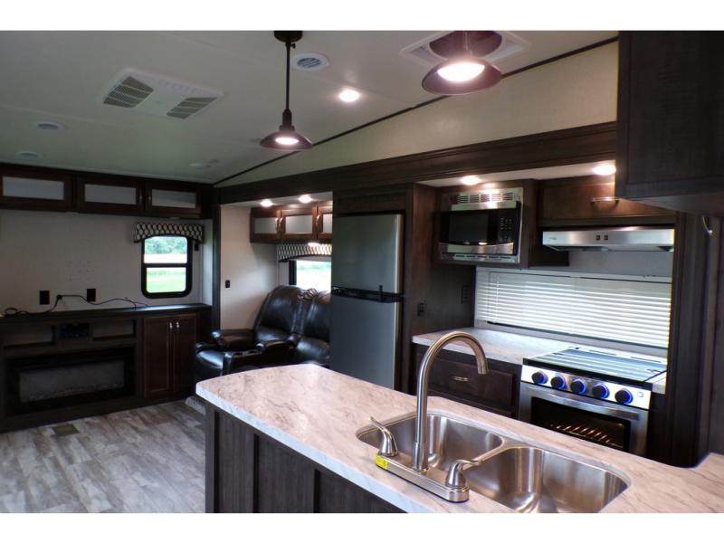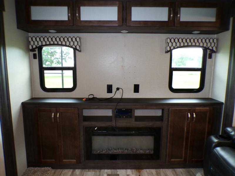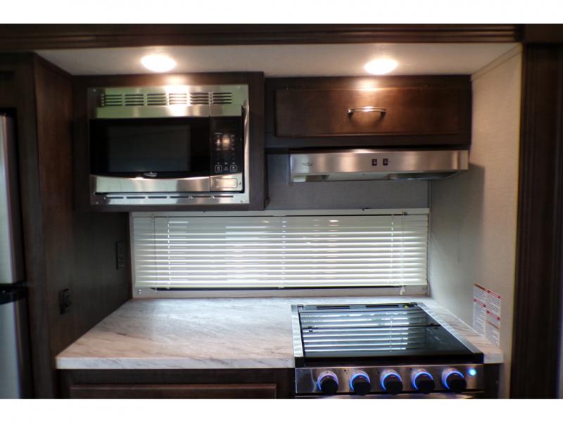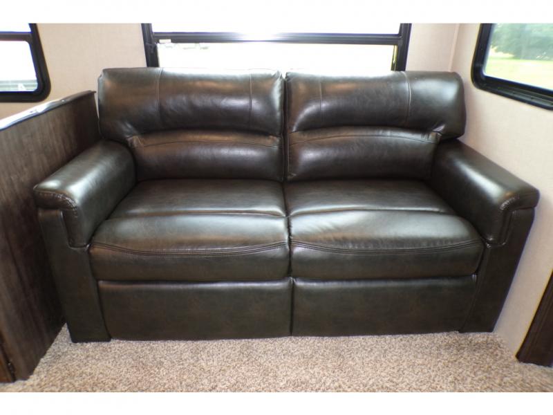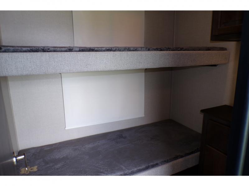 This fifth wheel is the perfect family-friendly RV since it has a master bedroom for mom and dad, and a private mid-bunkhouse for the kids. The bunkhouse includes a lower bunk and a flip-up bunk above, plus convenient shoe and overhead storage. The chef of the group can prepare breakfast on the residential cooktop, and everyone can dine at the booth dinette or outside under the 15' electric awning. The rear living area will be a favorite place to relax since it includes an entertainment center prepped to add your own 50-55" TV, a tri-fold sofa, plus theater seating.