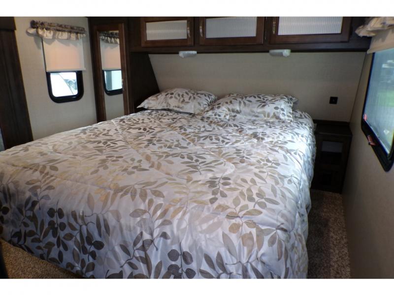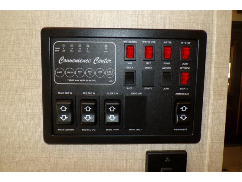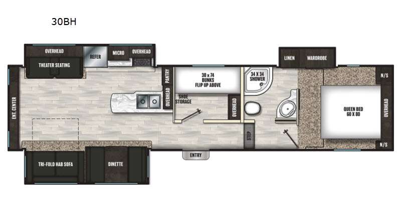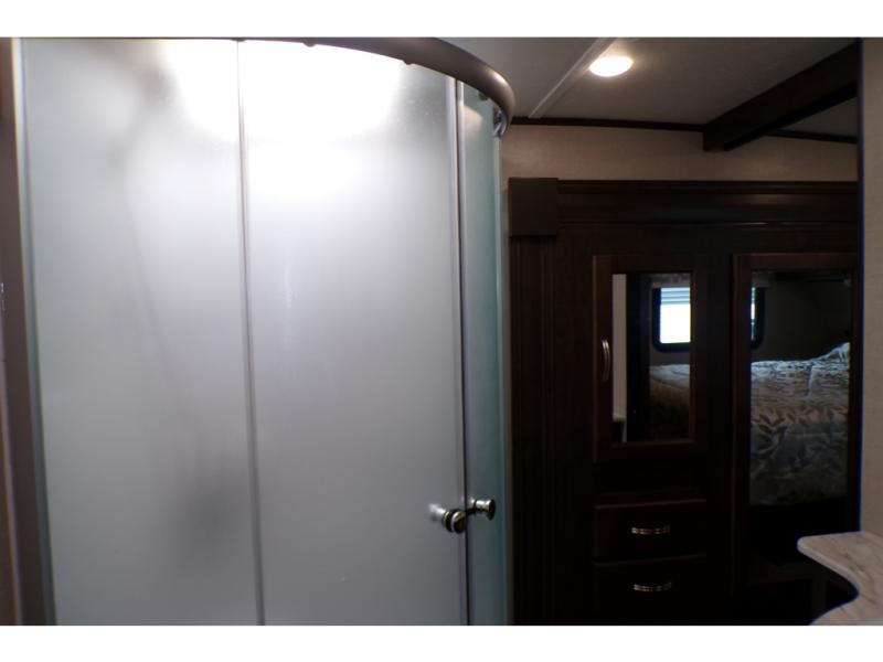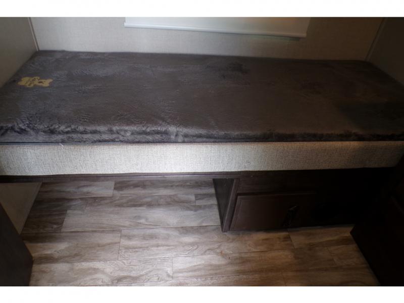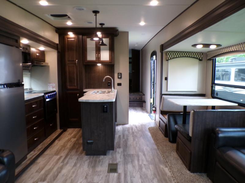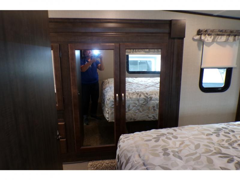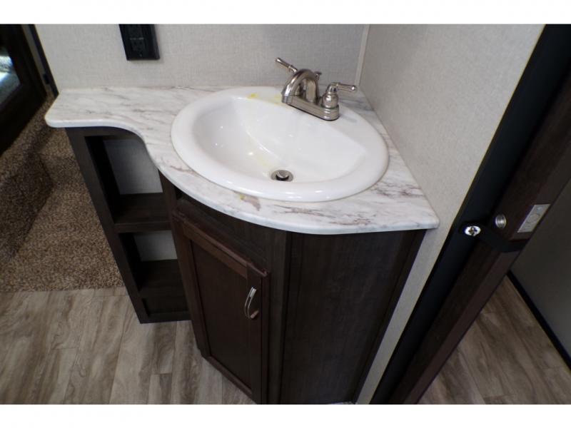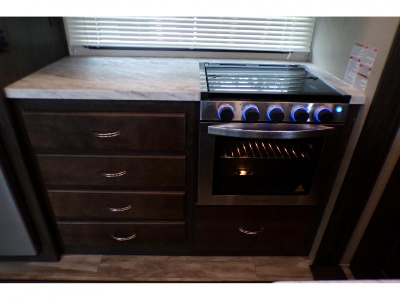 This fifth wheel is the perfect family-friendly RV since it has a master bedroom for mom and dad, and a private mid-bunkhouse for the kids. The bunkhouse includes a lower bunk and a flip-up bunk above, plus convenient shoe and overhead storage. The chef of the group can prepare breakfast on the residential cooktop, and everyone can dine at the booth dinette or outside under the 15' electric awning. The rear living area will be a favorite place to relax since it includes an entertainment center prepped to add your own 50-55" TV, a tri-fold sofa, plus theater seating.