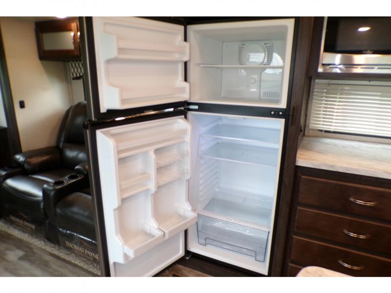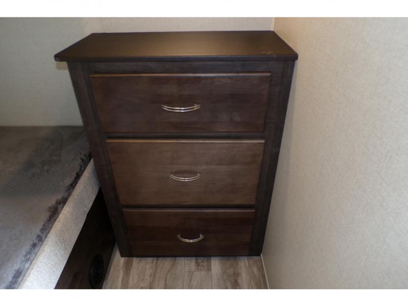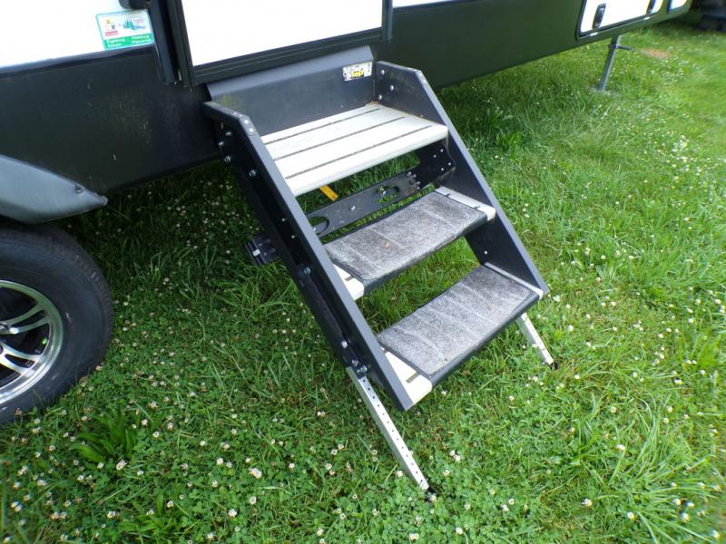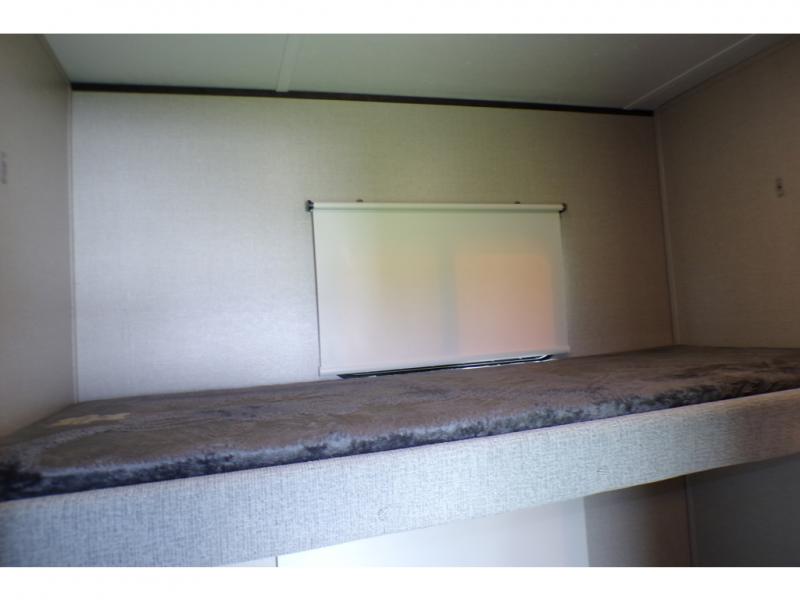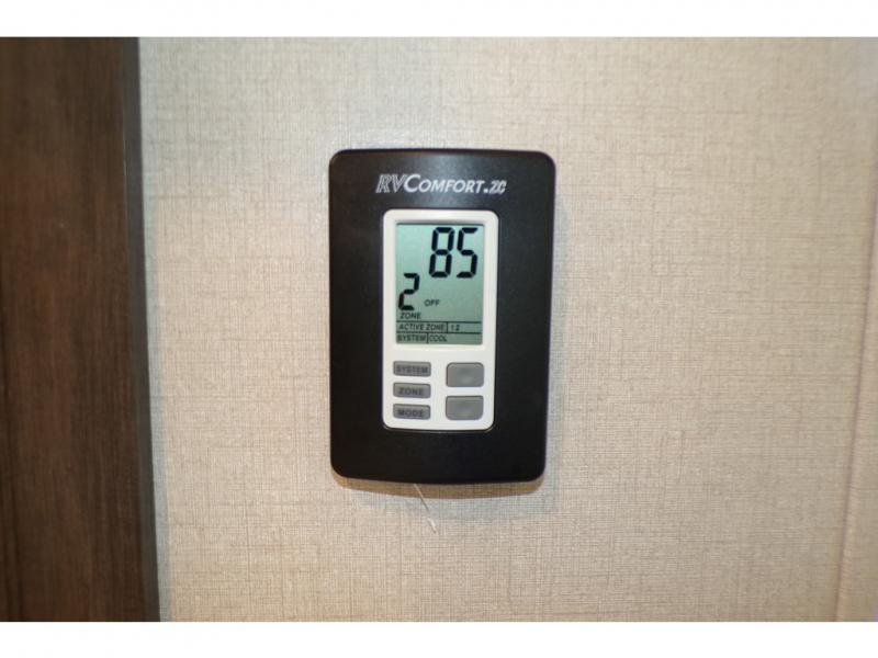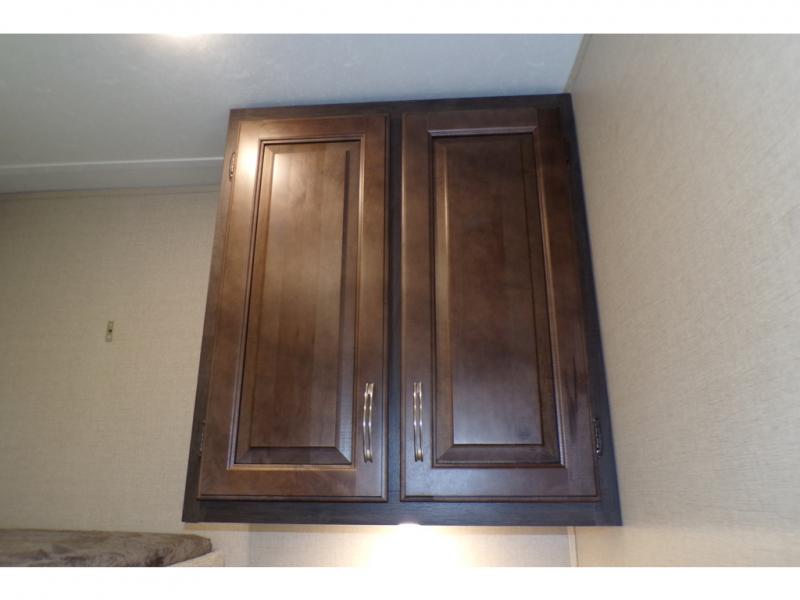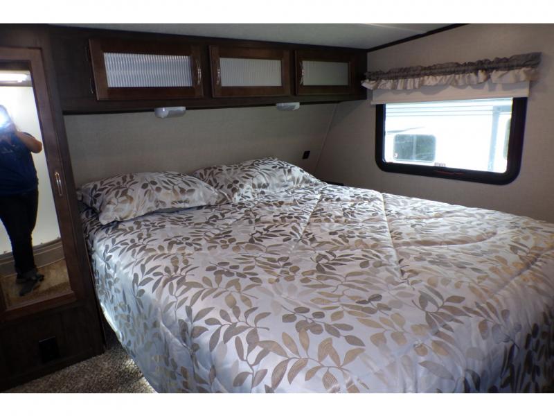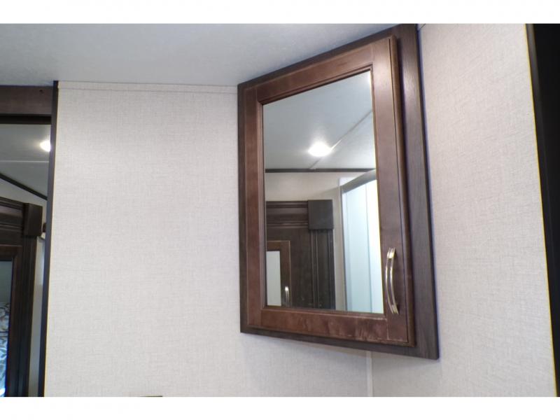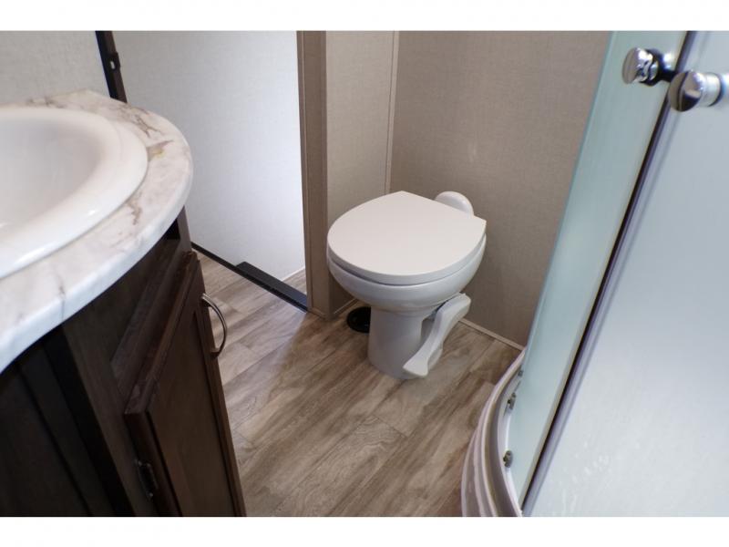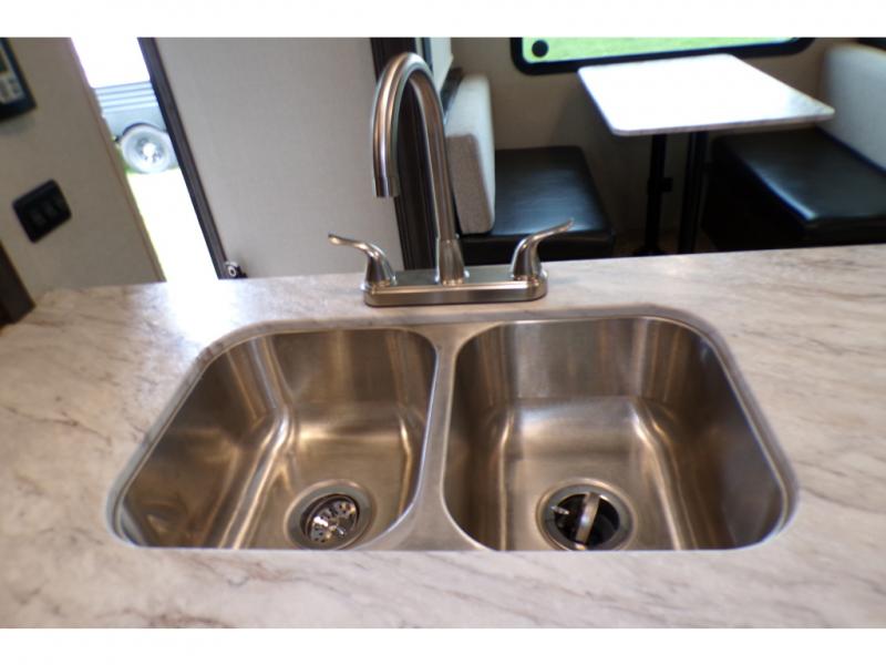 This fifth wheel is the perfect family-friendly RV since it has a master bedroom for mom and dad, and a private mid-bunkhouse for the kids. The bunkhouse includes a lower bunk and a flip-up bunk above, plus convenient shoe and overhead storage. The chef of the group can prepare breakfast on the residential cooktop, and everyone can dine at the booth dinette or outside under the 15' electric awning. The rear living area will be a favorite place to relax since it includes an entertainment center prepped to add your own 50-55" TV, a tri-fold sofa, plus theater seating.