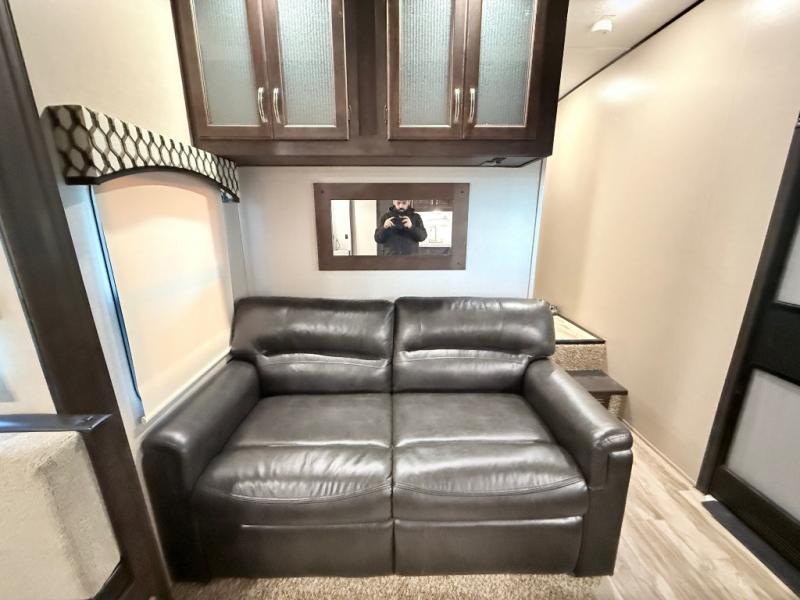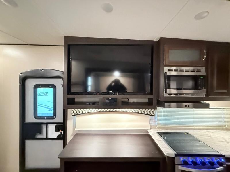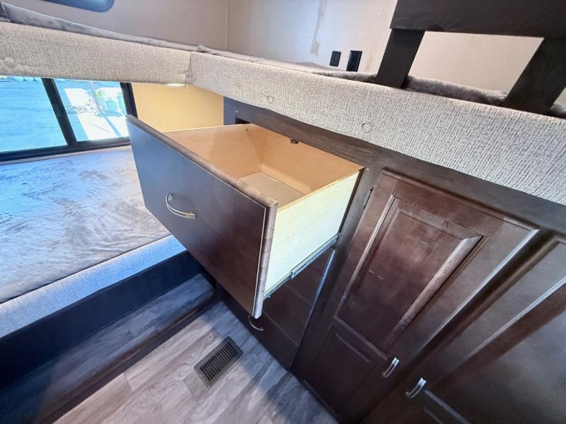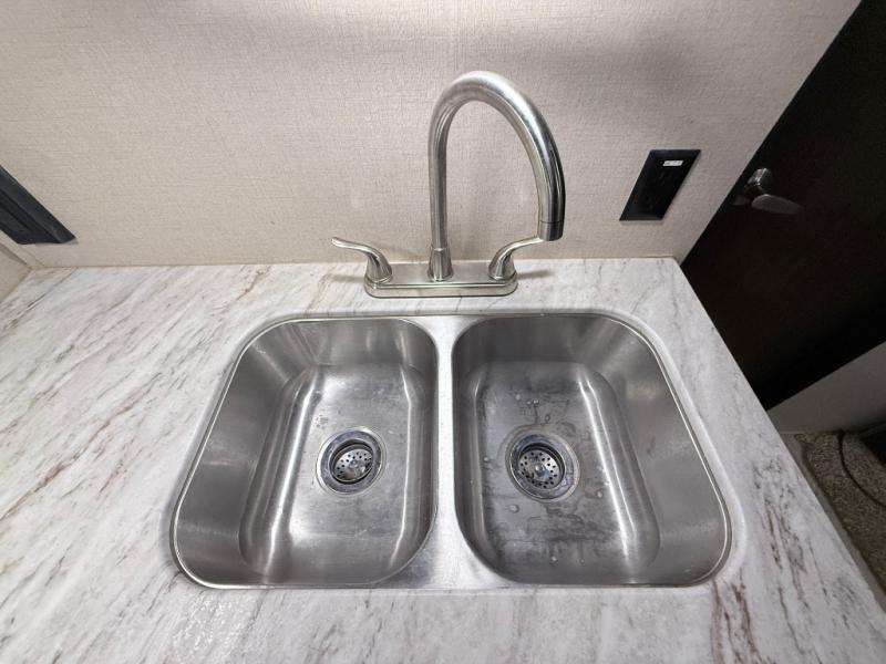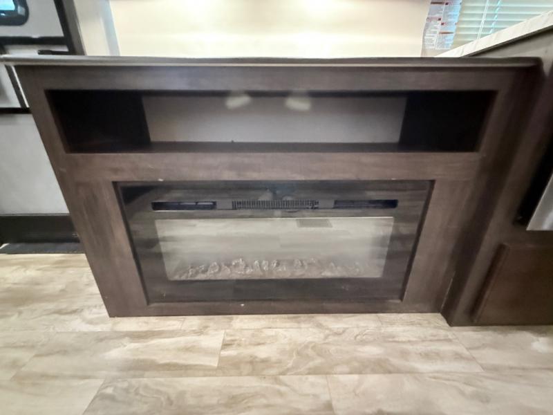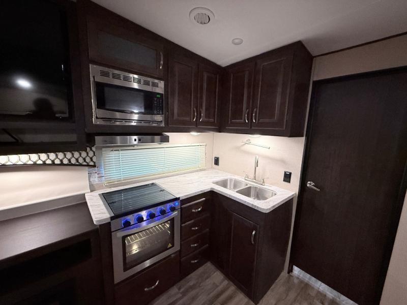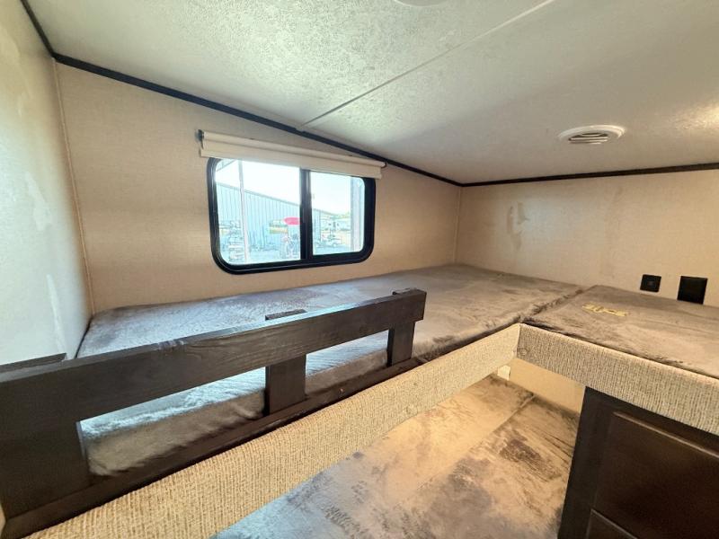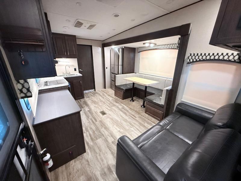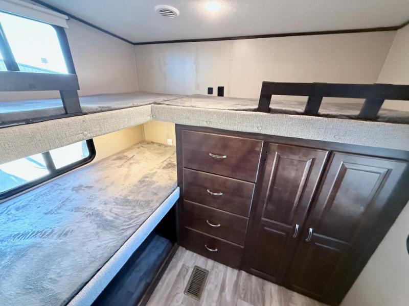 The whole family will love camping in this fifth wheel that can sleep nine people each night. The bunkhouse includes three bunks for the kids, and you and your spouse will love the front private bedroom for yourselves. There is also a tri-fold sofa and a U-shaped dinette in the living room for more sleeping space. You will have all the appliances needed to prepare meals each day, whether that be indoors, or outdoors on the outside kitchen. The full bath includes a shower with a seat for convenience and motion sensor lights for nighttime use!