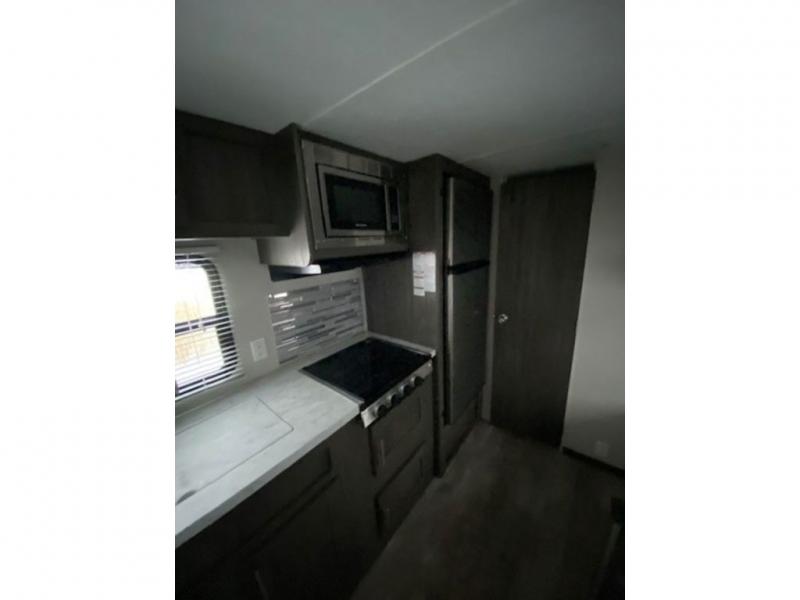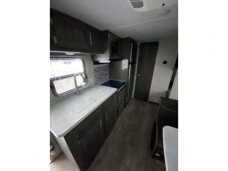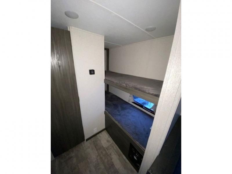 The kids or your friends will love camping in this travel trailer! It features a set of rear corner bunk beds with storage that are next to the full bathroom for easy access at night. There is also a 60" x 74" bed up front with an overhead cabinet, and the booth dinette can also transform into an extra sleeping space, plus it has an overhead entertainment. The kitchen has everything you will need to whip up a home cooked meal, as well as a microwave for those nights when you don't feel like cooking!