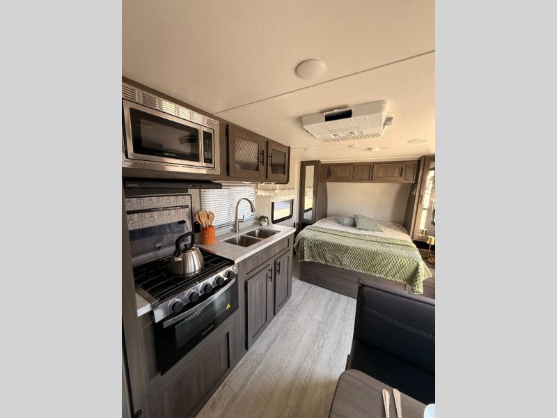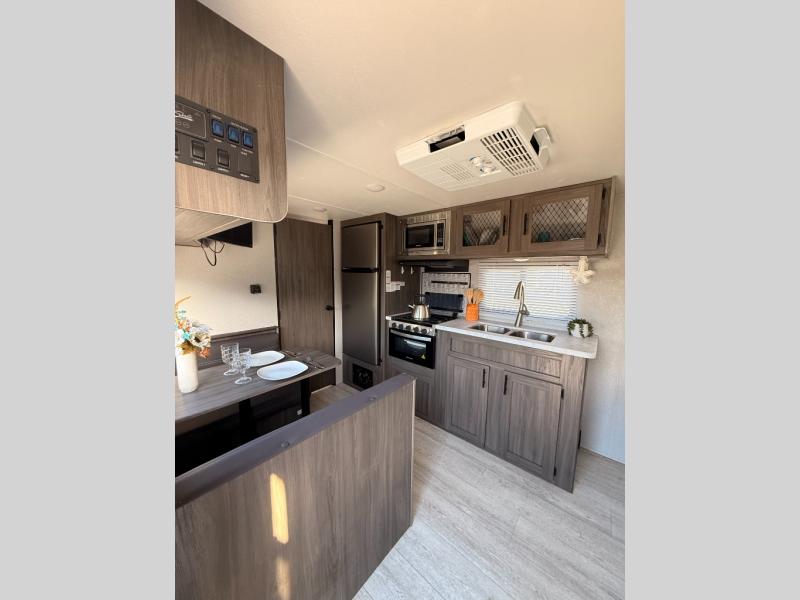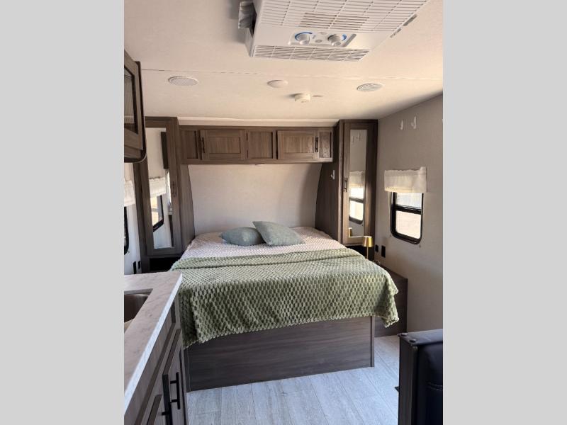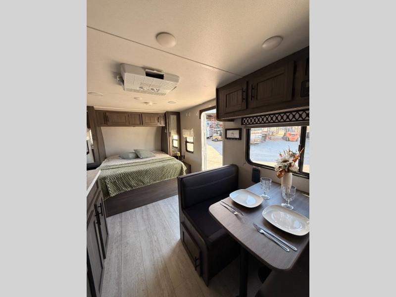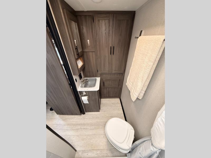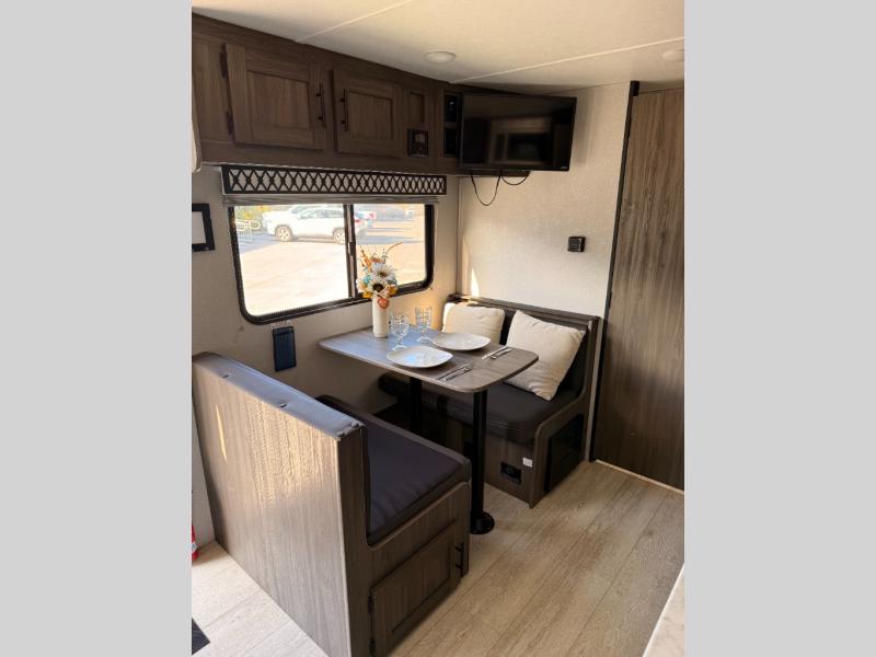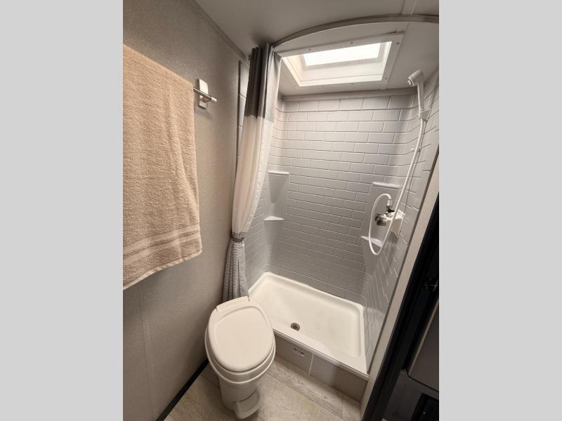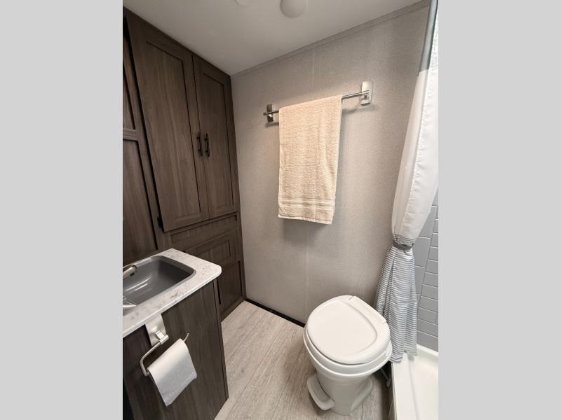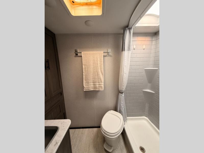 You will stay squeaky clean in the rear full bathroom of this travel trailer! The bathroom has a 24" x 40" shower with a powered roof vent and a large linen closet to store all of your towels. After you have prepared a delicious dinner with the three burner cooktop, you can can head to the booth dinette to enjoy it there and then play a card game. The front 60" x 74" bed has wardrobes on either side to keep your clothes looking their best and an overhead shelf for your convenience!