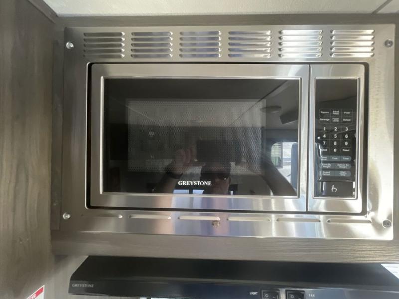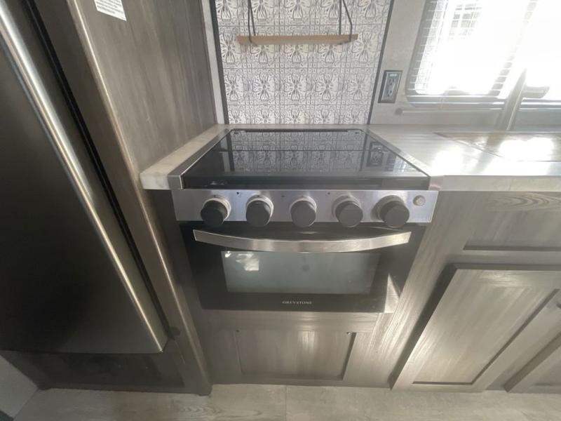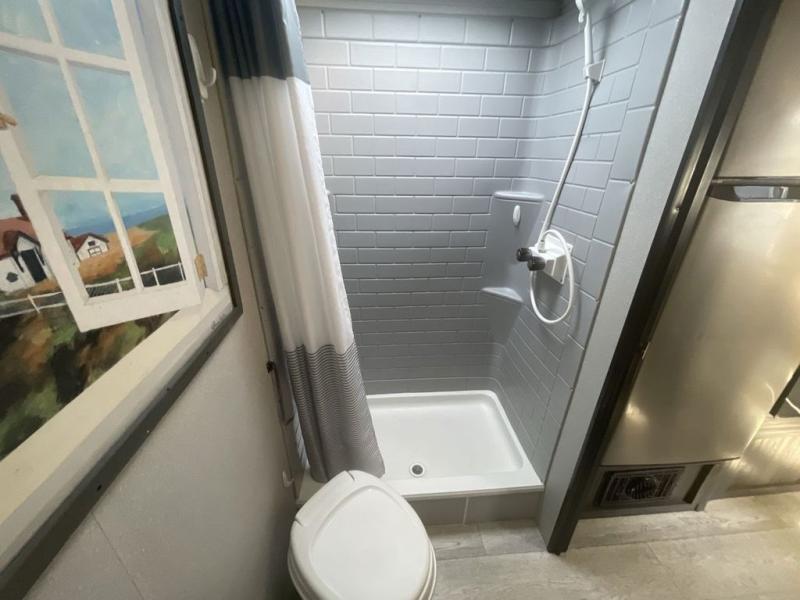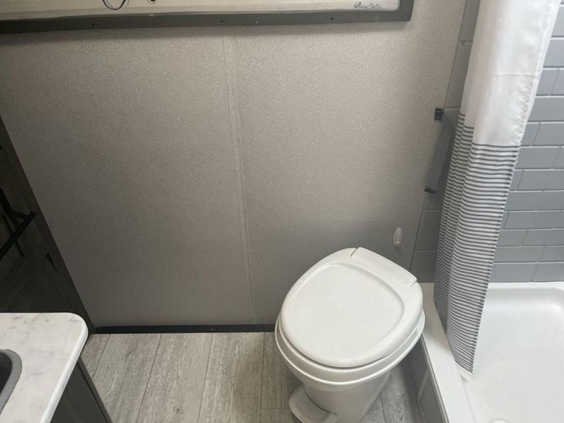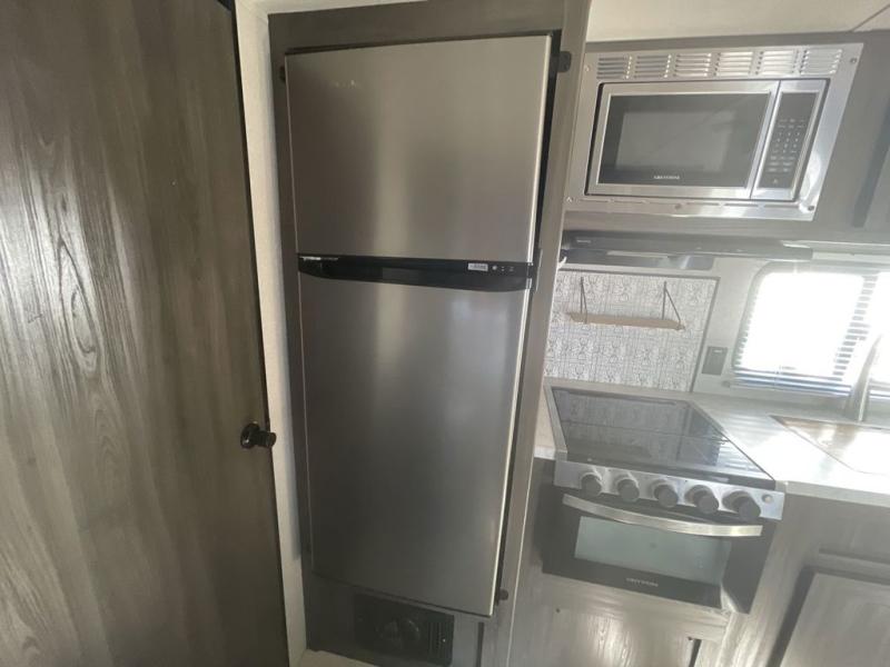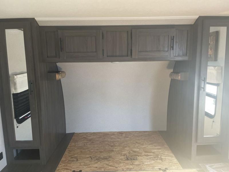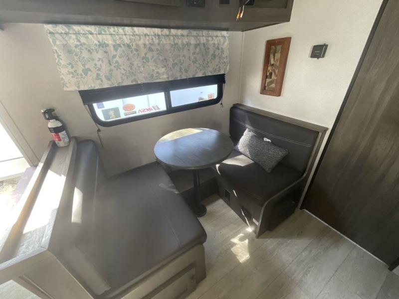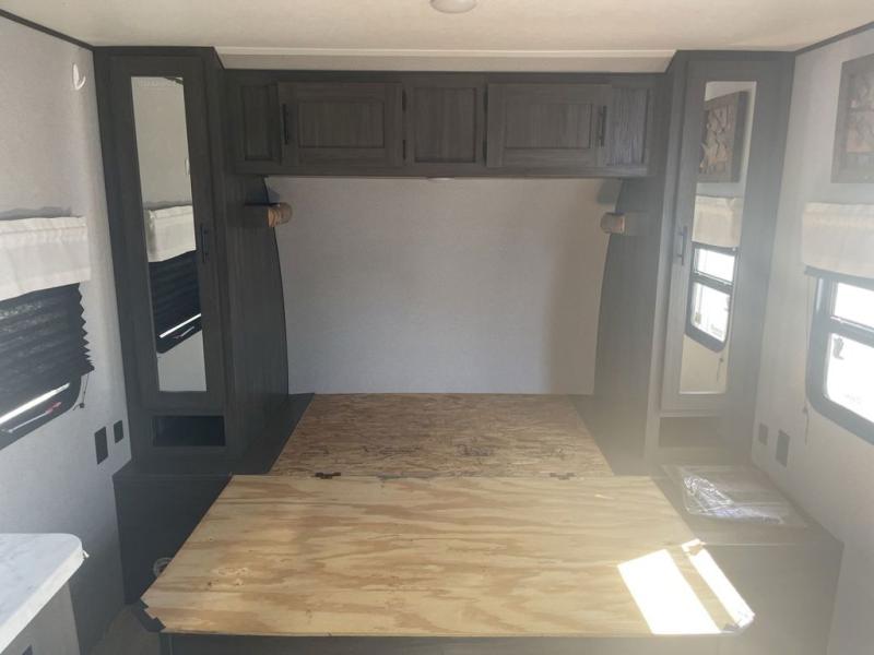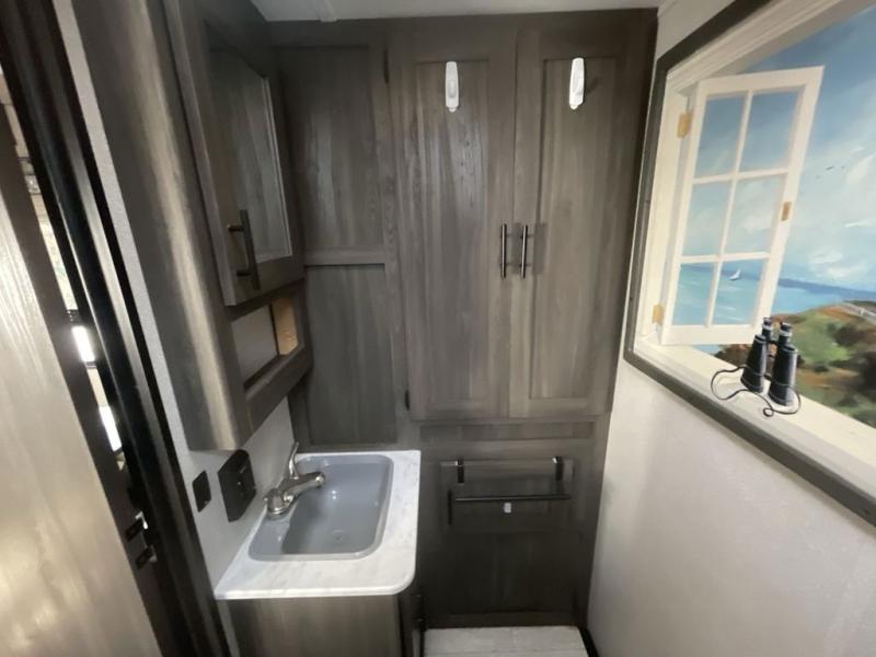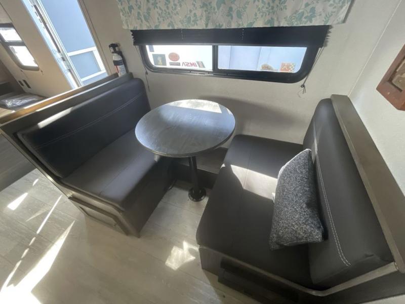 You will stay squeaky clean in the rear full bathroom of this travel trailer! The bathroom has a 24" x 40" shower with a powered roof vent and a large linen closet to store all of your towels. After you have prepared a delicious dinner with the three burner cooktop, you can can head to the booth dinette to enjoy it there and then play a card game. The front 60" x 74" bed has wardrobes on either side to keep your clothes looking their best and an overhead shelf for your convenience!