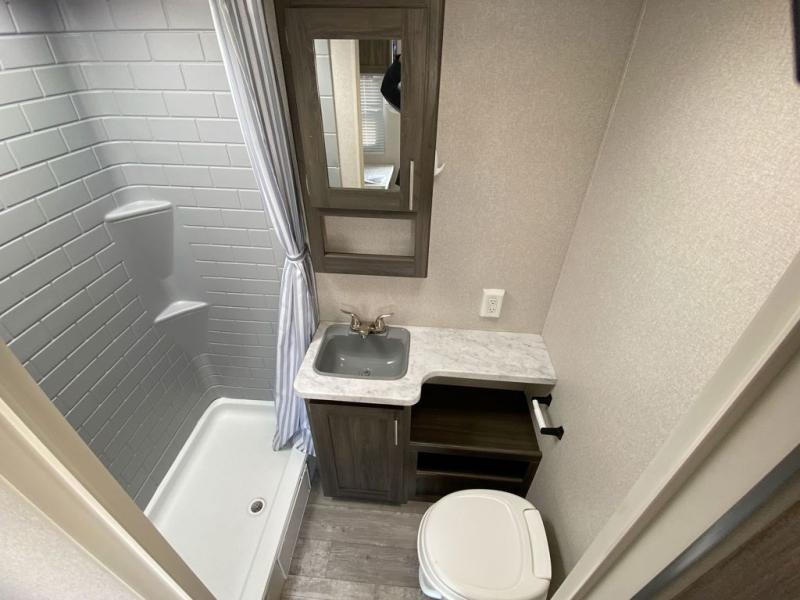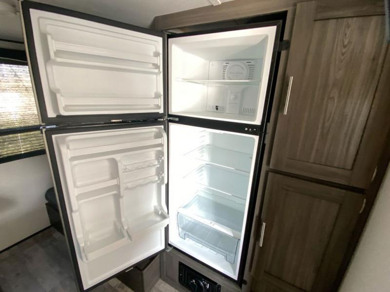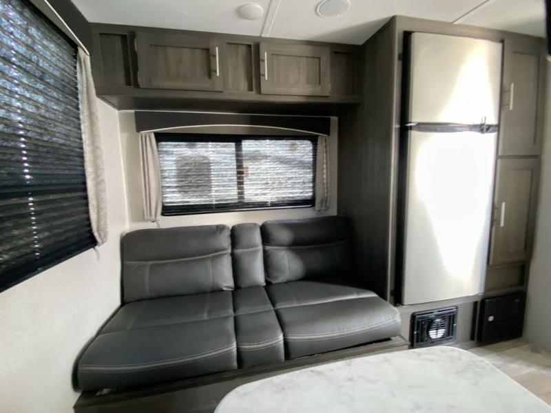 This travel trailer can be your home away from home! Start each morning feeling refreshed after sleeping on the front 60" x 74" bed with wardrobes on either side of it. The full bathroom has a 24" x 40" shower to freshen up in each morning and a powered roof vent to eliminate any unwanted steam. The kitchen pantry is big enough to store your favorite snacks and you can prepare your best meals with the three burner cooktop then enjoy it at the booth dinette which has media overhead. There is also a sofa for you to take an afternoon nap!