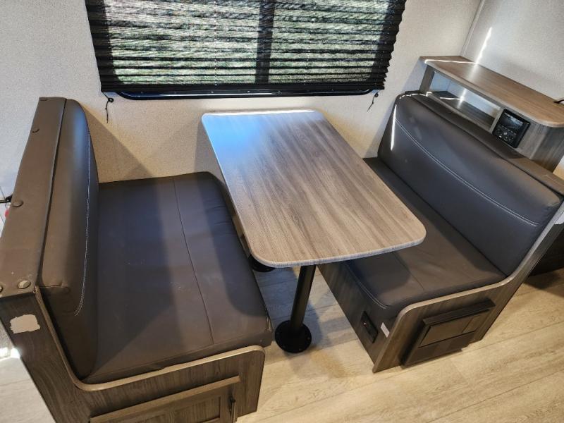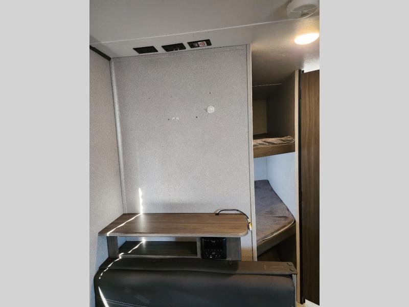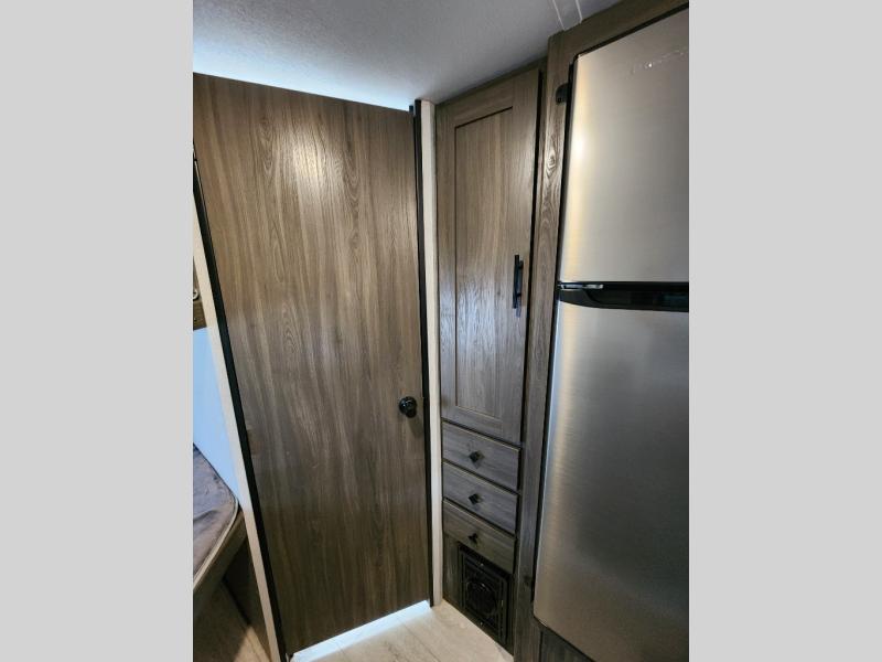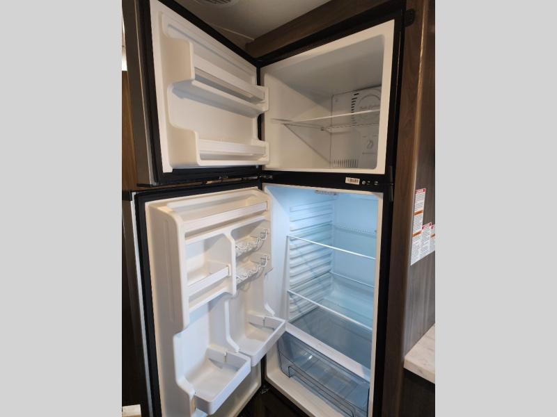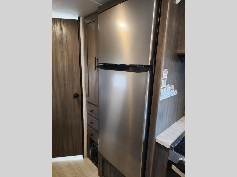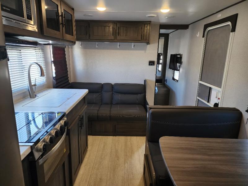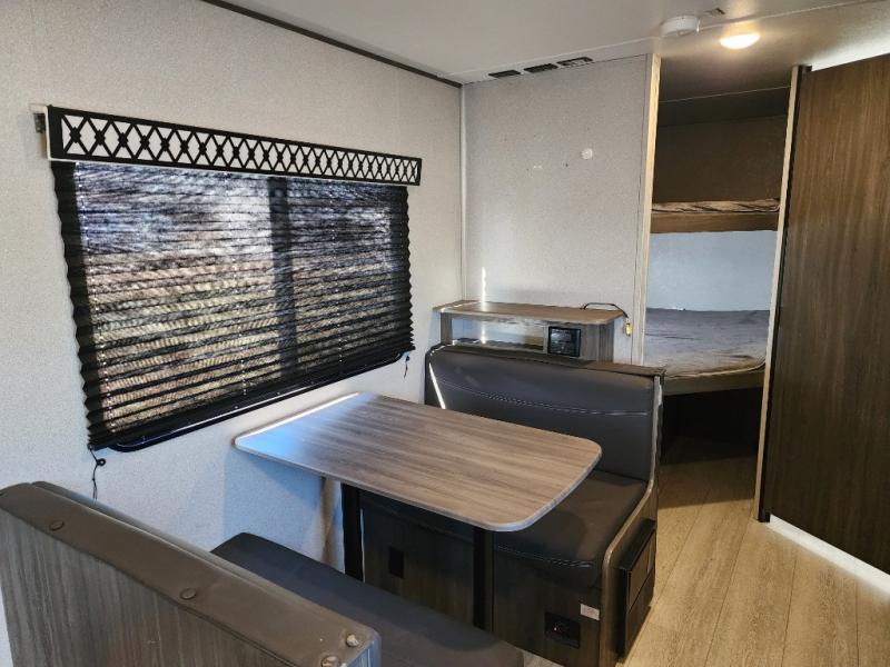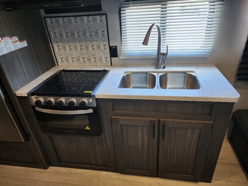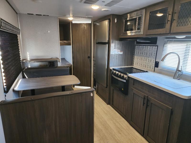 Start each day feeling clean and fresh in this travel trailer! It features a rear corner bathroom with a 24" x 40" shower for you to rinse off in after sleeping on either the 60" x 74" bed in the front private bedroom or the rear corner 48" x 74" bunk beds. The sofa is a great place for an afternoon nap and the booth dinette is great for enjoying your meals or playing a card game, plus there is an entertainment center by it. The kitchen has everything you will need to create home cooked meals including a microwave for those nights when you don't feel like cooking, and you can even choose to add the optional mini outside kitchen which has a metal slide-out countertop, a sink, and a mini 1.7 cu. ft. refrigerator to keep your beverage cold while you're outdoors!