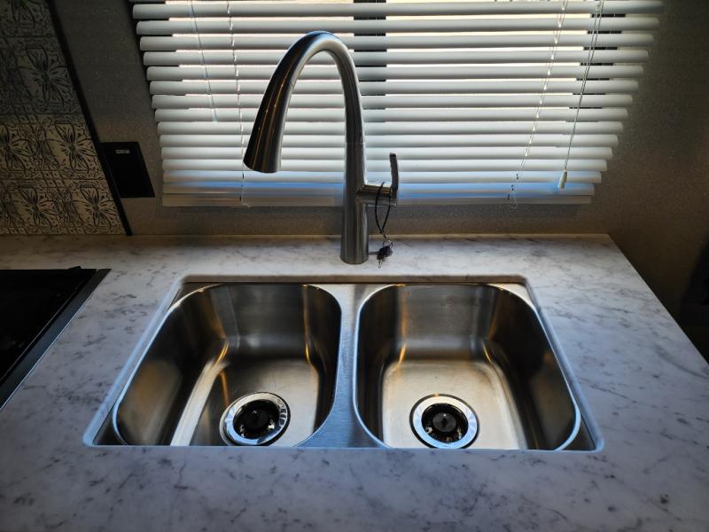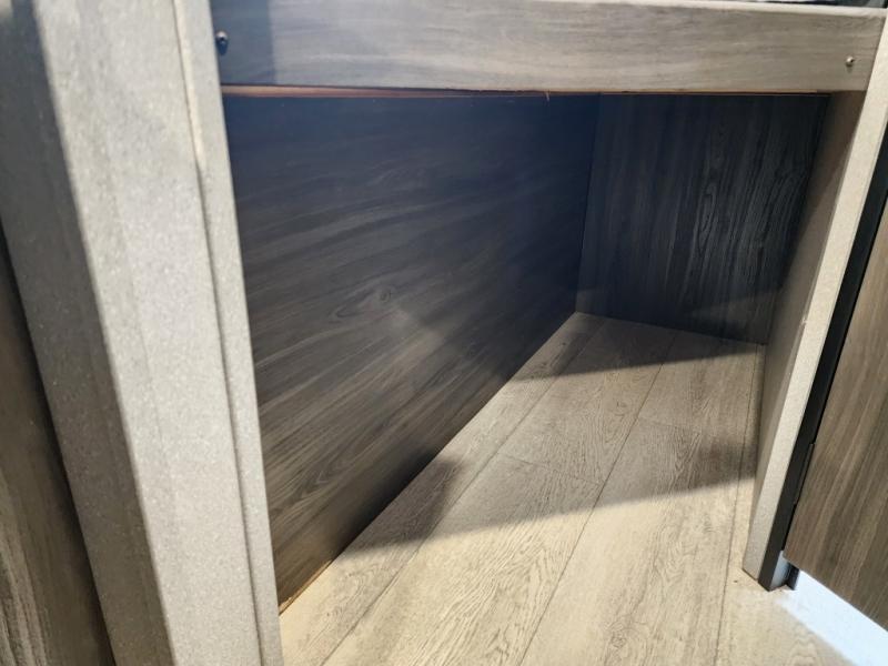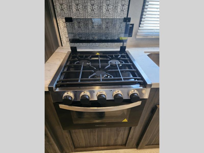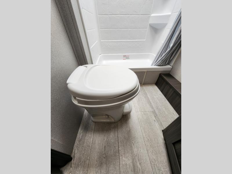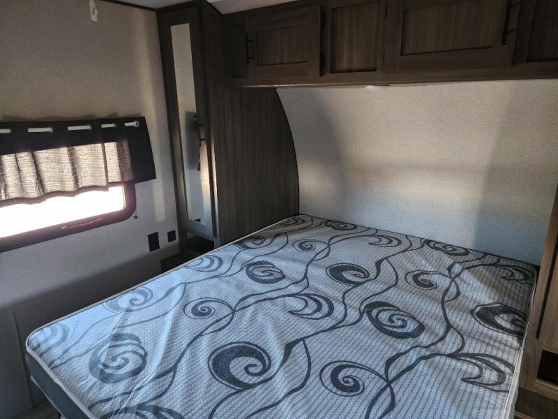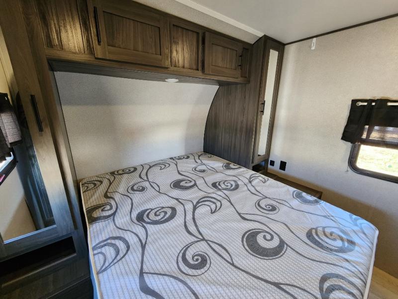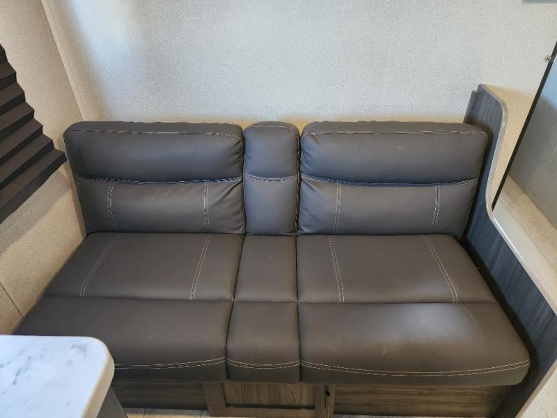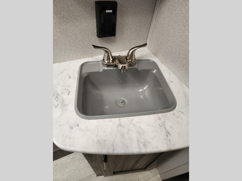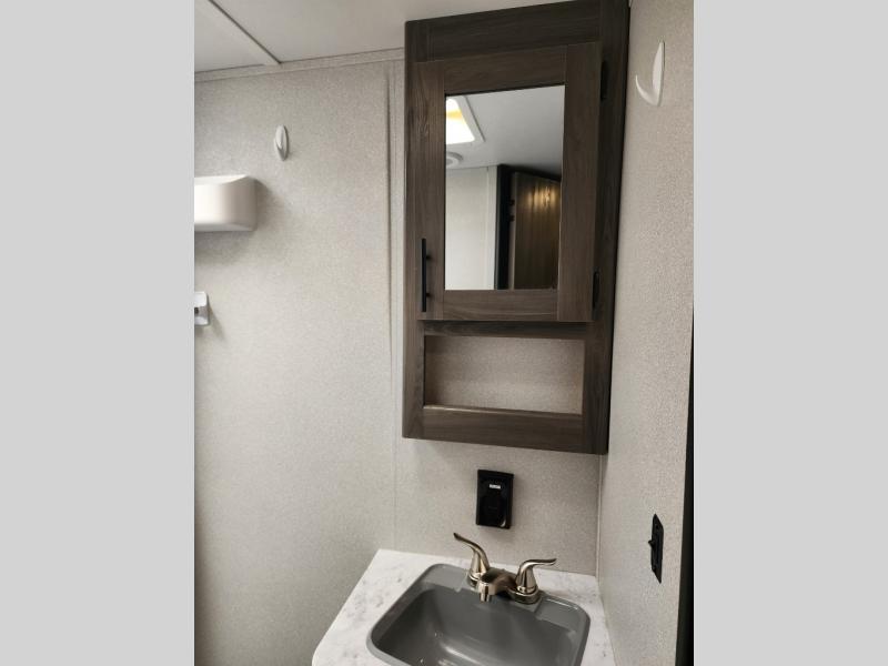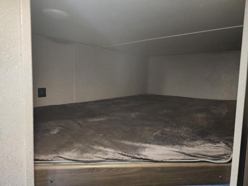 Start each day feeling clean and fresh in this travel trailer! It features a rear corner bathroom with a 24" x 40" shower for you to rinse off in after sleeping on either the 60" x 74" bed in the front private bedroom or the rear corner 48" x 74" bunk beds. The sofa is a great place for an afternoon nap and the booth dinette is great for enjoying your meals or playing a card game, plus there is an entertainment center by it. The kitchen has everything you will need to create home cooked meals including a microwave for those nights when you don't feel like cooking, and you can even choose to add the optional mini outside kitchen which has a metal slide-out countertop, a sink, and a mini 1.7 cu. ft. refrigerator to keep your beverage cold while you're outdoors!