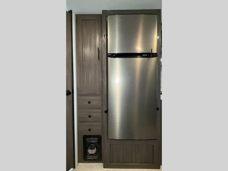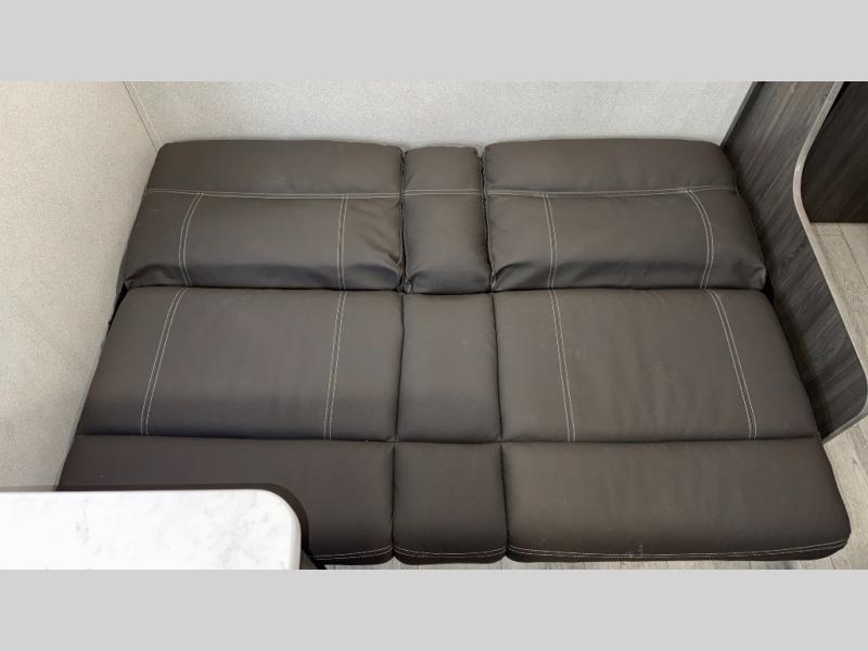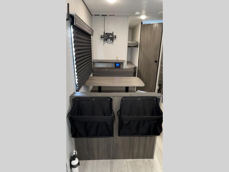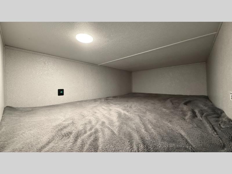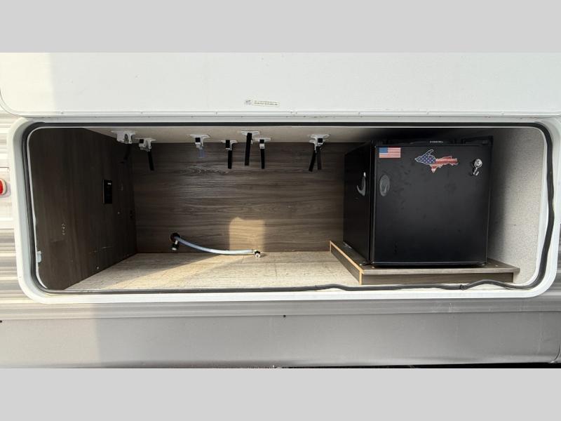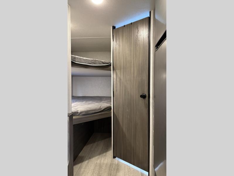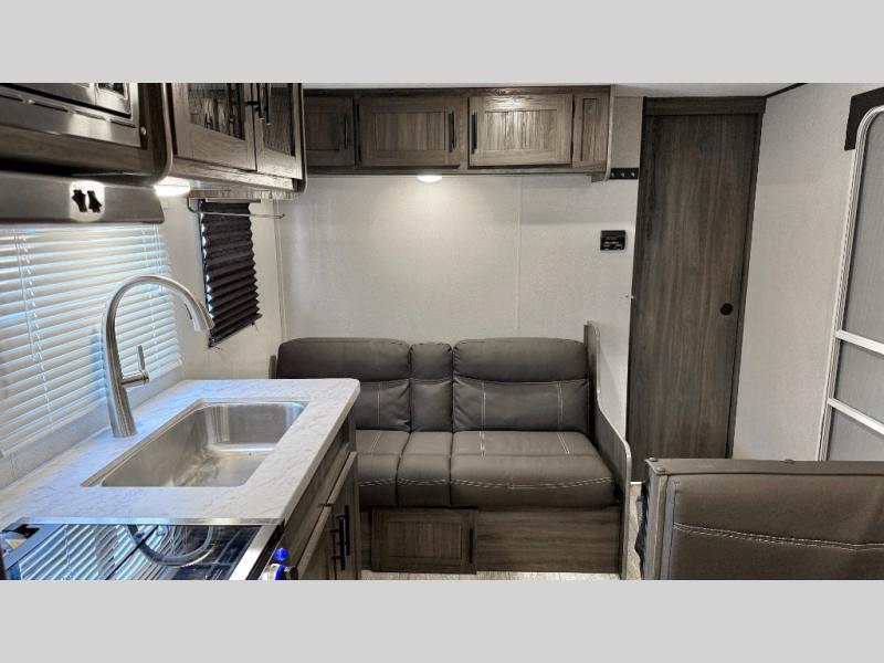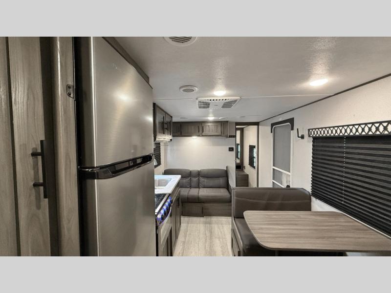 Start each day feeling clean and fresh in this travel trailer! It features a rear corner bathroom with a 24" x 40" shower for you to rinse off in after sleeping on either the 60" x 74" bed in the front private bedroom or the rear corner 48" x 74" bunk beds. The sofa is a great place for an afternoon nap and the booth dinette is great for enjoying your meals or playing a card game, plus there is an entertainment center by it. The kitchen has everything you will need to create home cooked meals including a microwave for those nights when you don't feel like cooking. Outside kitchen with a mini 1.7 cu. ft. refrigerator to keep your beverage cold while you're outdoors!