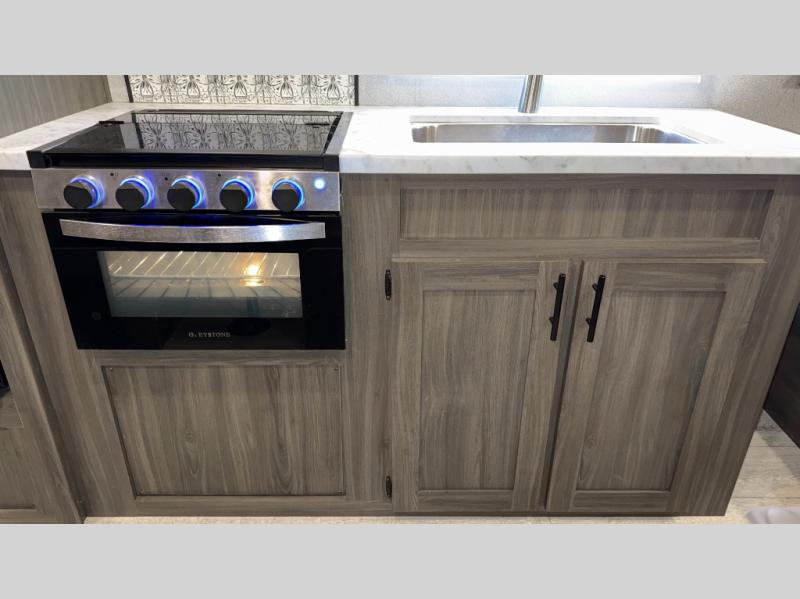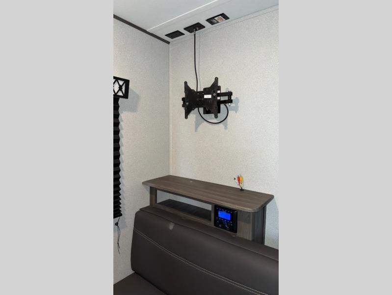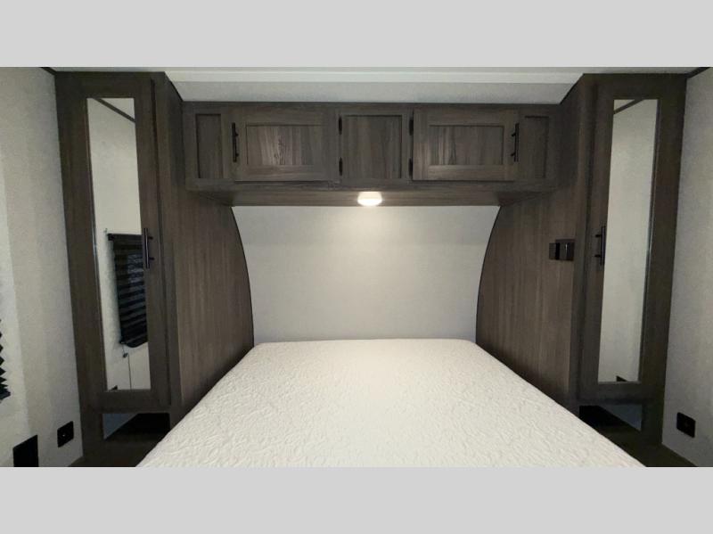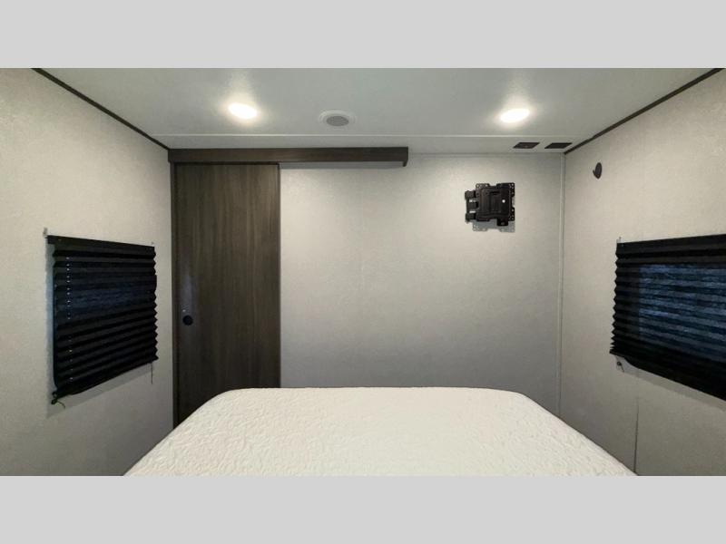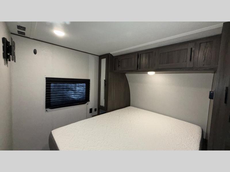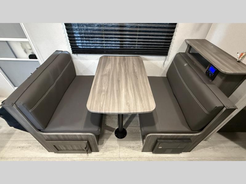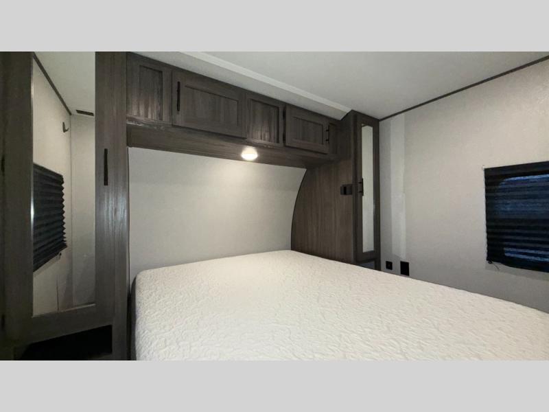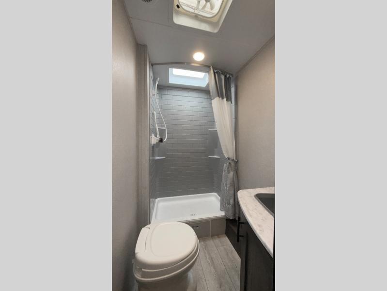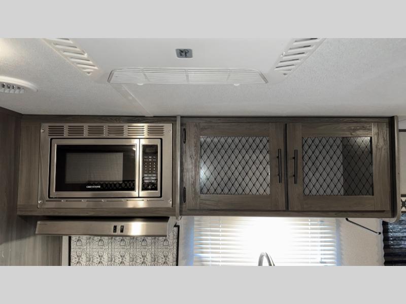 Start each day feeling clean and fresh in this travel trailer! It features a rear corner bathroom with a 24" x 40" shower for you to rinse off in after sleeping on either the 60" x 74" bed in the front private bedroom or the rear corner 48" x 74" bunk beds. The sofa is a great place for an afternoon nap and the booth dinette is great for enjoying your meals or playing a card game, plus there is an entertainment center by it. The kitchen has everything you will need to create home cooked meals including a microwave for those nights when you don't feel like cooking. Outside kitchen with a mini 1.7 cu. ft. refrigerator to keep your beverage cold while you're outdoors!