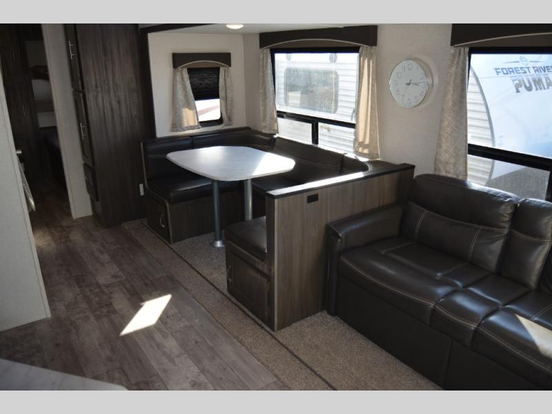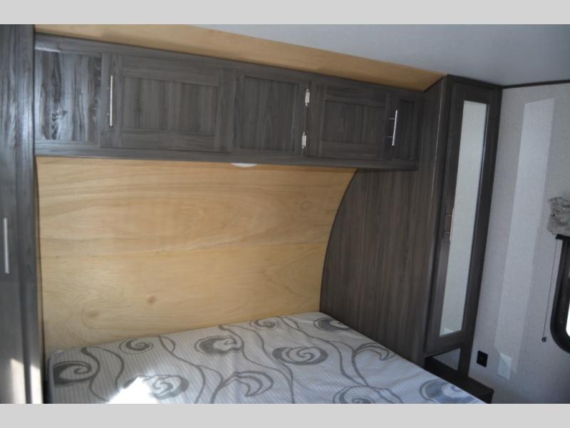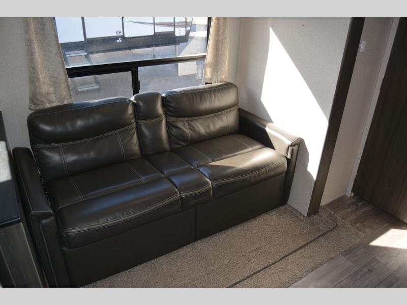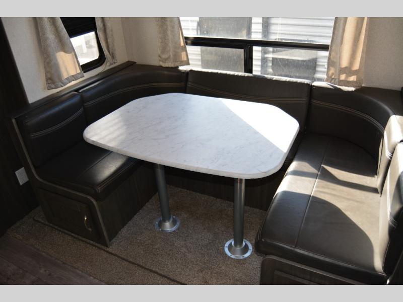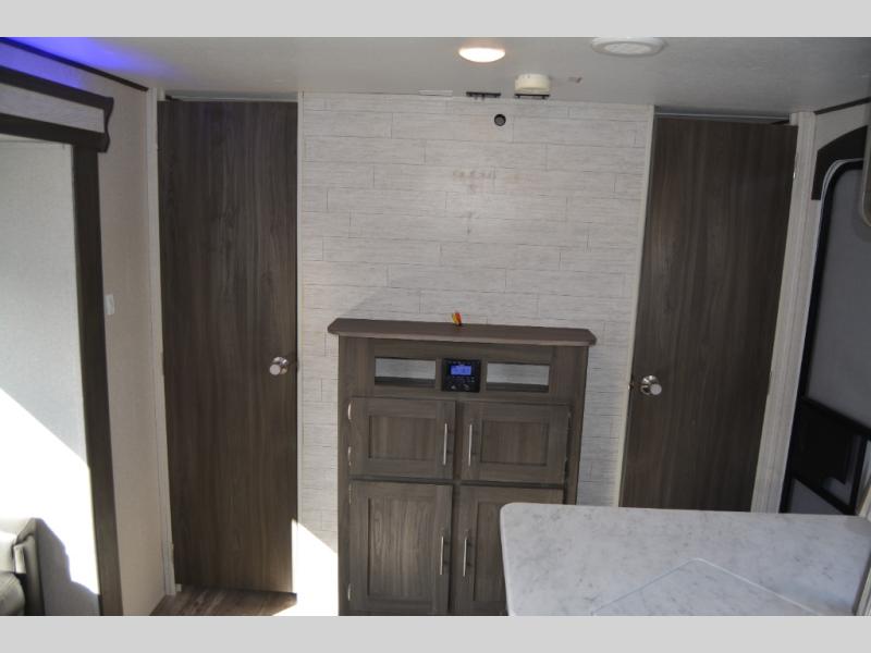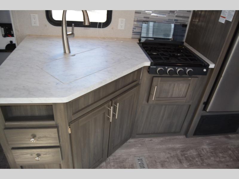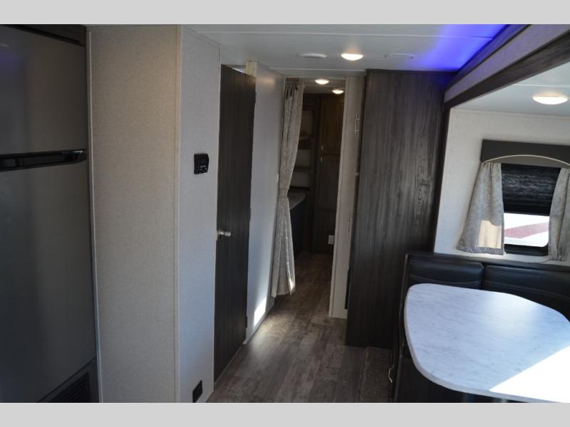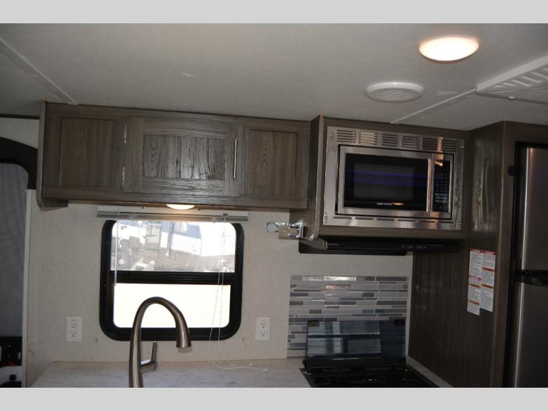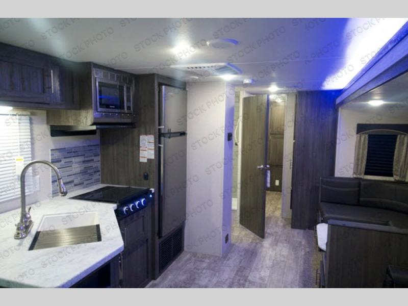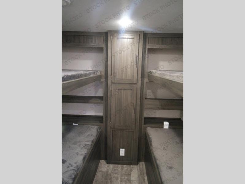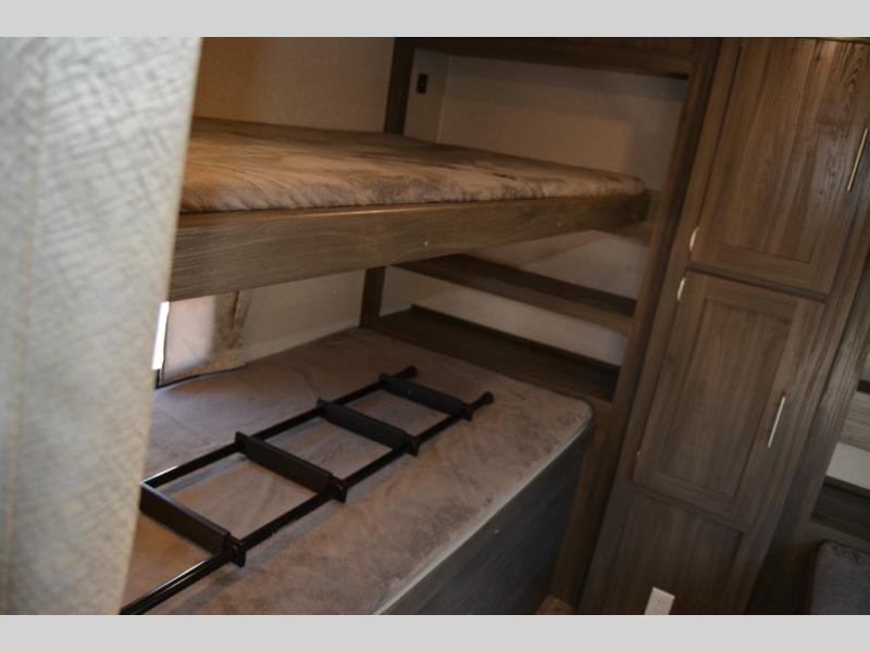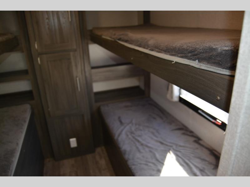 This travel trailer is family friendly! It features a rear private bunkhouse with a set of 26" x 74" bunk beds, a set of 38" x 74" bunk beds, both with storage, and a wardrobe too. Just outside the bunkhouse is the full bathroom and a large pantry to store everyone's favorite snacks. Grab some eggs and bacon from the 10.7 cu. ft. stainless steel refrigerator and fry them up on the three burner cooktop then head to the U-shaped dinette to enjoy them there. You can relax on the sofa near the entertainment center or head to the front private bedroom and change into a fresh pair of clothes that are stored in one of the wardrobes on either side of the 60" x 74" bed!