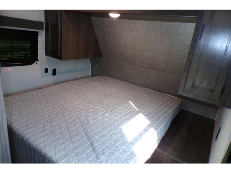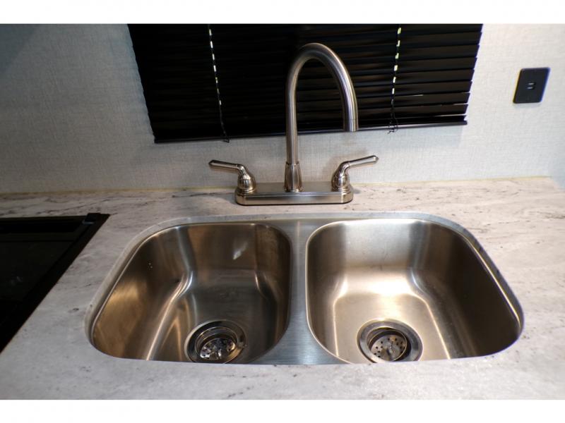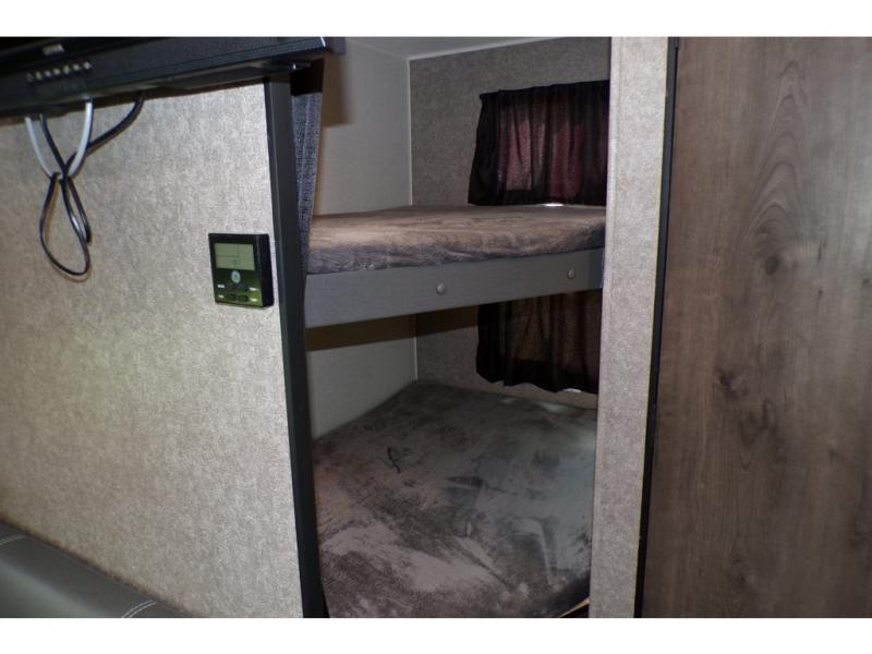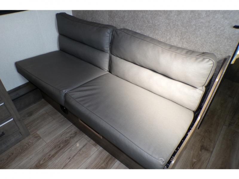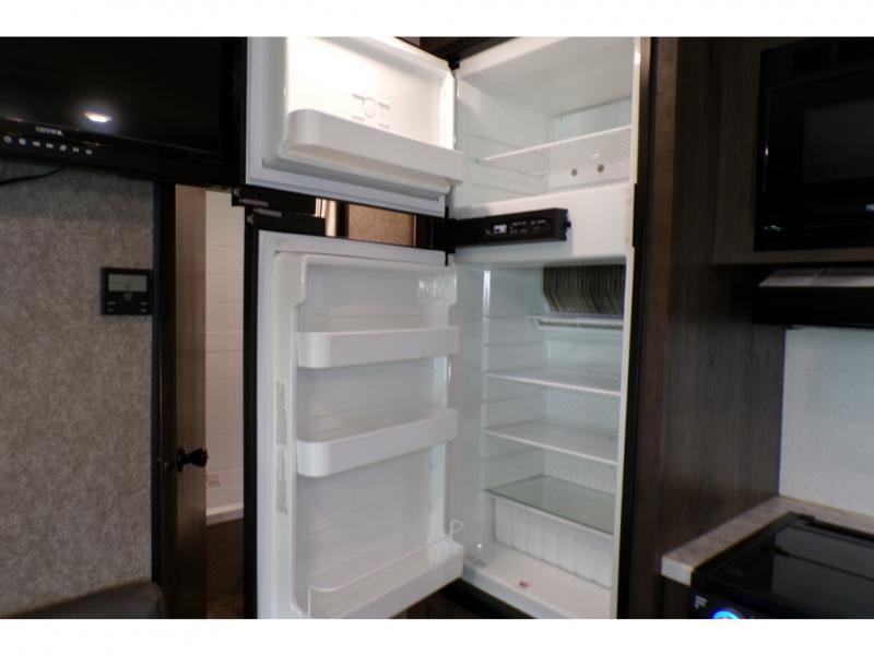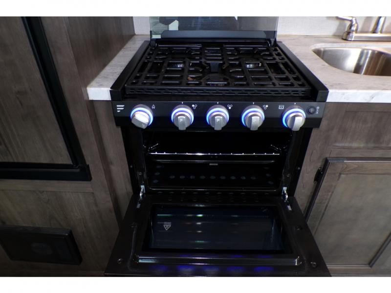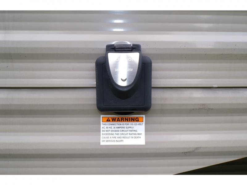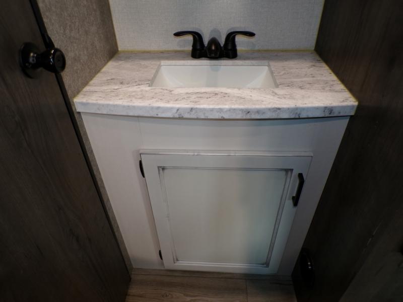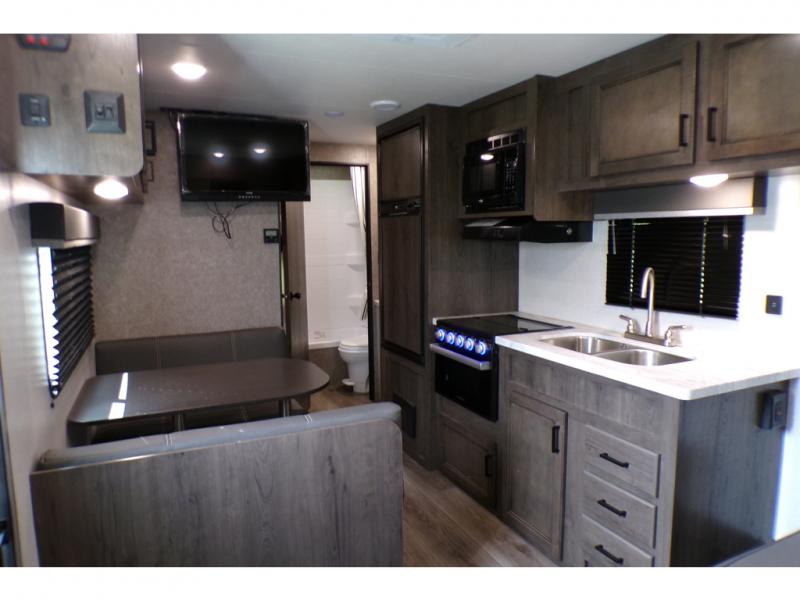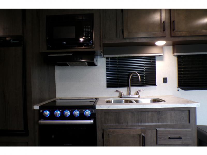 When you walk through this Autumn Ridge travel trailer, you'll notice all of the many different sleeping areas that it has to offer, like a queen-size bed in the front private bedroom, a jackknife sofa and booth dinette in the central living area, and a set of double-size bunks in the back. The private bathroom is conveniently located next to the bunks, and it also offers a bathroom sink just outside the door. It won't be any trouble to create home-cooked meals for you and your family with the three-burner range and 17" oven in the kitchen, and the residential high-rise faucet will make it a simple task to clean up afterwards.