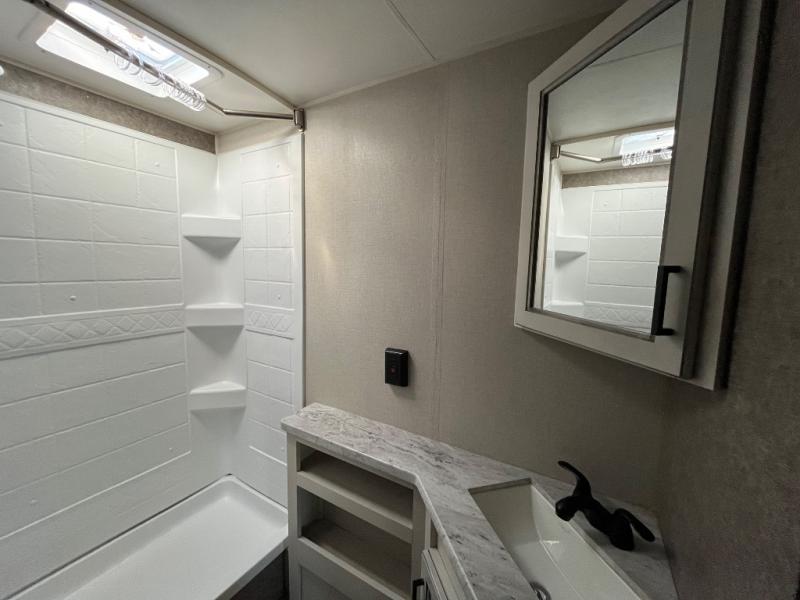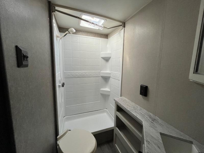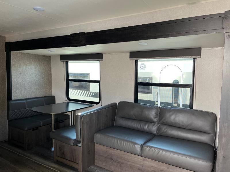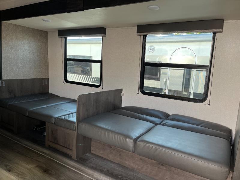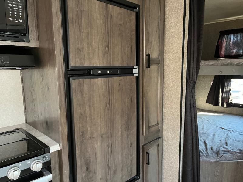 Whether you're relaxing or working hard, you'll appreciate all of the features this Autumn Ridge travel trailer has to offer! Because the full bathroom is located in the back next to the double-size bunks, your kids won't have to go far when they wake up in the middle of the night, and you will appreciate having your own private bedroom in the front of this trailer. You can even enjoy playing cards at the booth dinette or relaxing on the jackknife sofa while you wait for the kids to fall asleep. You might even like to whip up a warm snack in the kitchen or grab something from the pantry. There is plenty of storage inside, and the exterior lighted, oversized pass-through compartment will hold your larger camping items.