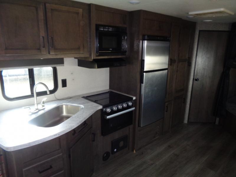 The Starcraft Autumn Ridge travel trailer has been designed just for you! With its forced-air heated and enclosed underbelly, PVC roof membrane, and power awning with LED lights, you can choose to extend your camping season. The Autumn Ridge has flexible LP lines for less corrosion, a Magnum roof system for a fully walkable roof, and tinted safety-glass windows for keeping your interior protected. You will also find an oversized lighted pass-through storage compartment, self-adjusting electric brakes, E-Z Lube axles, and galvanized steel wheel wells. Once you make your way to the interior, you'll appreciate that the Autumn Ridge has no carpet or floor heat registers which makes it kid and pet friendly.