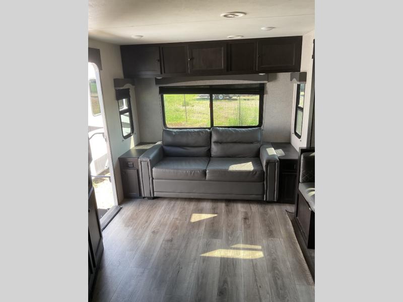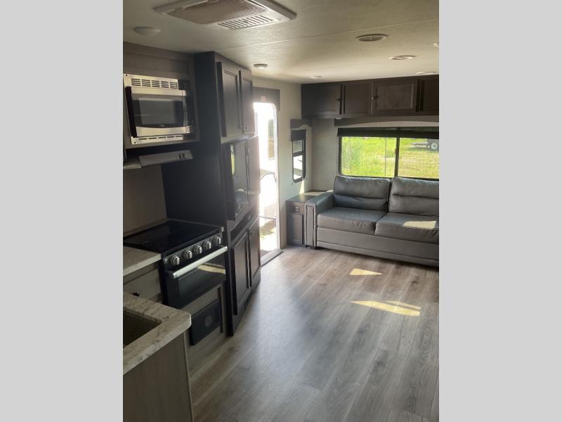 This Super Lite travel trailer with a rear living area and a large slide out will feel just like home. You can enjoy your breakfast around the U-shaped dinette before heading to the lake all day, and you can clean up in the full bath once you return. The chef of the family can prepare meals on the three-burner cooktop, and the leftovers can go in the 8-cu. ft. refrigerator. When it's finally time to call it a night, you'll find the front private bedroom is both spacious and comfortable with its queen bed and private exterior entrance!