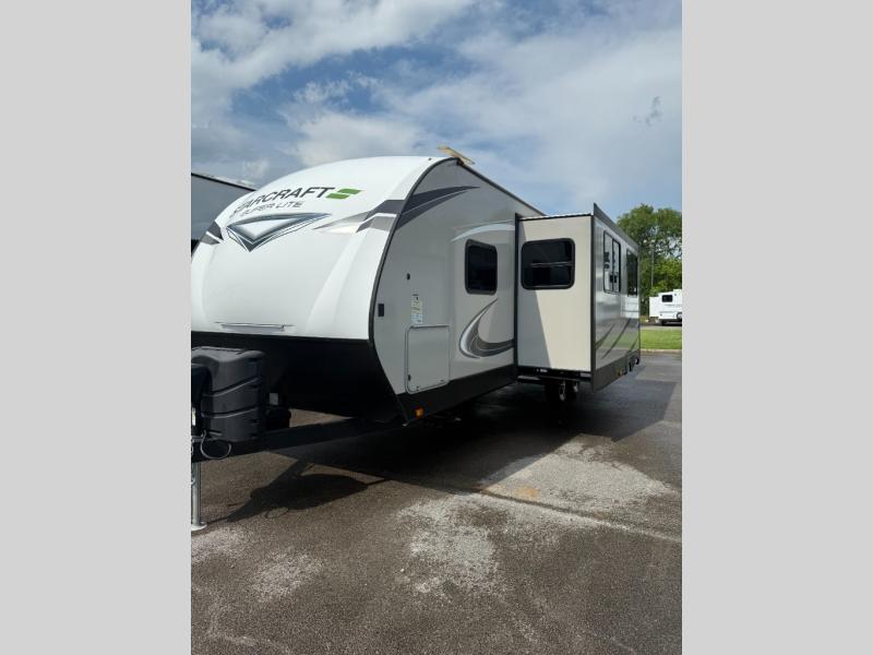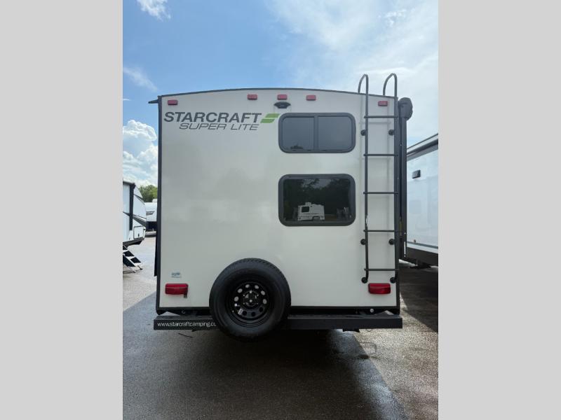 Lightweight, adventurous, and full of amenities, the Starcraft Super Lite travel trailer will allow you to spend more time enjoying your surroundings and less time focusing on anything else. The Super Lite has a fully walkable roof, flexible LP lines for less corrosion, fiberglass insulation, and tinted safety-glass windows. On the exterior, you'll find helpful features, like a lighted, oversized pass-through storage compartment, magnetic baggage door catches, self-adjusting electric brakes, and solid swing-down steps at the main entry. The interior hardwood cabinets and durable residential vinyl flooring provide a great base for the rest of the amenities, and the LED TV with built-in radio and Bluetooth is going to be fabulous for entertaining your group at the end of a long and exhausting day.