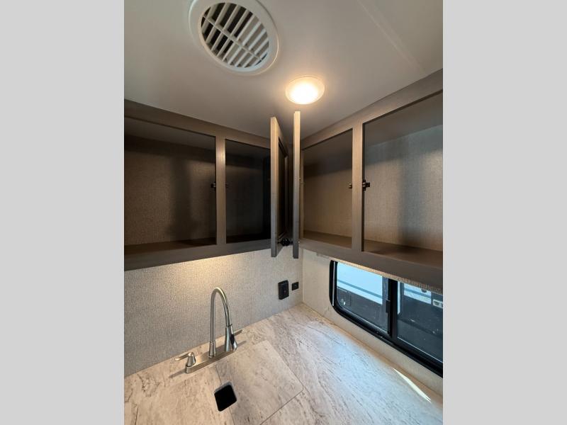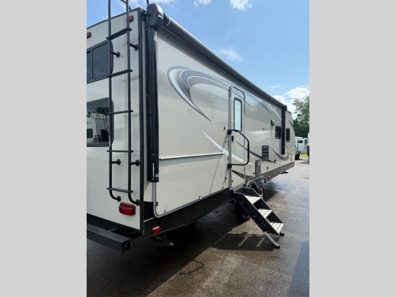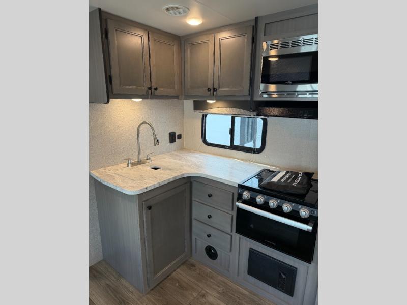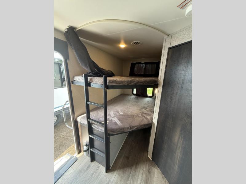 An outside kitchen, double-size bunks, and a large slide out make this Super Lite travel trailer the perfect family unit! Prepare eggs and bacon each morning on the three-burner cooktop or use the microwave for oatmeal before heading outdoors for a bike ride. The rear corner bath with a power vent will stay fresh and ready to use for the next person, and you'll find plenty of storage for all your valuables. When it's time to call it a night, the front private bedroom with a queen bed will provide a great night's rest.