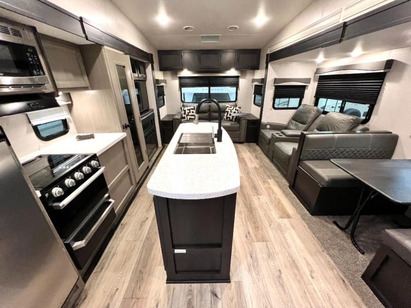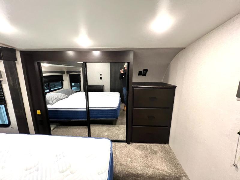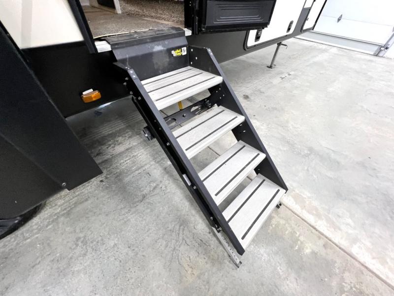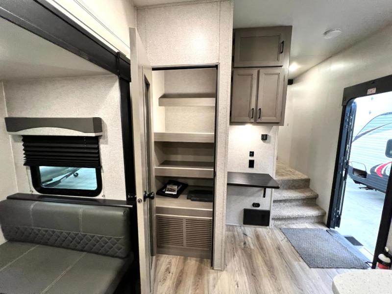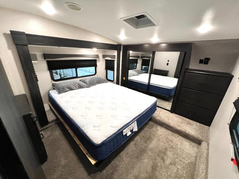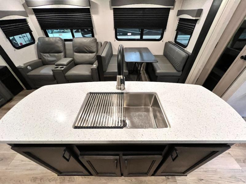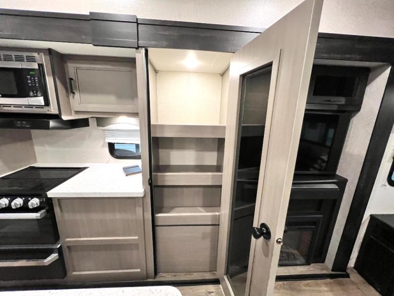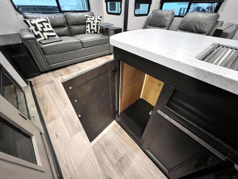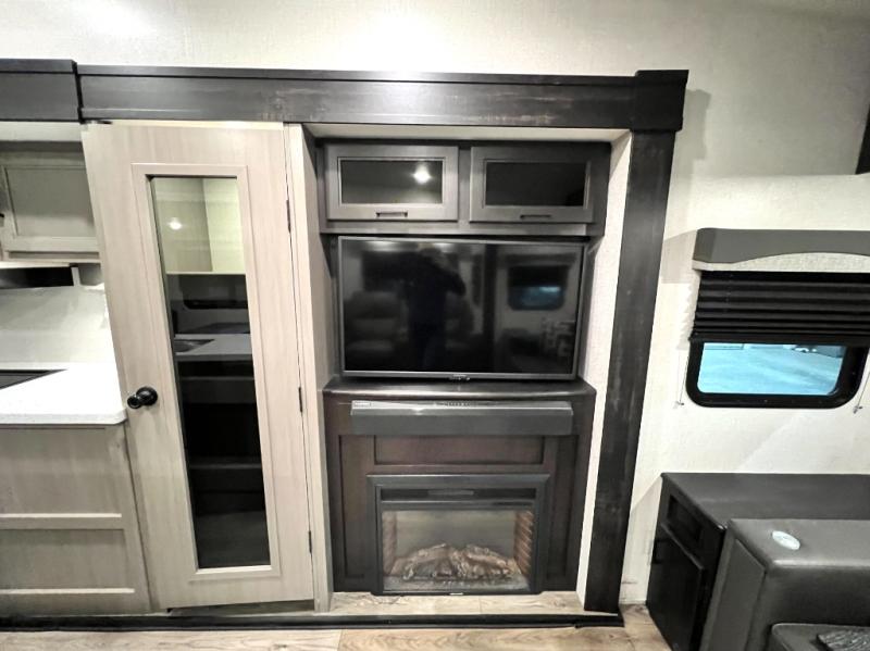 The rear living area includes a tri-fold sofa, plus heated theater seats and a booth dinette slide is near by. Everyone can watch a game on the LED TV and stay cozy by the fireplace. The cook will love the kitchen island, and the slide out with stainless steel appliances giving them everything they need to make any meal. There is even a large pantry that can also be used to add an optional washer and dryer if you choose. The front bedroom offers a queen bed slide out or king bed option, a front mirrored wardrobe, a dresser, and a space savings door. You will find more to enjoy, take a look.