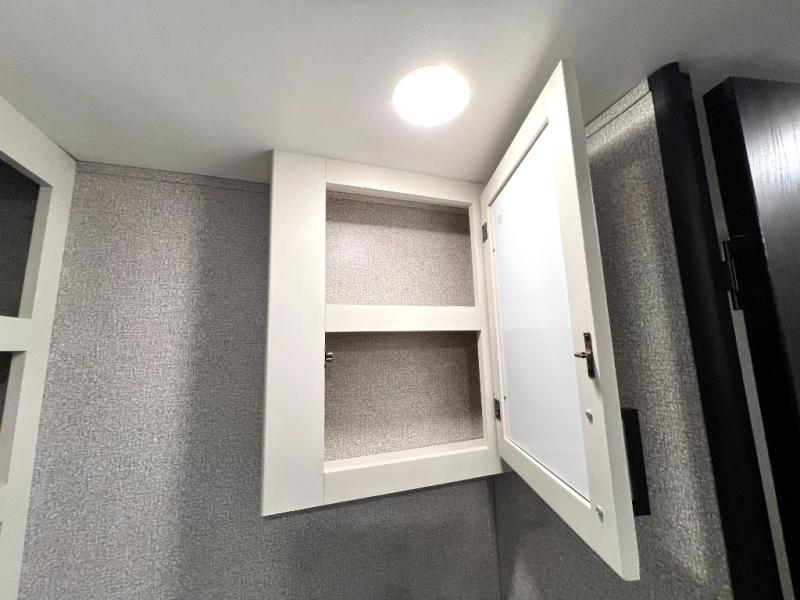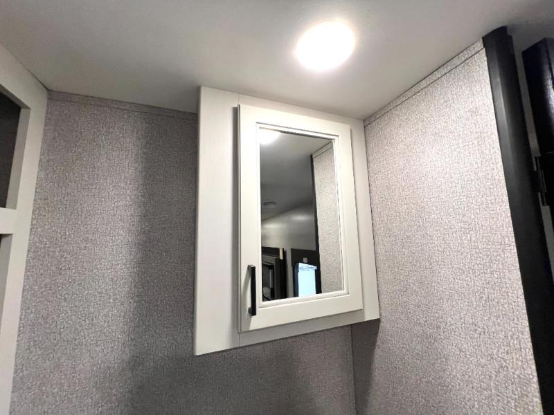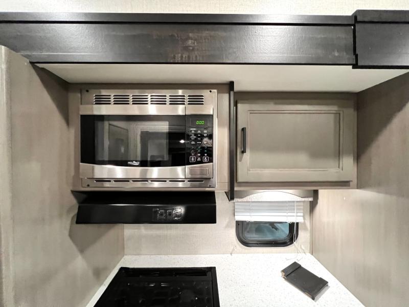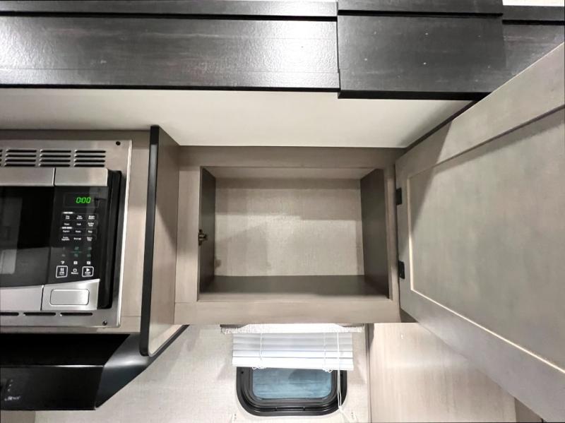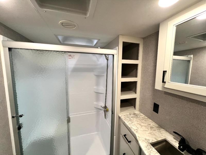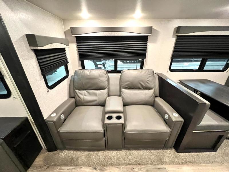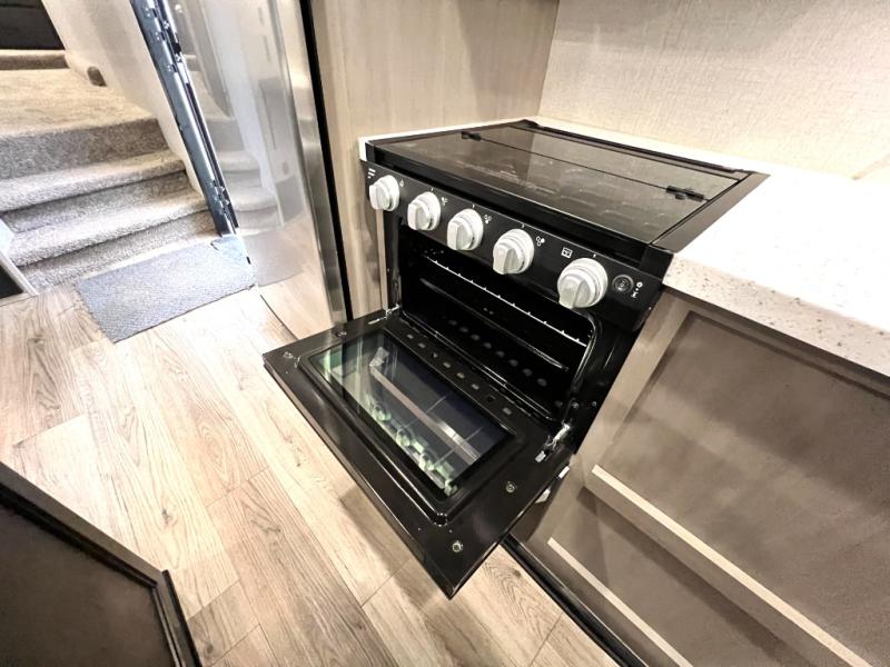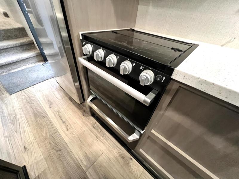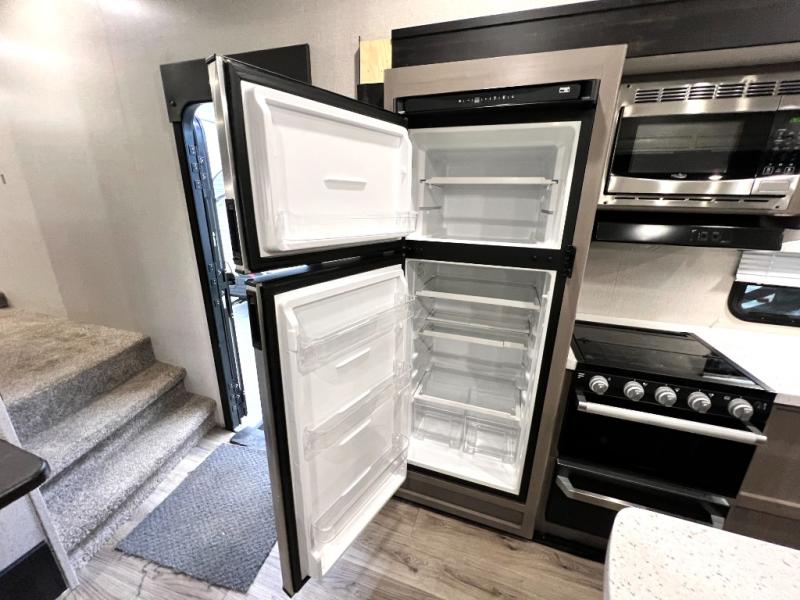 The rear living area includes a tri-fold sofa, plus heated theater seats and a booth dinette slide is near by. Everyone can watch a game on the LED TV and stay cozy by the fireplace. The cook will love the kitchen island, and the slide out with stainless steel appliances giving them everything they need to make any meal. There is even a large pantry that can also be used to add an optional washer and dryer if you choose. The front bedroom offers a queen bed slide out or king bed option, a front mirrored wardrobe, a dresser, and a space savings door. You will find more to enjoy, take a look.