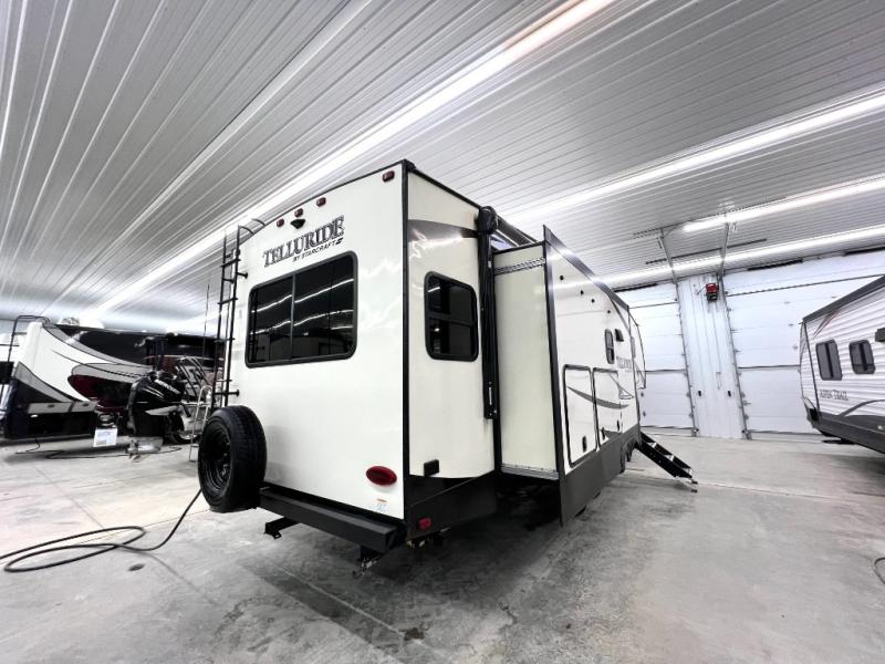 Each Telluride fifth wheel by Starcraft offers TuffShell construction, a PVC roof membrane, an aluminum framed roof, and a Thermal package which includes an insulated, heated and enclosed underbelly with foil insulation in the floor and roof to camp anywhere and any time of year. You will appreciate the sturdy, solid swing-down steps at the main entry, the motion-lit pass-through storage for all your gear, and the Equa-Flex suspension for smooth towing. Each model includes solid surface countertops, stainless steel appliances, hardwood cabinet doors, plus many more interior comforts. Choose the freedom of camping with many at-home essentials with a Telluride today!