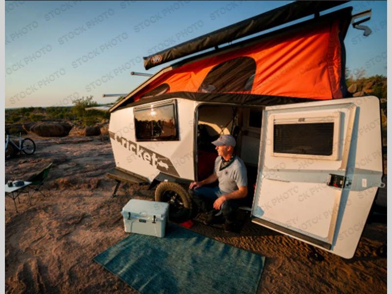 Head out on a new adventure in this Cricket travel trailer. You can store the first-aid kit and dry goods in the storage tower that includes three milk crates, and the under-bed storage will be perfect for your bags. Prepare eggs in the morning on the two-burner cooktop, and you can easily clean up in the sink. There is also a space to add an optional cooler for your perishables. The café table with two facing seats provides a place to enjoy coffee each morning, and the new window that has been added provides more room for the outside breeze to flow in. You can enjoy more fresh air by opening the rear hatch, and the outside shower with hot and cold water will be perfect to wash off your hiking boots.