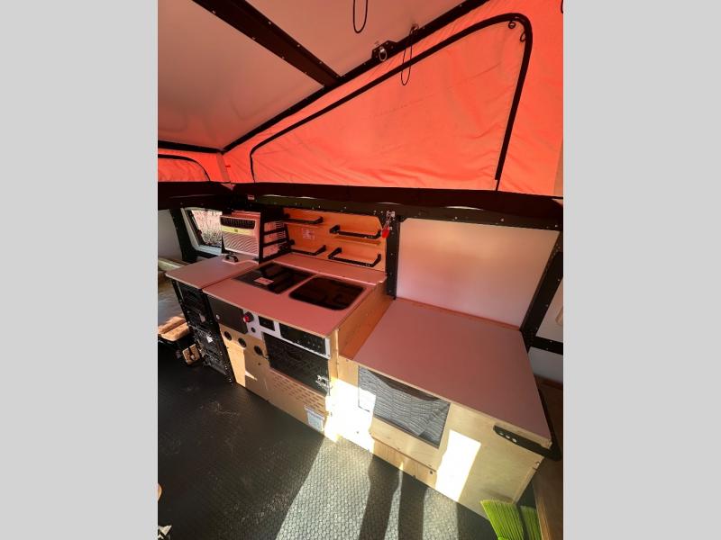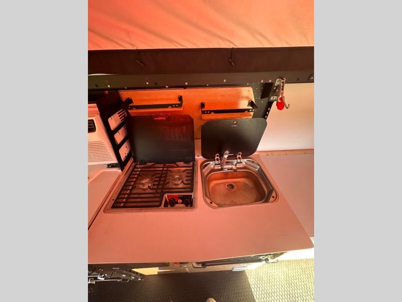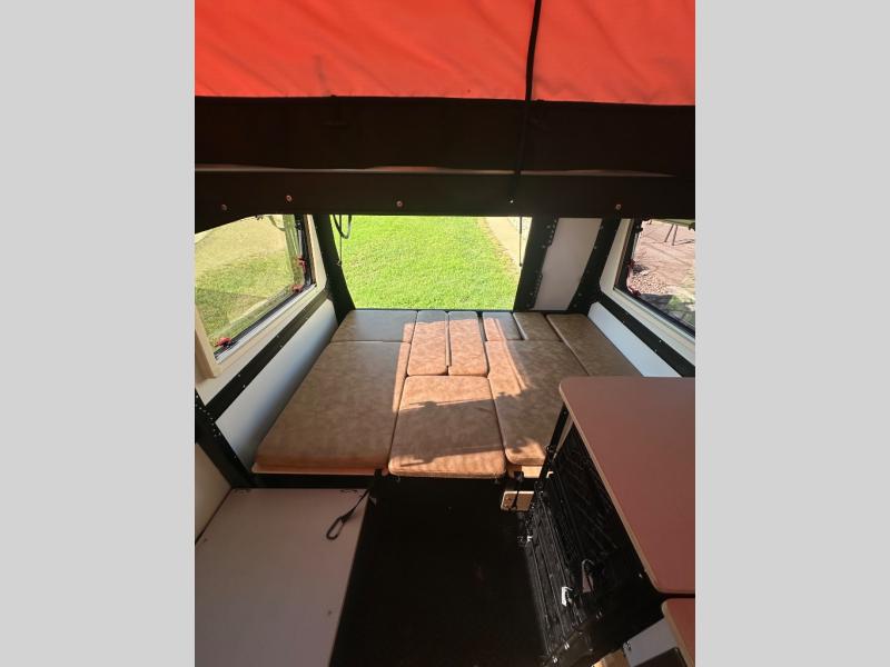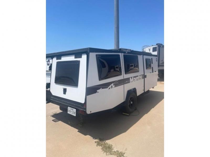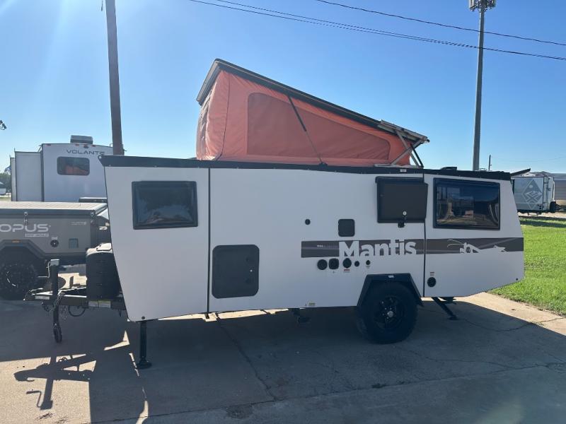 This Mantis travel trailer is perfect for you and your spouse on your next big adventure. You will feel right at home with the full-size bed that includes convenient under-bed storage, and you can invite more friends along by adding the optional folding couch/bunk bed system or the optional rooftop tent. Prepare eggs and bacon on the two-burner stove and easily clean up in the sink. The café table provides a place to dine, or you can enjoy the fresh air outdoors as you sit under the 8' patio awning. This model includes many convenient features, such as a 16-gallon trash can, a rear hatch for access and ventilation, and a storage tower with three milk crates for snacks, flashlights, and the first-aid kit! You can even choose to add the optional wet bath with a cassette toilet and a shower to stay clean throughout your whole trip!