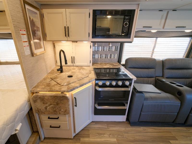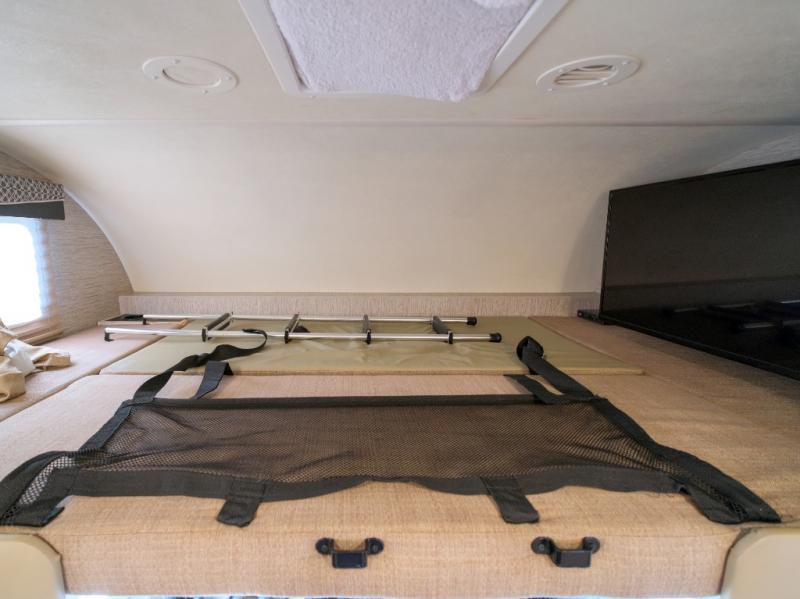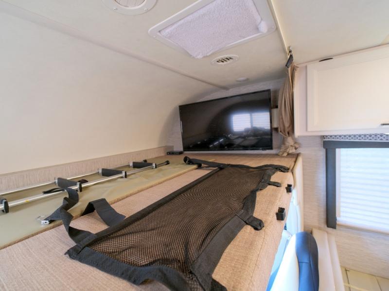 Your family will look forward to traveling in this Four Winds Class C gas motorhome every time you pack up and head to your favorite state park. The kids will love the bunk over the cab with a 39" TV on a swivel so that they can watch cartoons in the morning. The 71" Dream Dinette can comfortably seat your whole family for dinner, and after your meal, you can relax on the theater seats. This unit features a flip-up countertop that provides extra counter space when prepping meals, and you will love the three-burner cooktop for grilling up some burgers and the pantry for storing dry goods. After you've been driving all day, you'll appreciate the RV king bed in the rear bedroom.